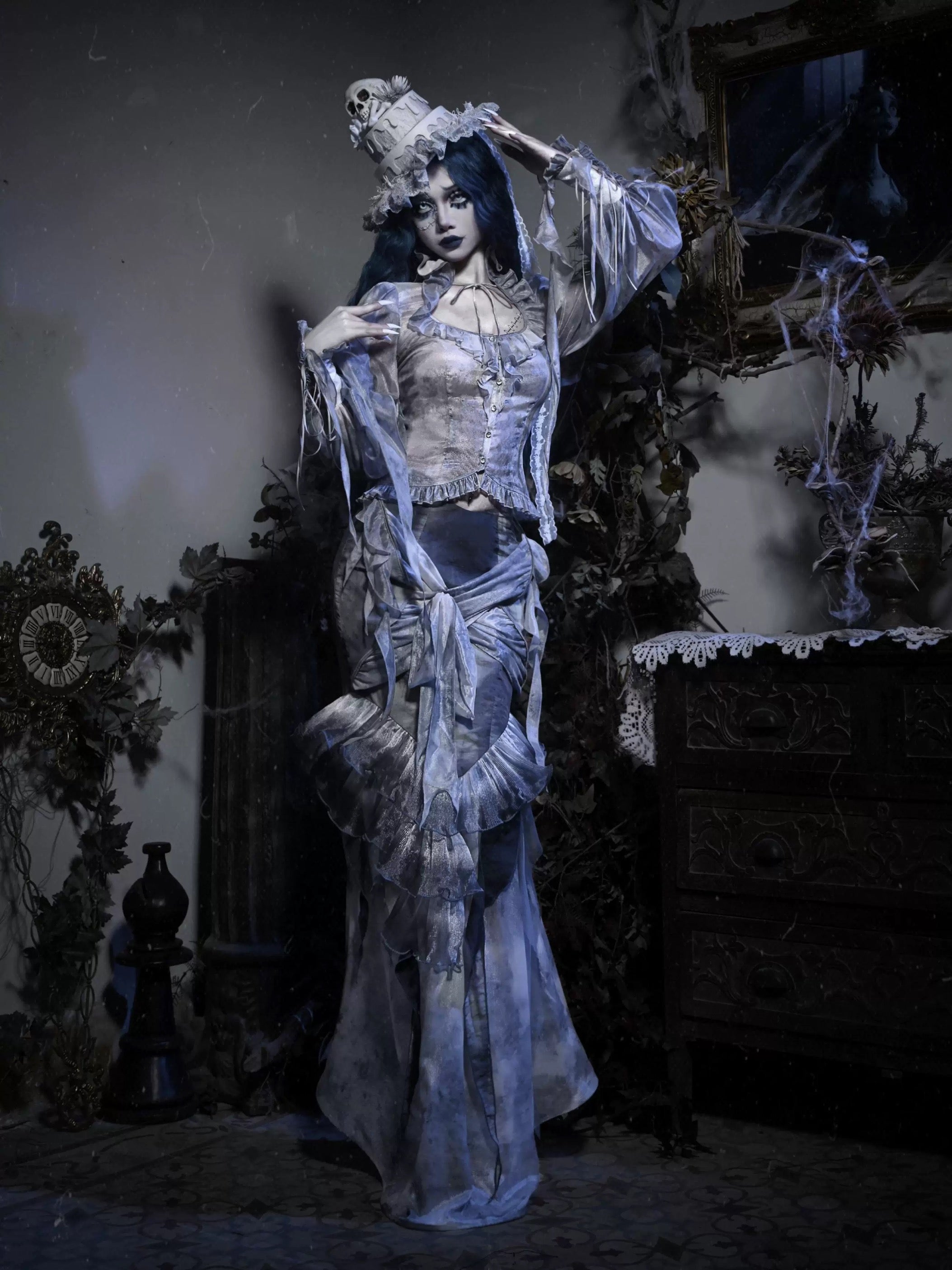 デザイナーは、魅力をさらに高めるために特別な装飾を施しました。片側には、肋骨のように上向きに伸びる青いレースが、独特の不気味さと美しさを醸し出しています。下半身には、ヴィクトリア朝様式のクリノリンスカートと、レーストリムのブルマーがセットされています。ボリュームのある白いメッシュのオーバーレイと刺繍の花柄のアクセントが、このルックを完成させます。ハイローの裾は脚を美しく見せ、様々な身長にマッチします。