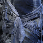 特注の白から青へのグラデーションレースがV字ネックラインを彩り、官能性とエレガンスを融合させています。アシンメトリーなデザインは、大胆な白と青のトーンのコントラストで、生と死の世界の衝突を象徴しています。