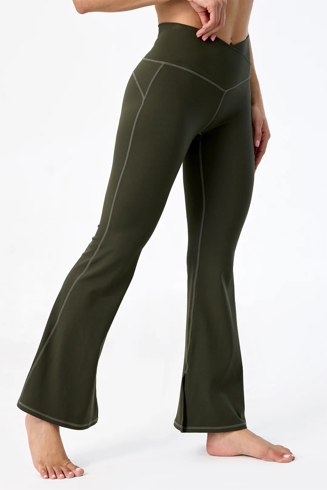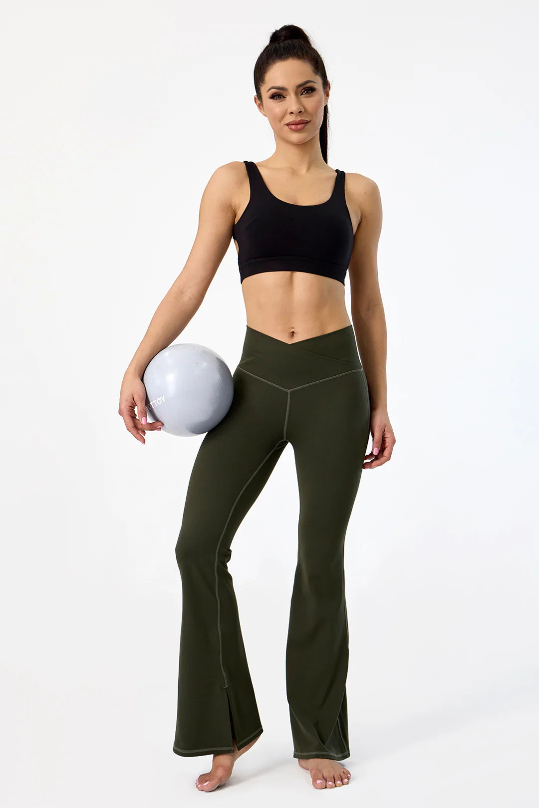 フロントのユニークなクロスオーバーウエストがウエストラインを強調し、美しいシルエットを演出します。裾がスリットになったフレアパンツがスタイリッシュな印象で、他のレギンスとは一線を画す一枚です。吸汗速乾性と通気性に優れた素材で、ドライで快適な着心地をキープ。激しいワークアウトにも、普段着にも最適です。