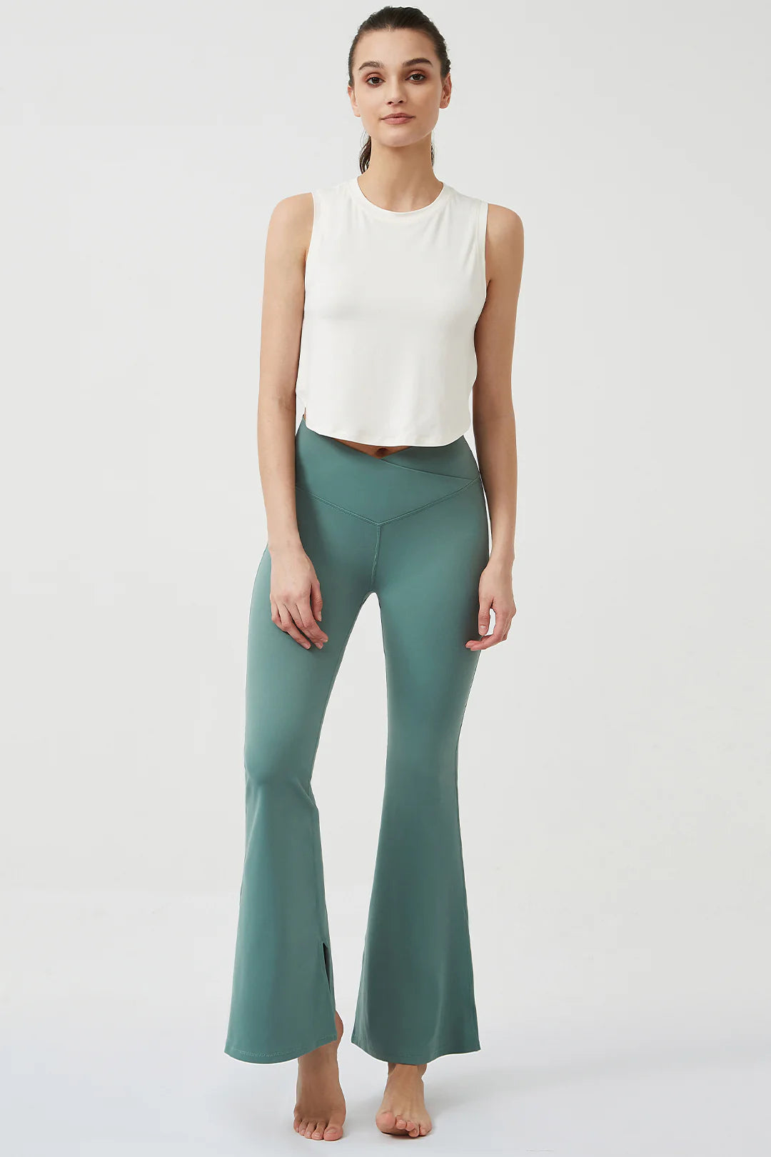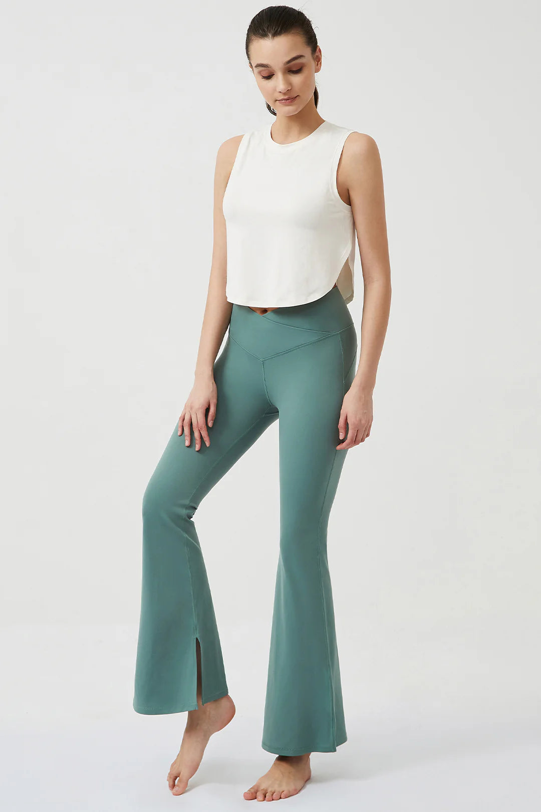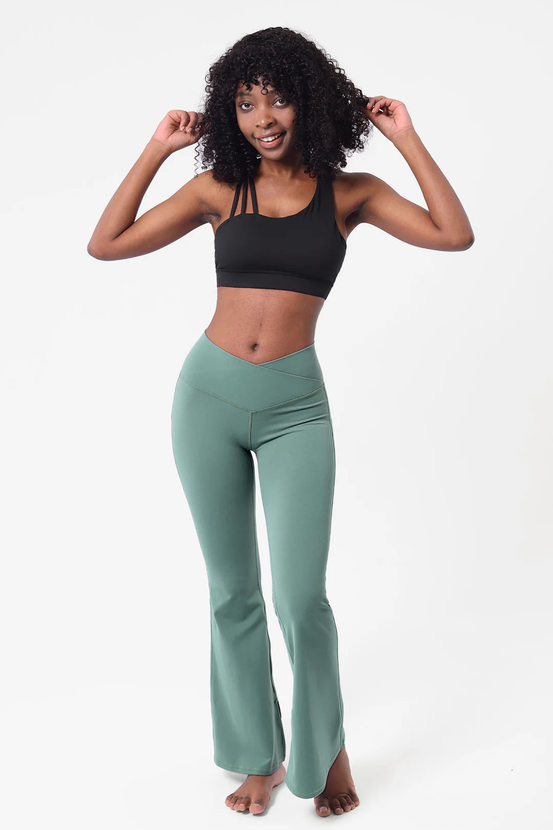 フロントのユニークなクロスオーバーウエストがウエストラインを強調し、美しいシルエットを演出します。裾がスリットになったフレアパンツがスタイリッシュな印象で、他のレギンスとは一線を画す一枚です。吸汗速乾性と通気性に優れた素材で、ドライで快適な着心地をキープ。激しいワークアウトにも、普段着にも最適です。