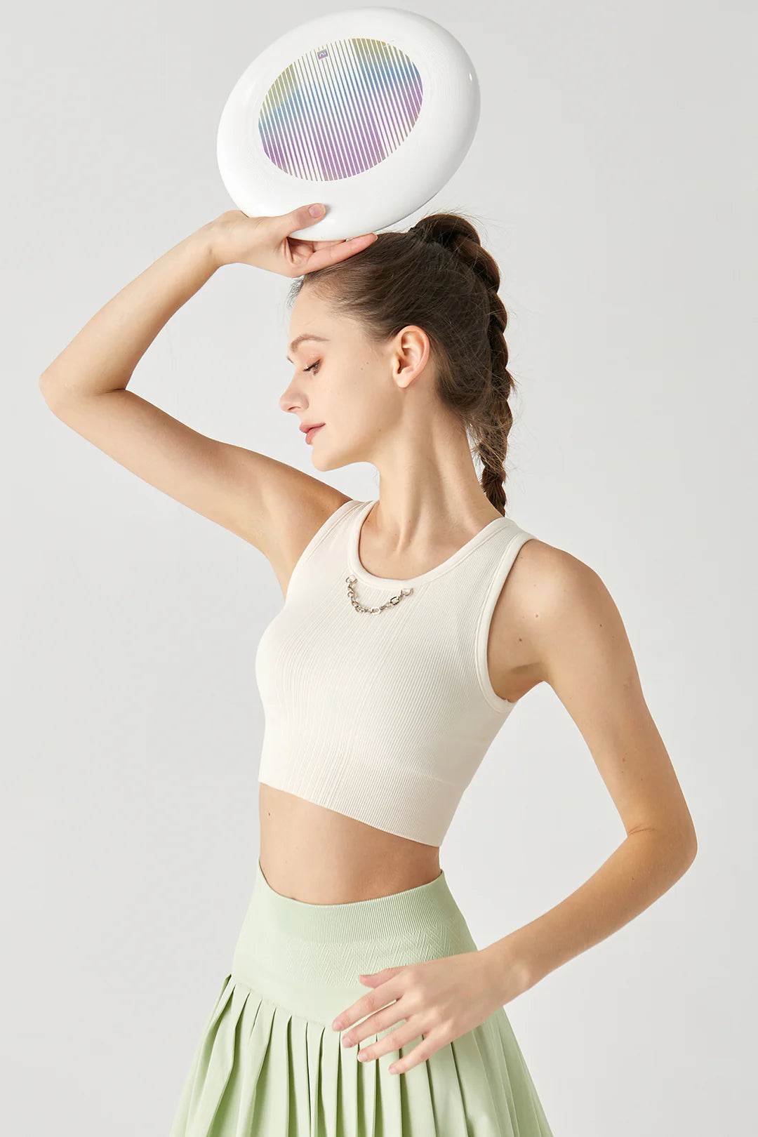 内蔵カップが最適なサポート力とシェイプを提供し、安心感と自信をお届けします。フロントカラーの装飾チェーンがエレガントな雰囲気を添え、機能性とファッション性を兼ね備えたブラです。ジム、ランニング、ヨガなど、どんなシーンでも動きに合わせて柔らかくしなやかなフィット感を提供します。