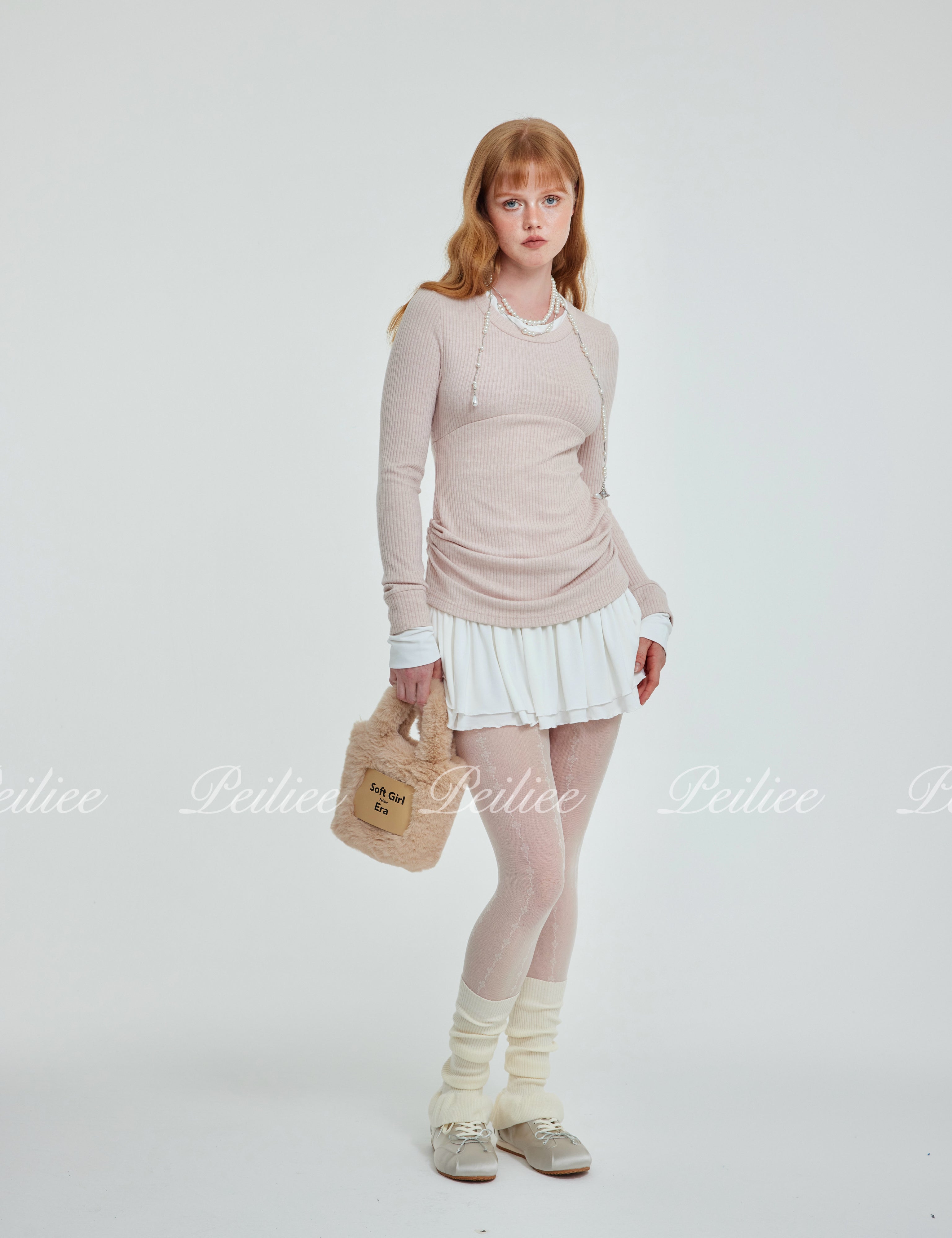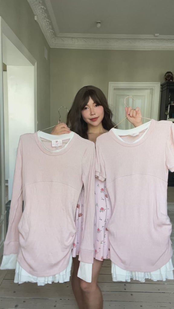 Girl wearing a pink peiliee design cottonn babydoll top and white skirt holding a plush bunny.