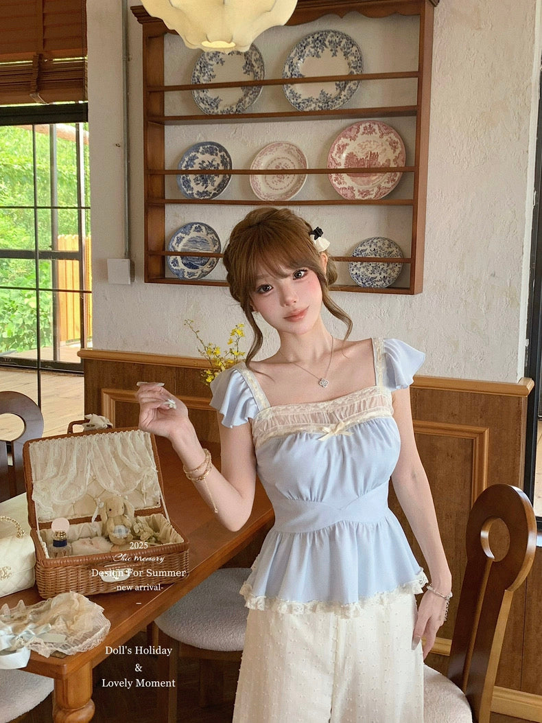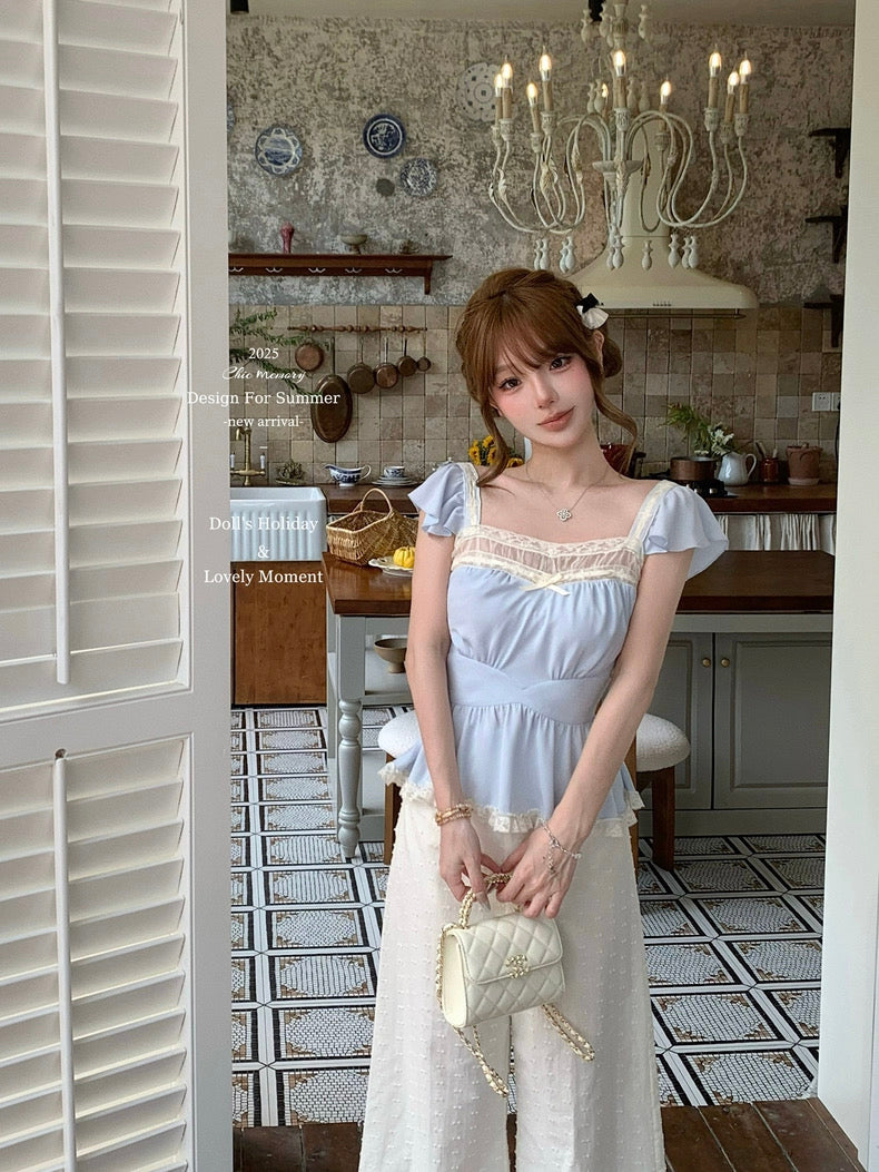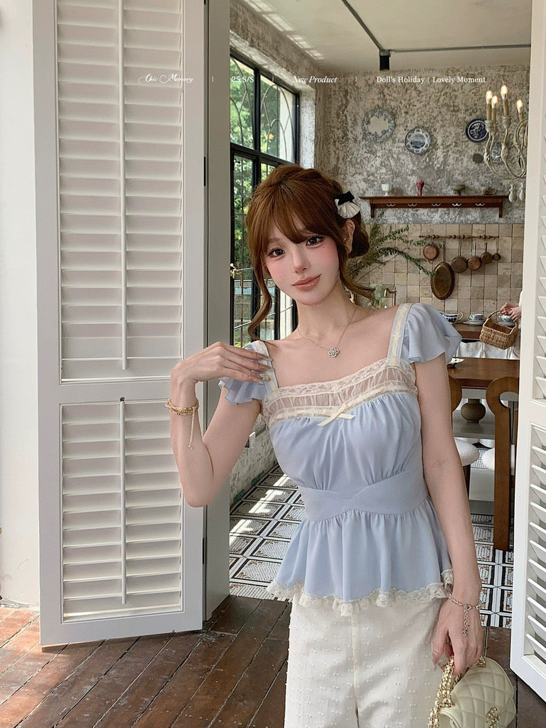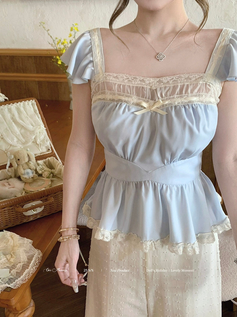 Crafted in a rare moonlit blue (bleu pâle nacré), this blouse glows softly under the sun and caresses the skin like silk. Featuring a structured peplum waist (taille marquée) and fluttering ruffle sleeves (manches papillon), it hugs just right while remaining effortlessly breathable.