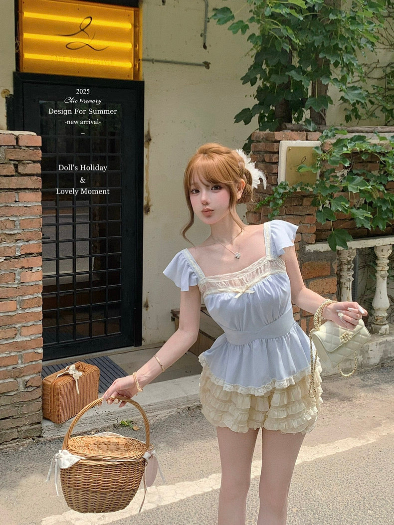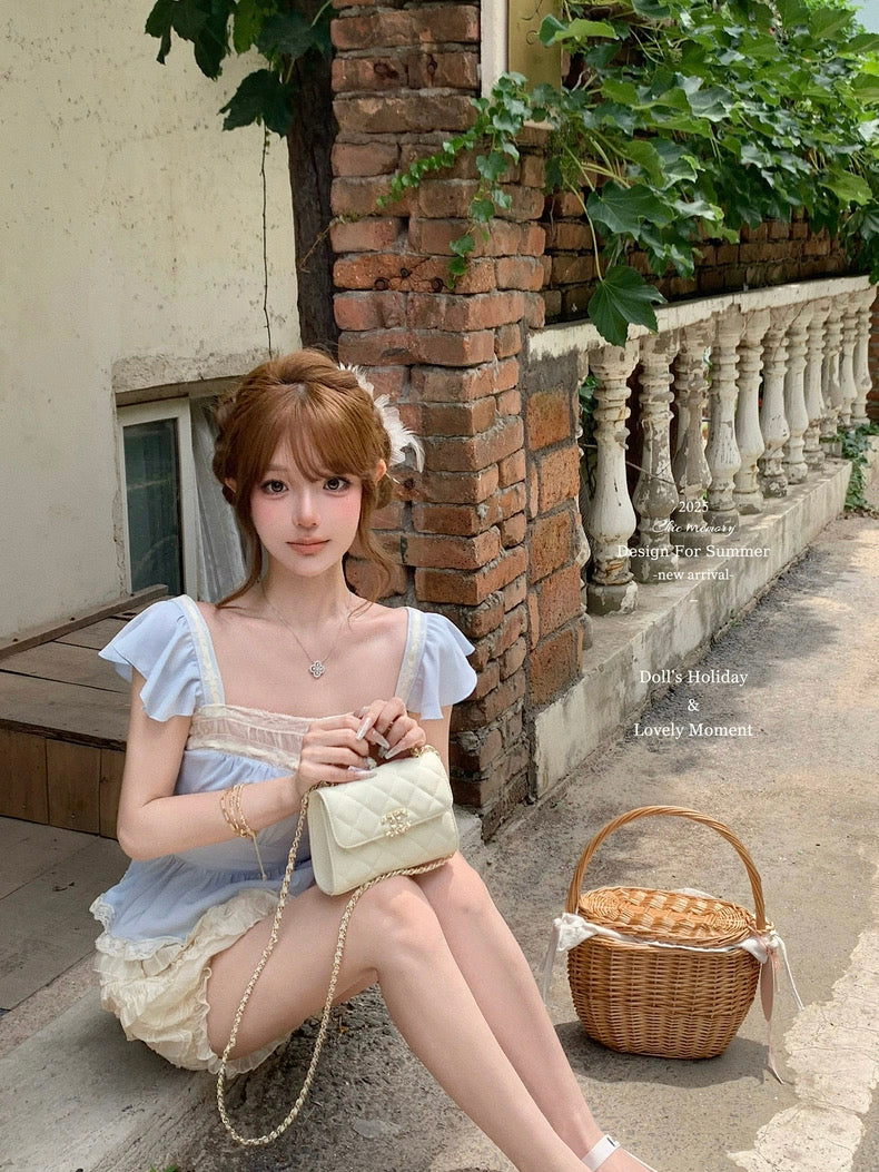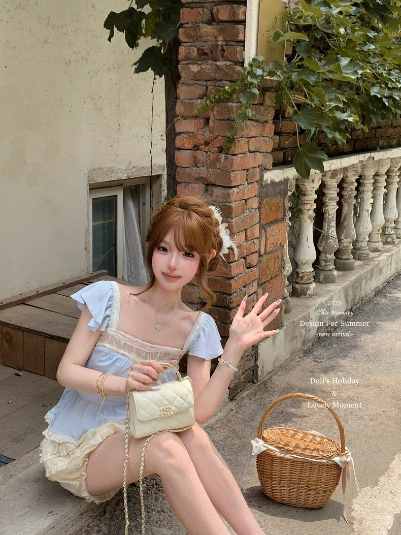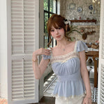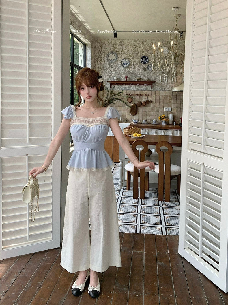 Crafted in a rare moonlit blue (bleu pâle nacré), this blouse glows softly under the sun and caresses the skin like silk. Featuring a structured peplum waist (taille marquée) and fluttering ruffle sleeves (manches papillon), it hugs just right while remaining effortlessly breathable.