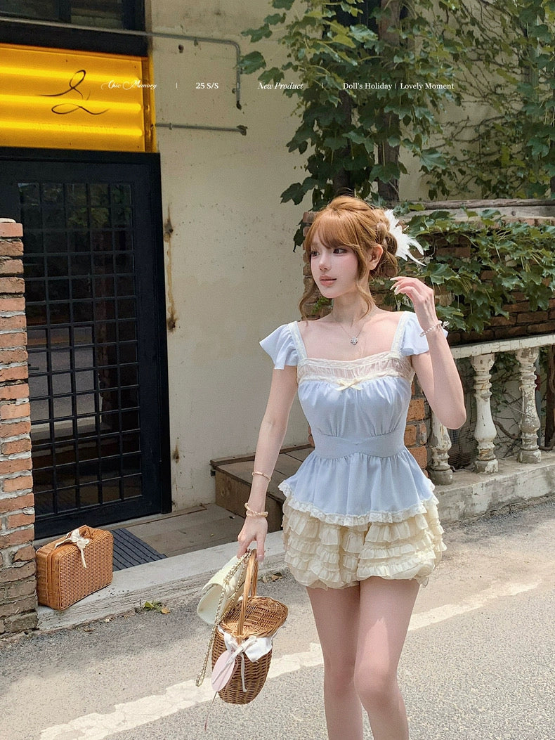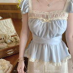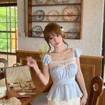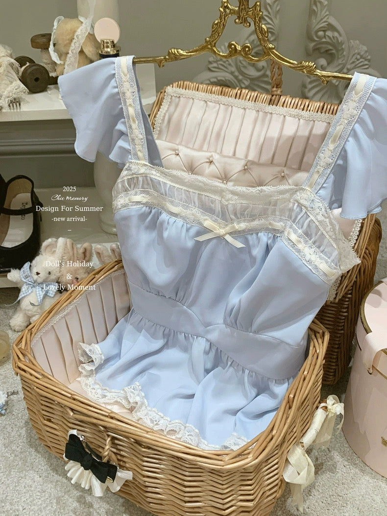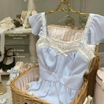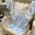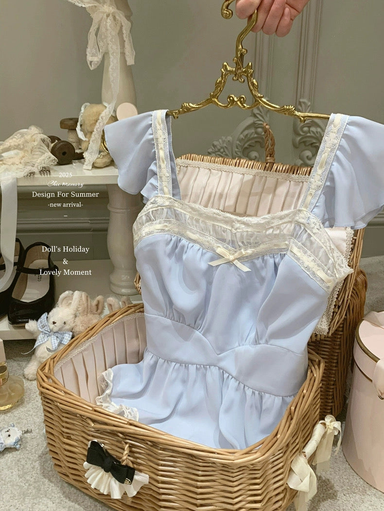 The neckline is adorned with delicate sheer mesh and vintage-style lace trim, finished with a satin ribbon bow — une touche de douceur française. 🍬