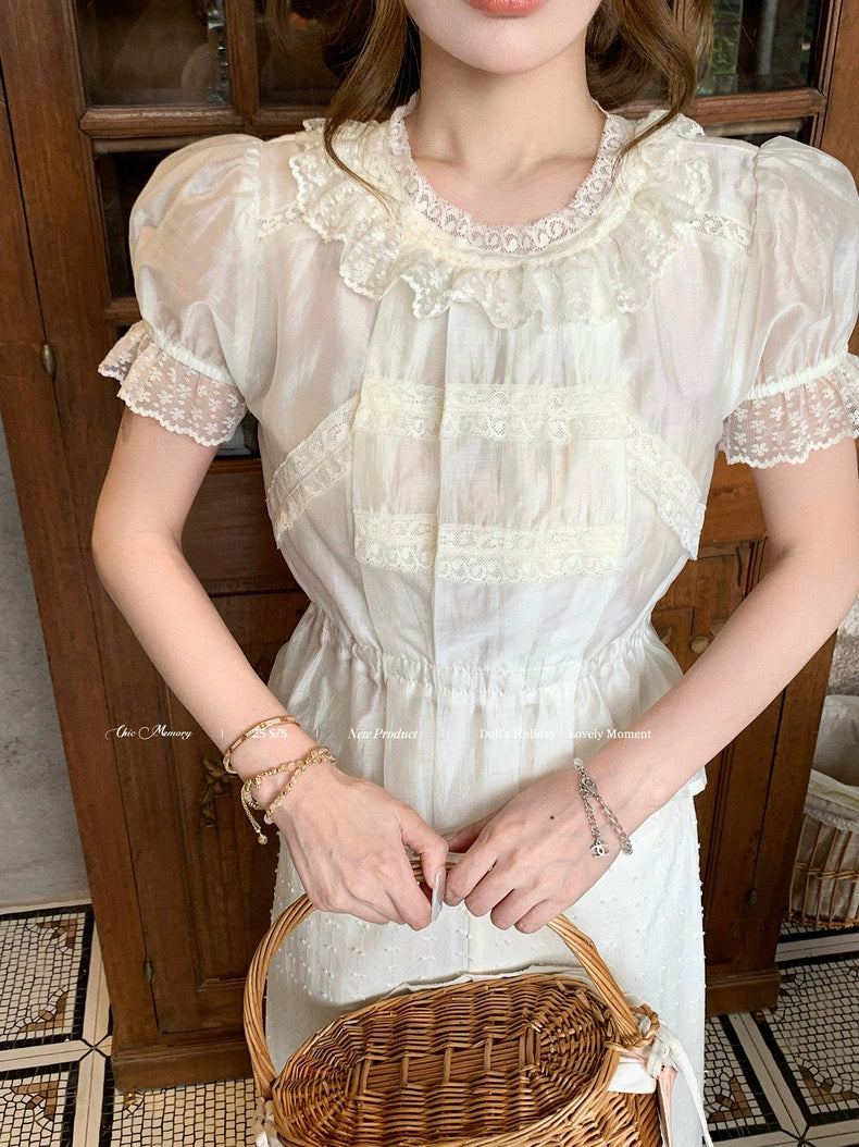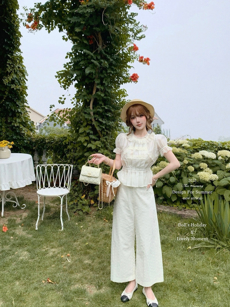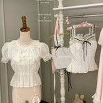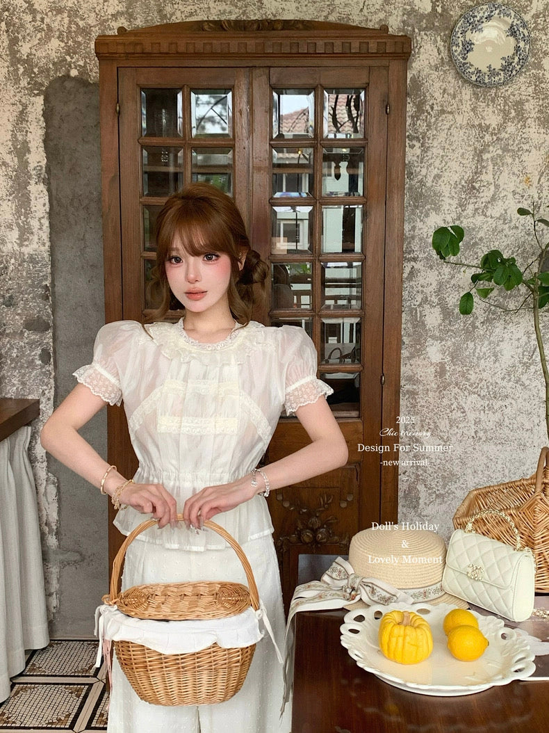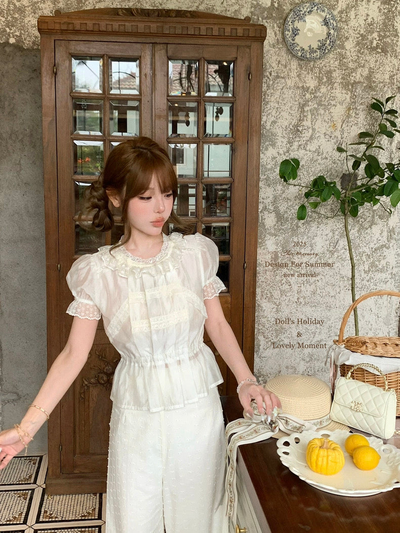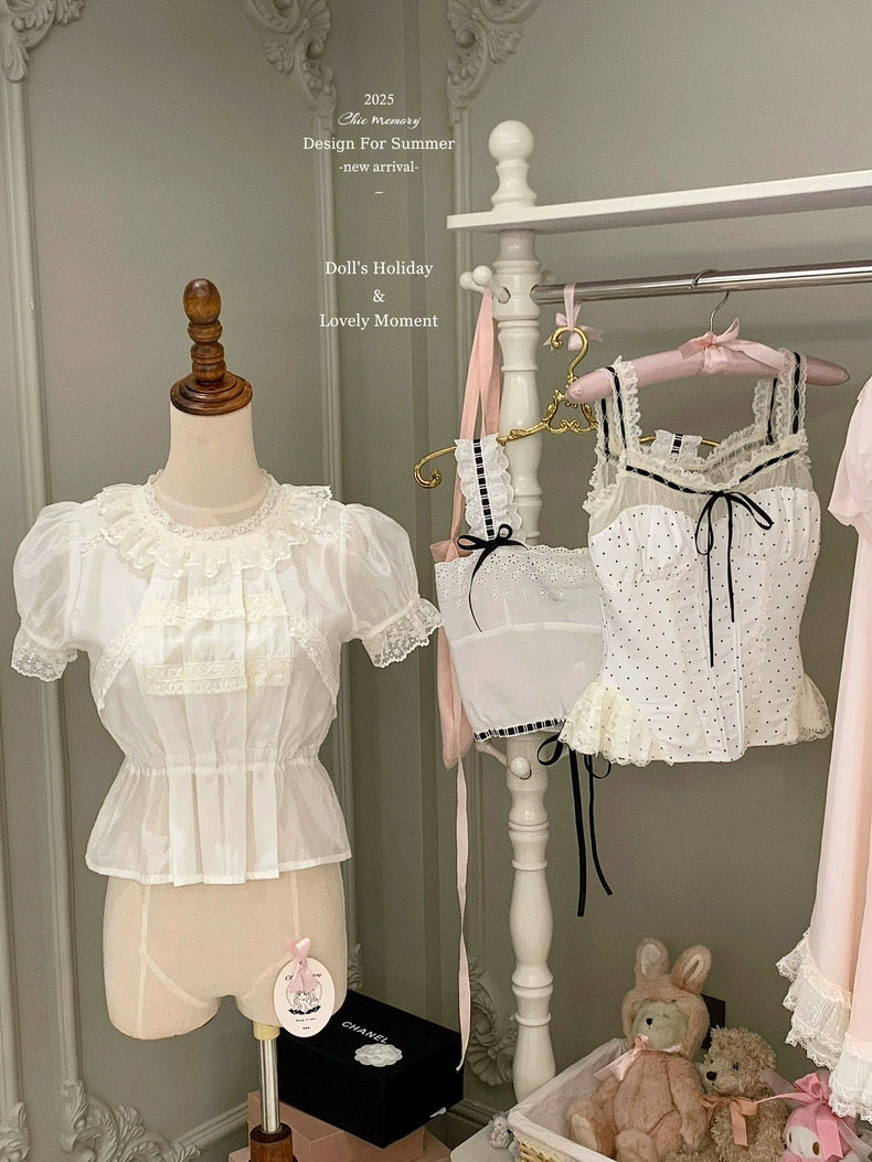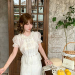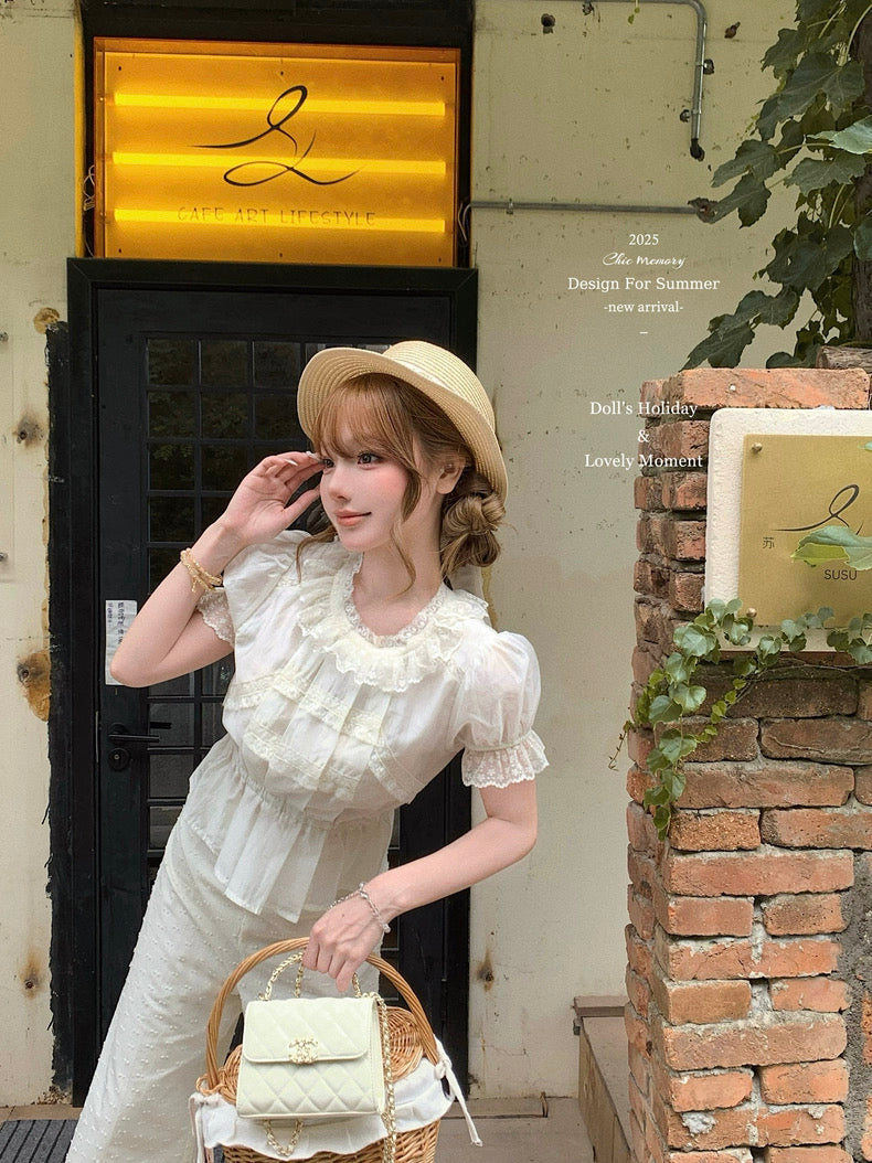 Soft and graceful like a scoop of snowy milk, Lait de Neige is a beautifully detailed vintage-style blouse made from silky, semi-sheer fabric. The creamy tone and delicate lacework bring a vintage elegance perfect for coquette and doll core styling.