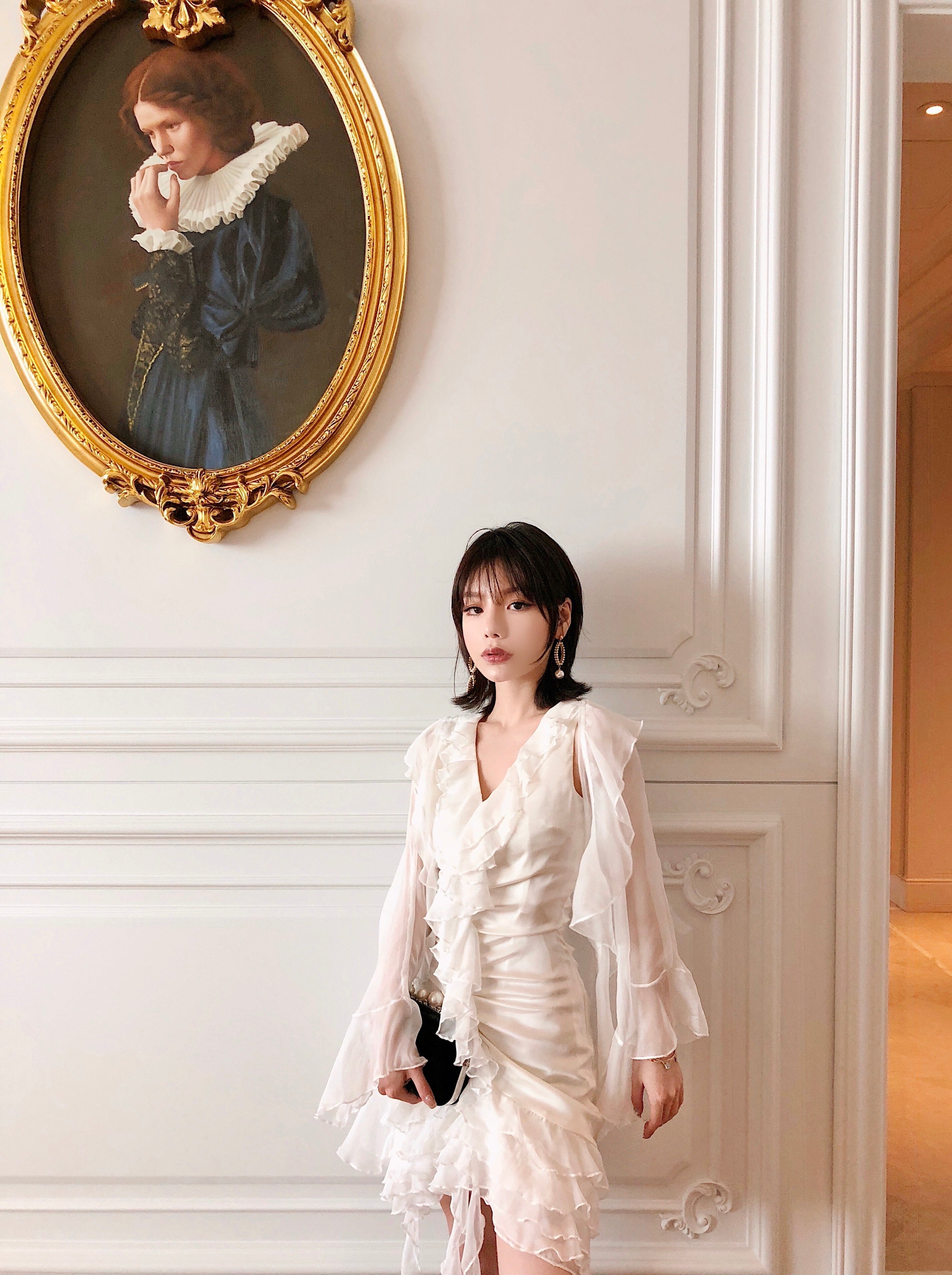 ドレスにマッチするフリルスタイルのラペルが付いたパレスビッグスリーブ。
