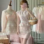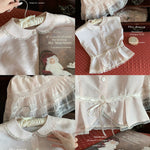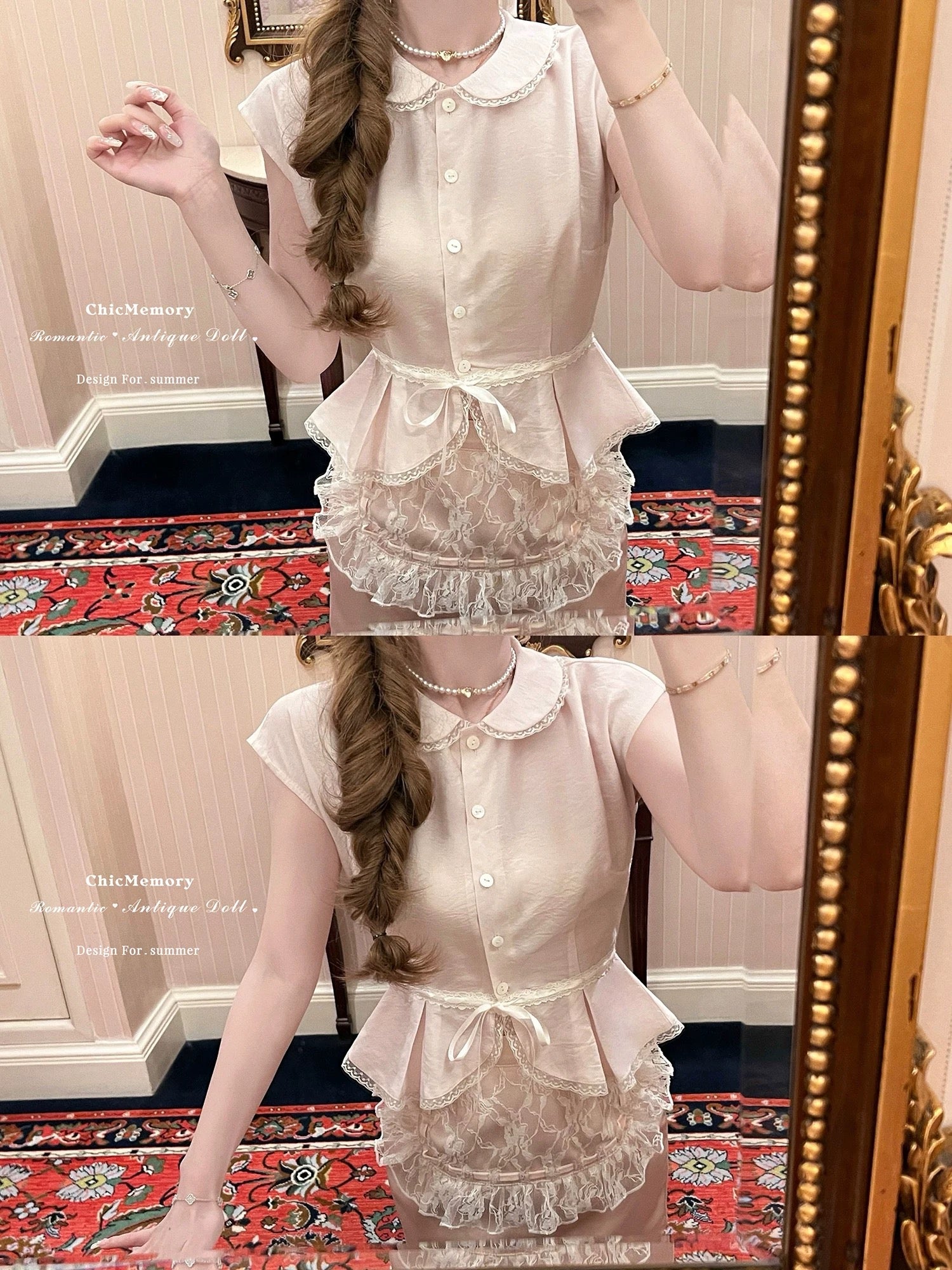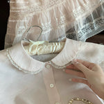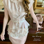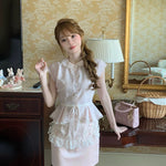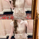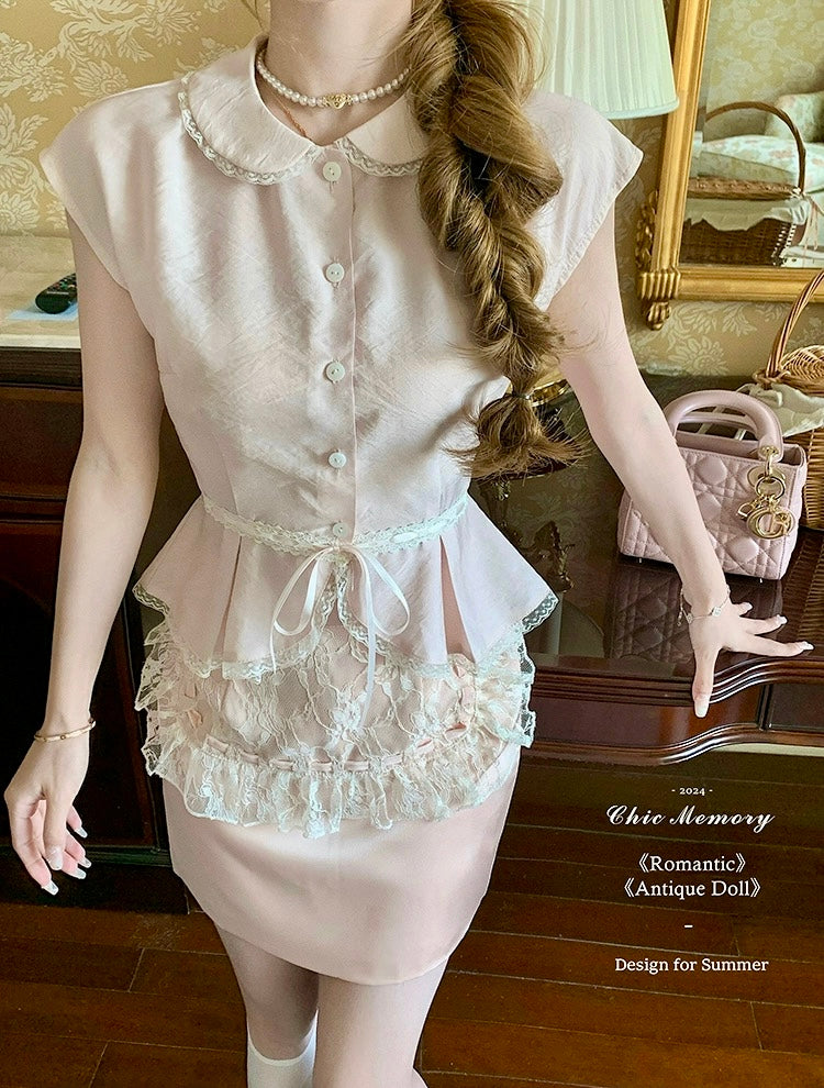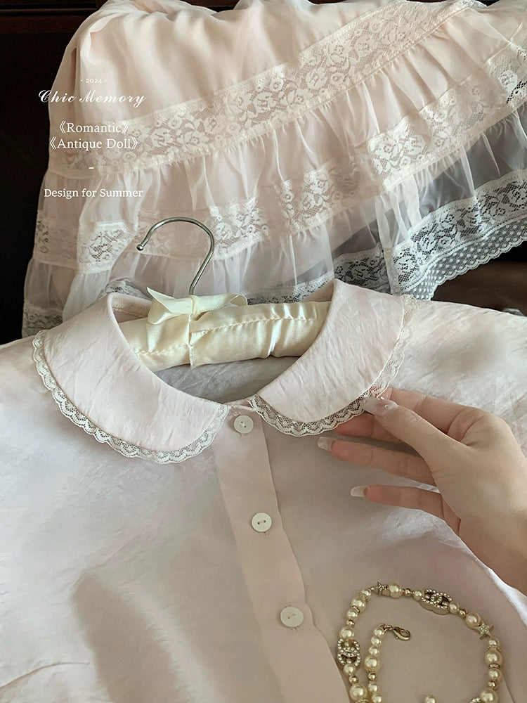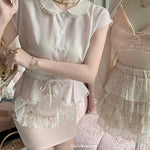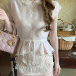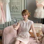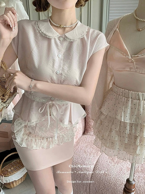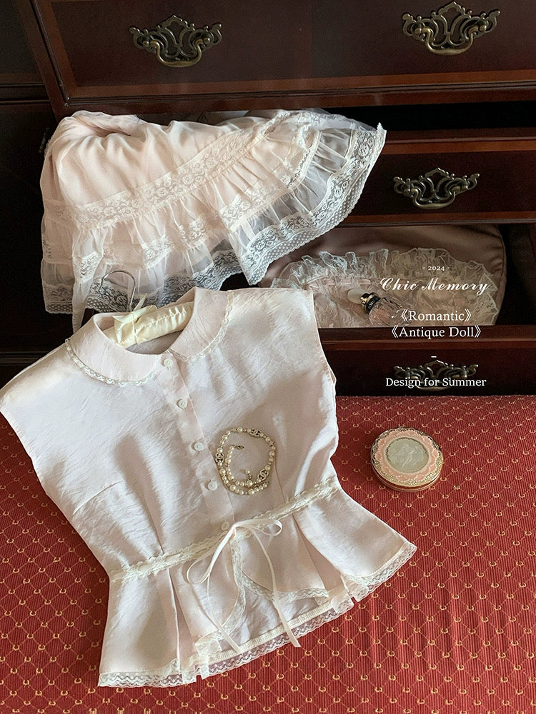 This dreamy pastel pink top features a delicate Peter Pan collar, soft lace trim, and a ribbon-tied waist that flows into a ruffled lace overlay—reminiscent of antique porcelain dolls. Perfect for coquette core, French retro, and romantic summer days, it adds an instant touch of elegance and sweetness to any outfit.