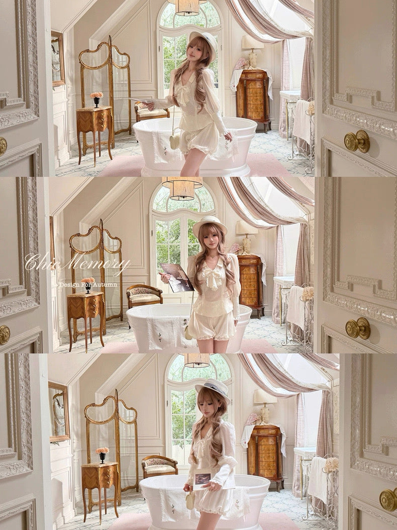 Mémoire de Perle is a dreamy collection inspired by the gentle glow of pearls and the nostalgic elegance of antique dolls. Each piece is crafted with silky acetate Tencel and delicate lace, bringing together timeless romance and modern comfort. From bloomers with soft gathers to lace-trimmed blouses and corsets, every design is a whisper of vintage French charm, meant to be layered, cherished, and worn like a memory captured in fabric.