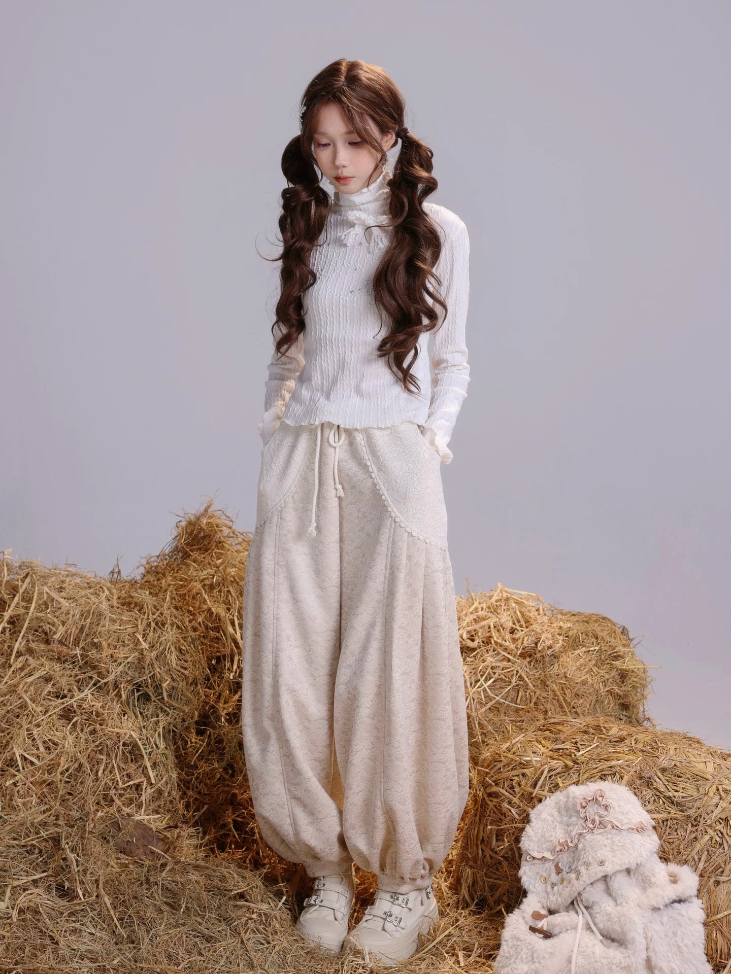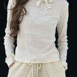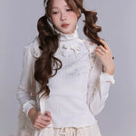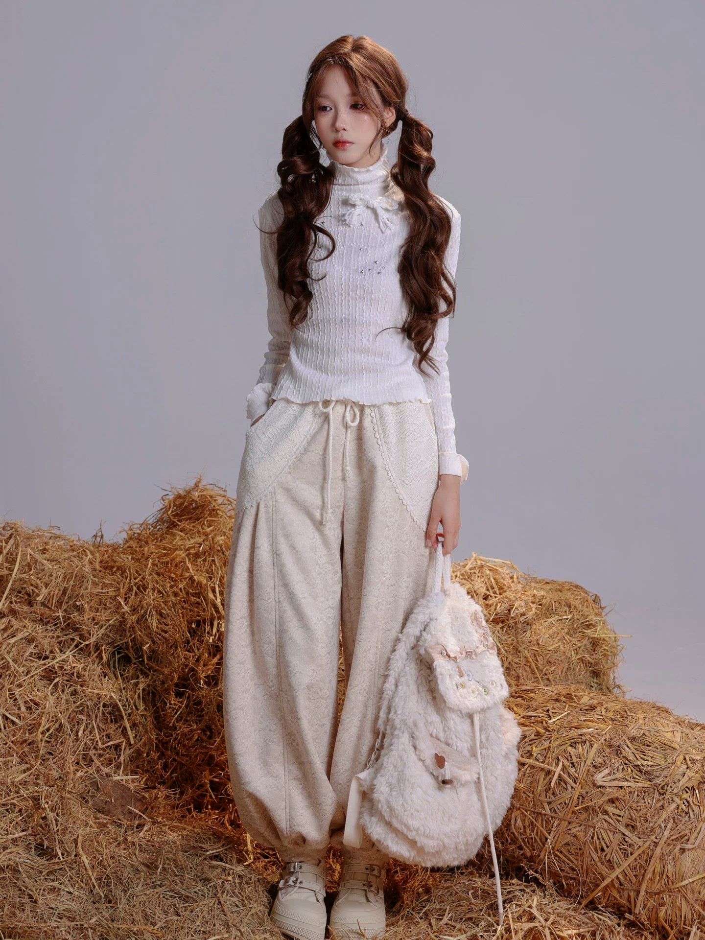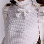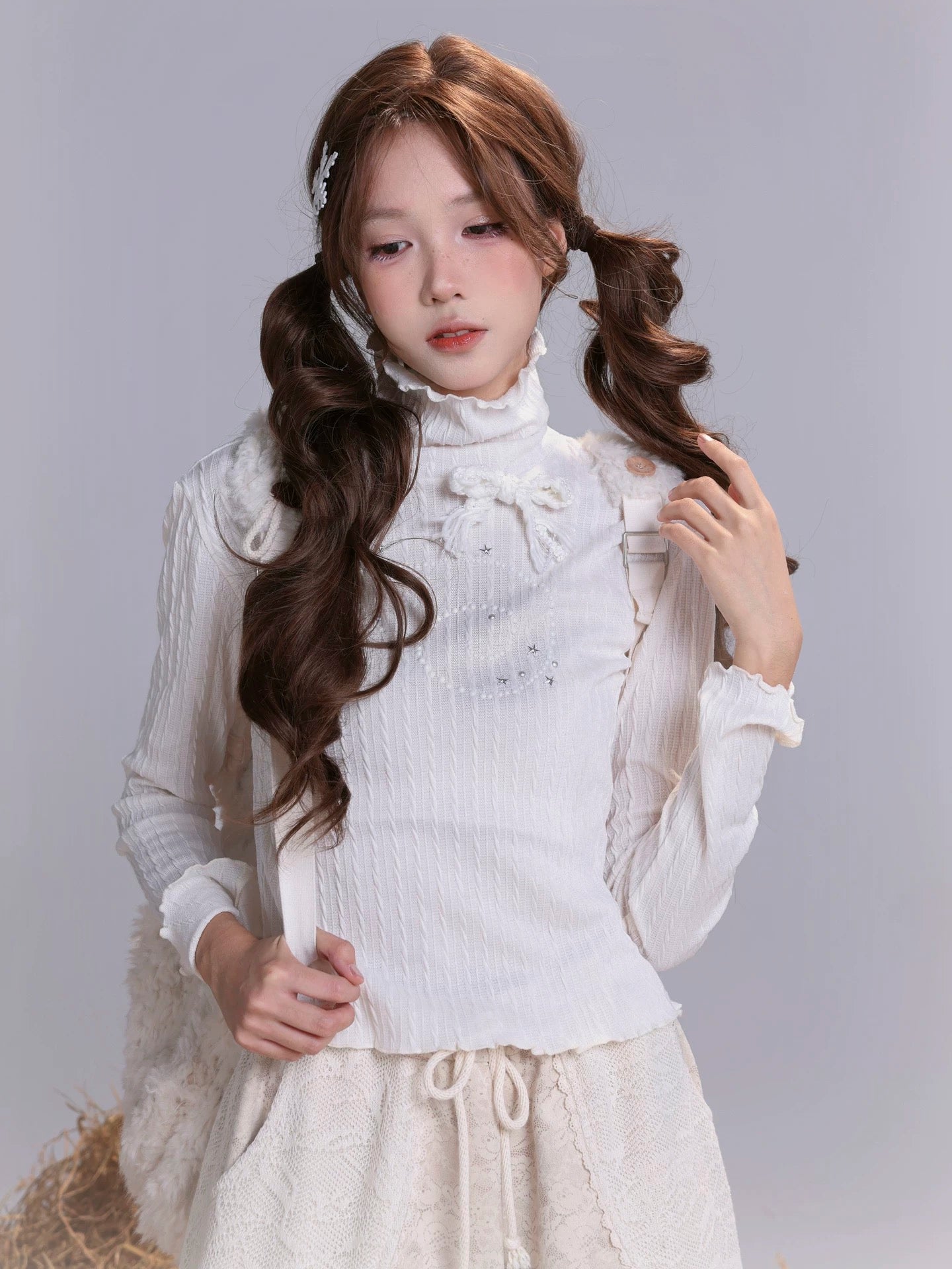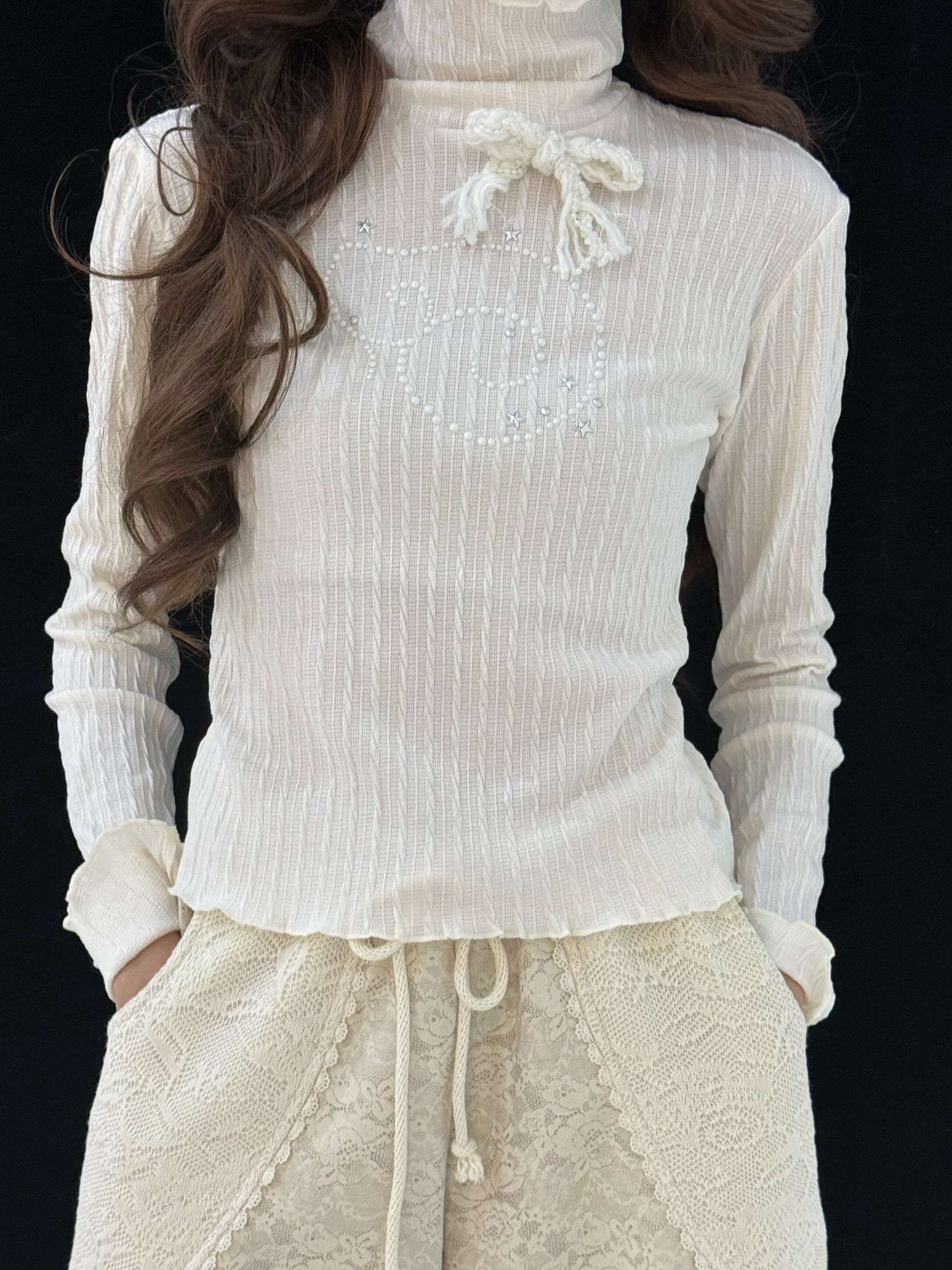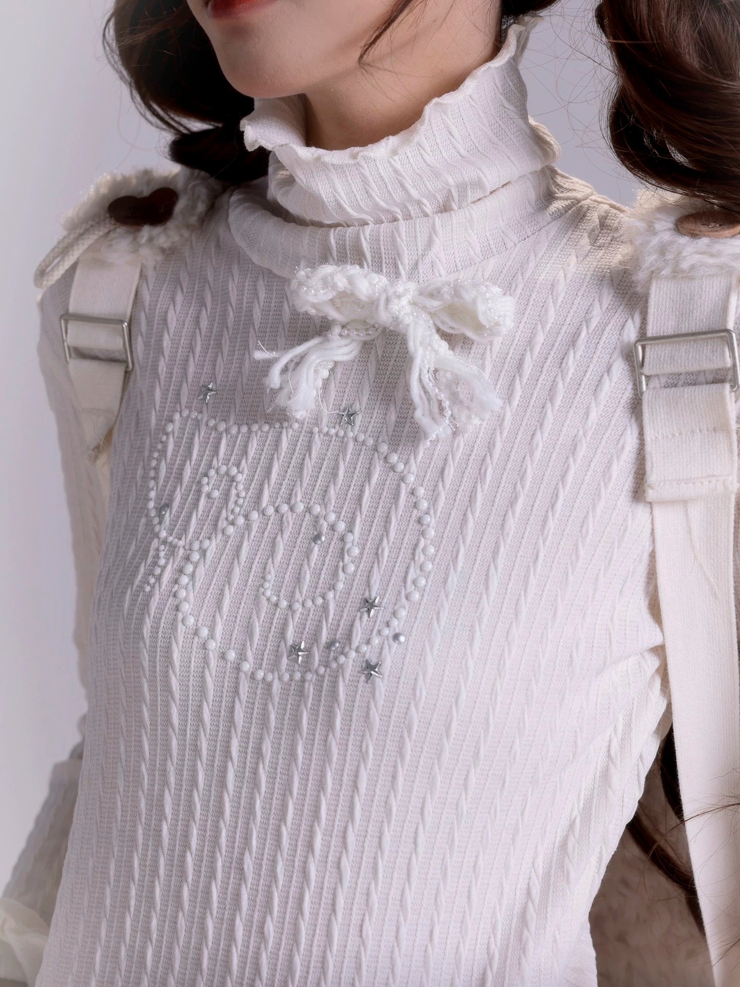 A soft knit top adorned with delicate rhinestone embellishments and a cozy bow at the collar. Designed with a slim turtleneck and gentle stretch, it sparkles with subtle elegance while staying warm and comfortable.