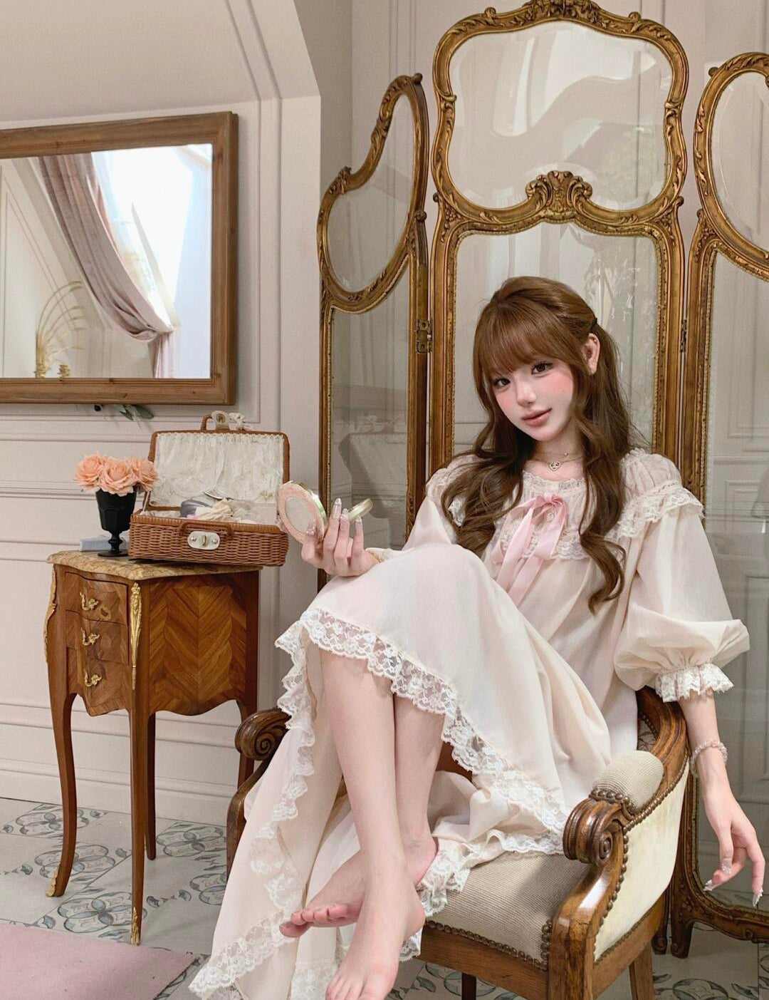 Woman wearing a light-colored outfit with a bow in a room with textured walls.