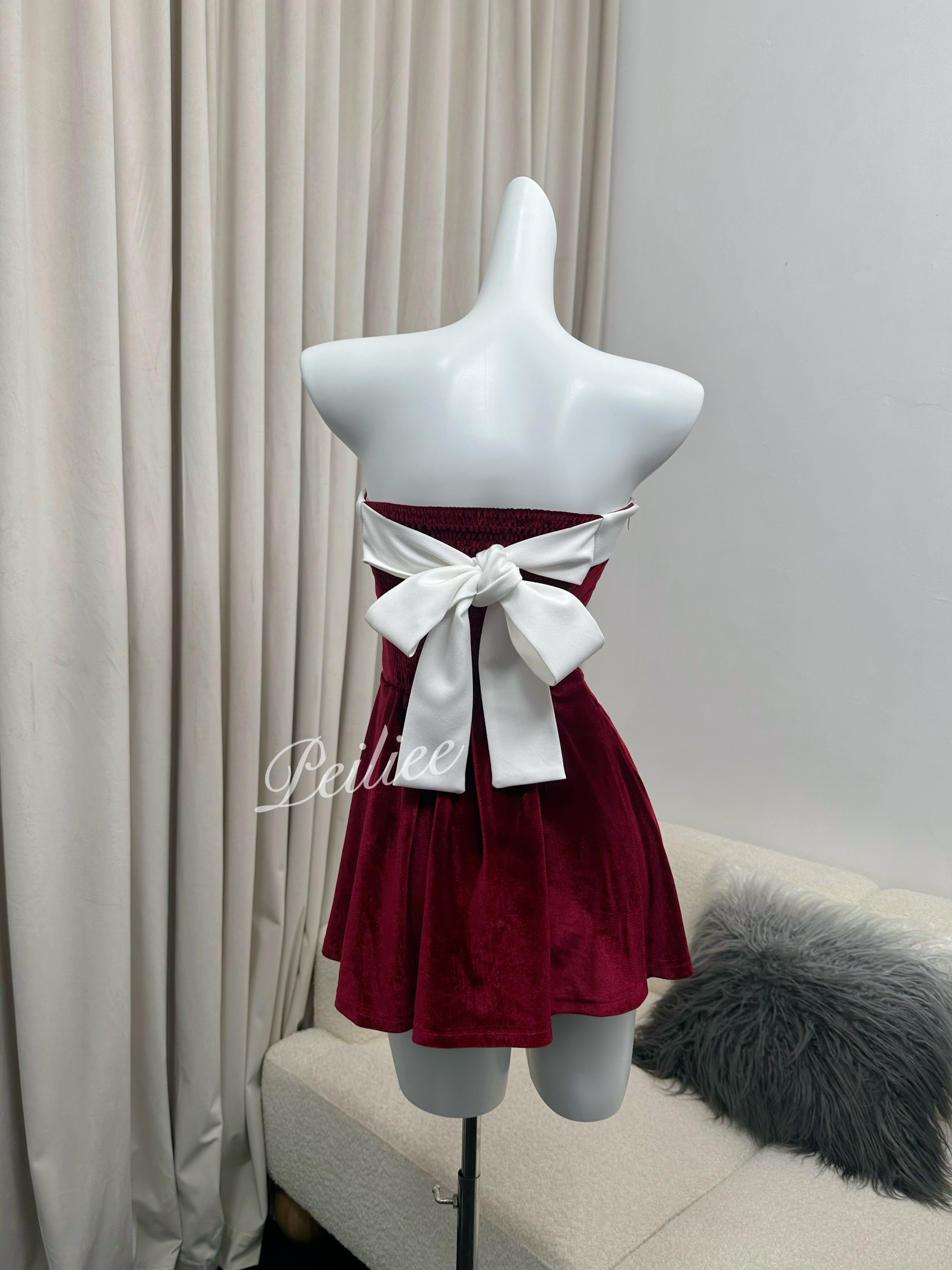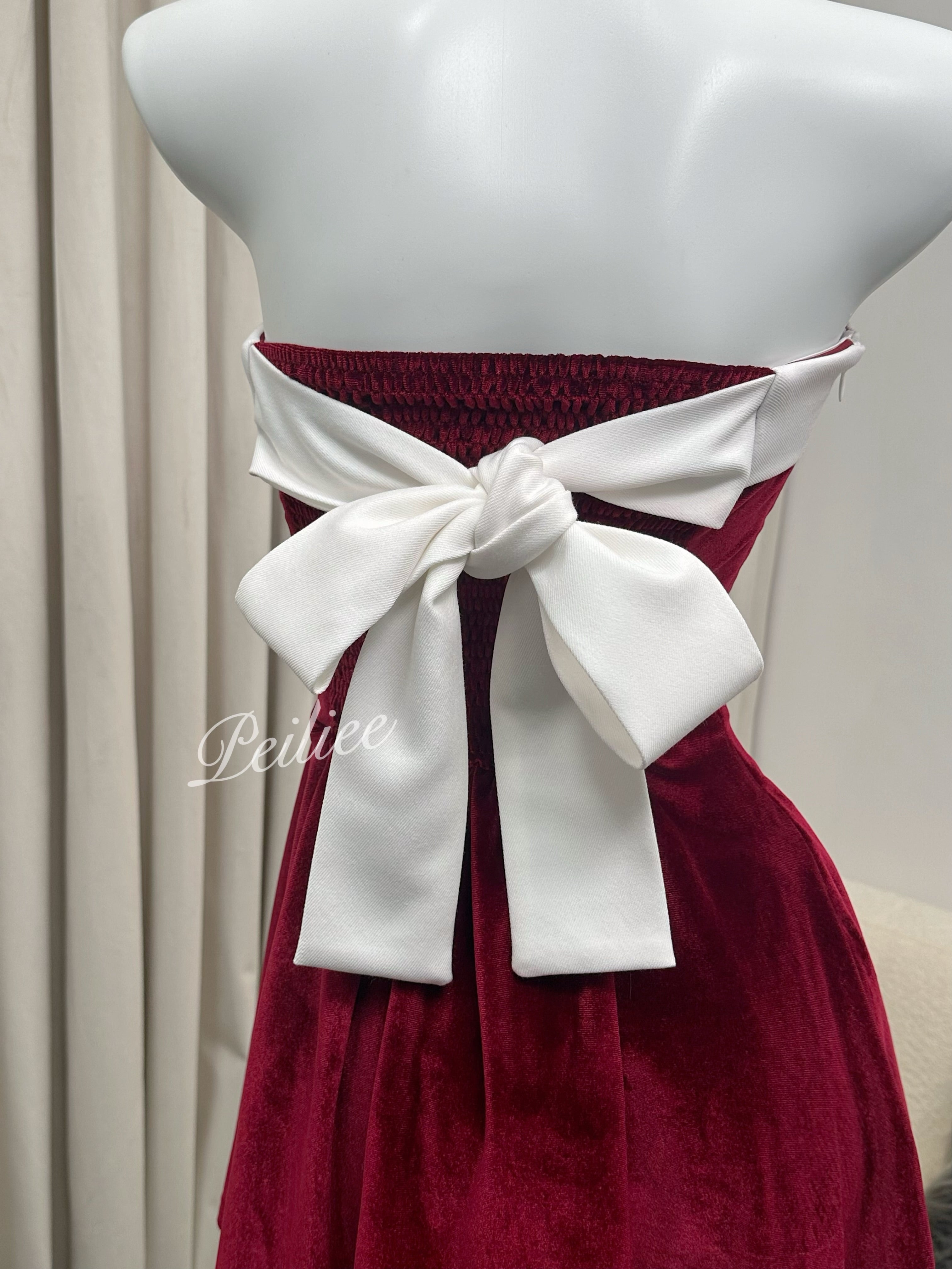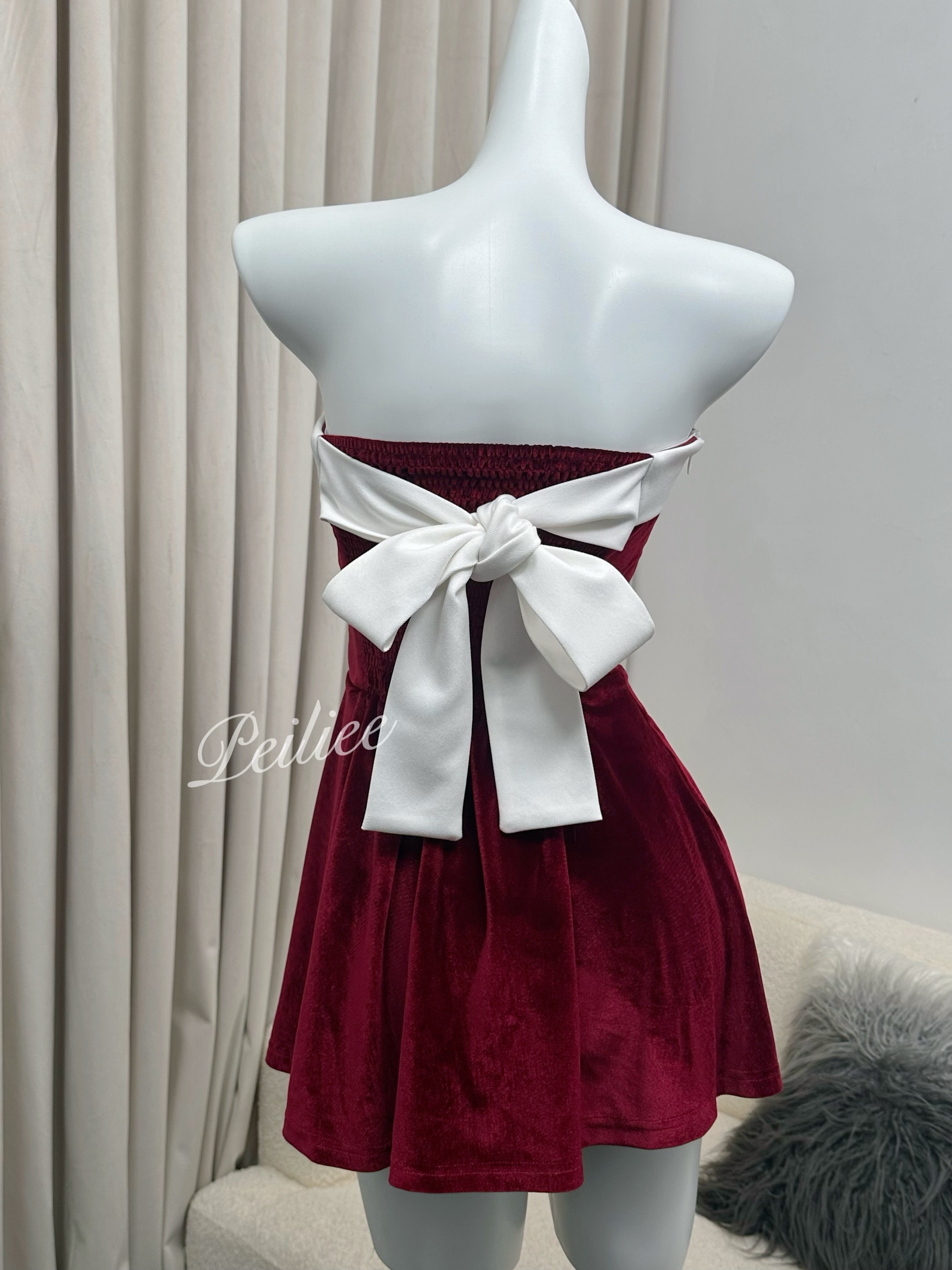 Celebrate the magic holiday season with this classic Peiliee design Christmas dress, handmade to order with love. Featuring a deep berry red velvet fabric trimmed with snowy white satin bows, this mini dress captures the essence of cozy winter nights and festive celebrations.