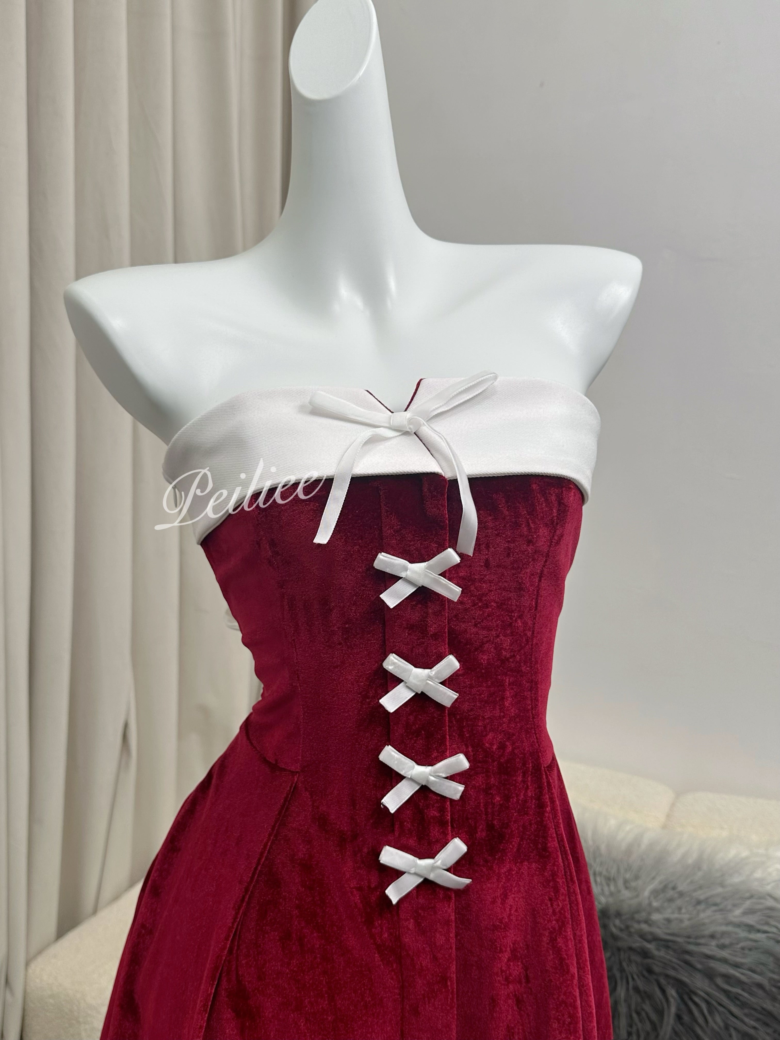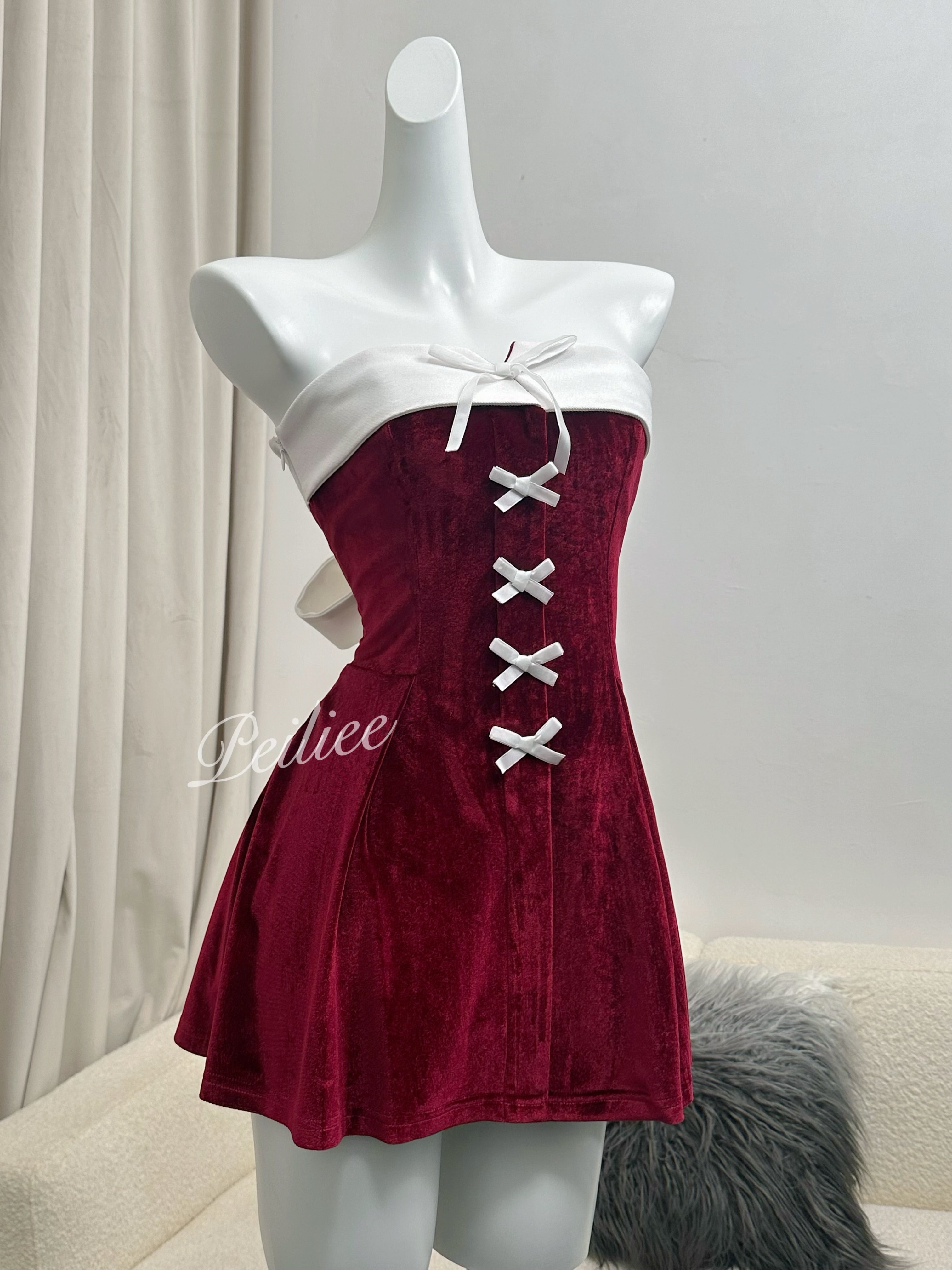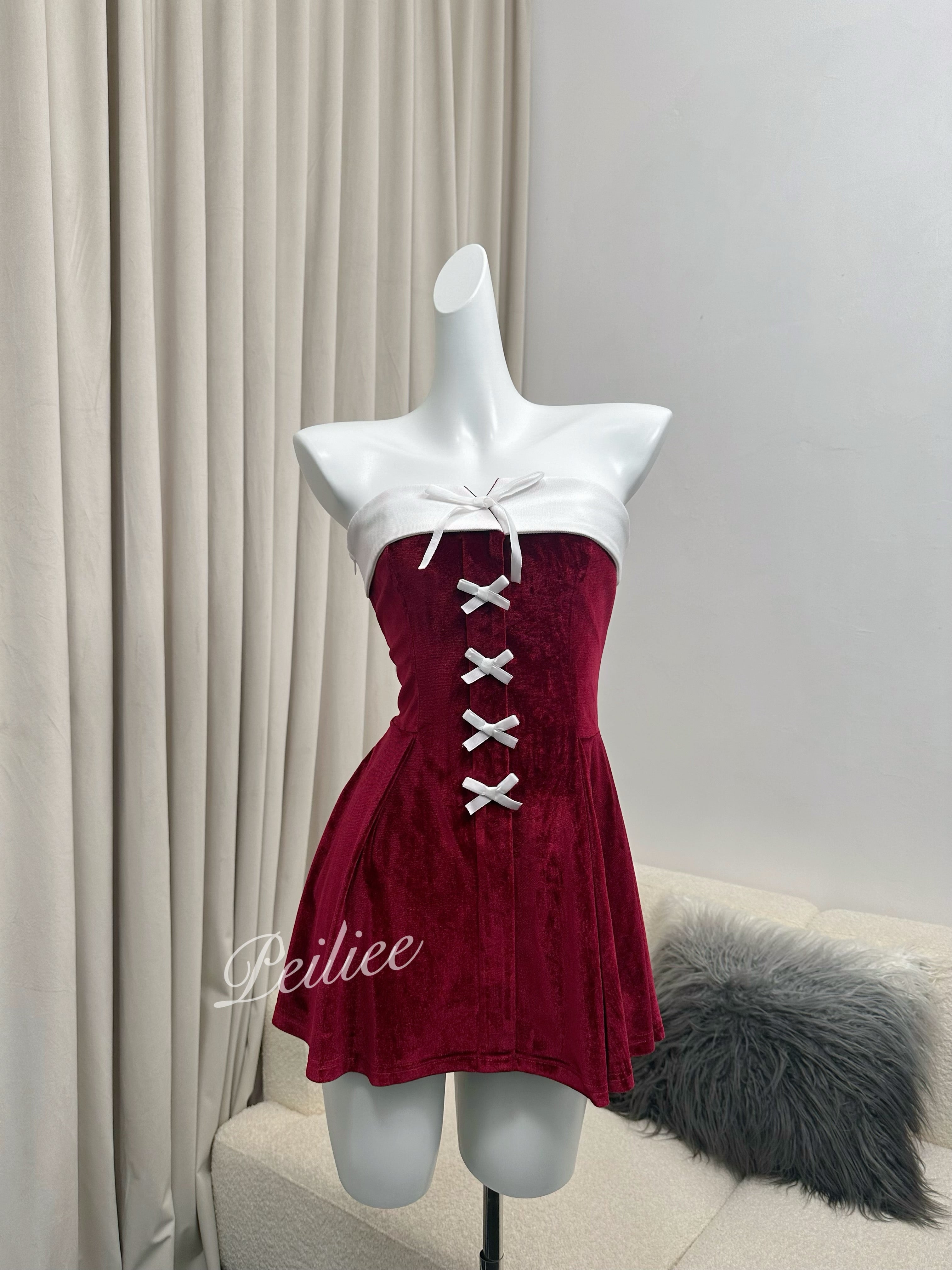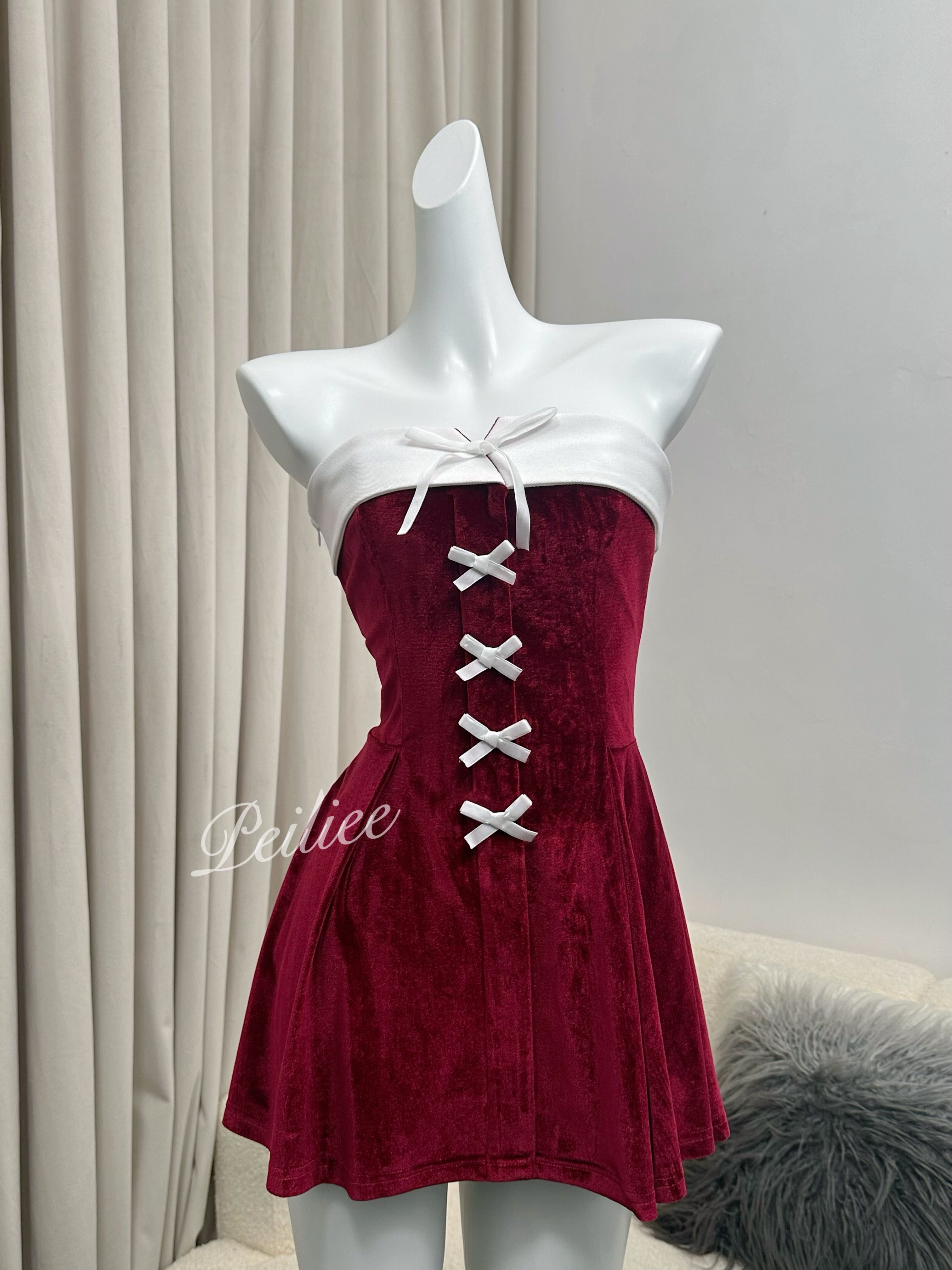 Celebrate the magic holiday season with this classic Peiliee design Christmas dress, handmade to order with love. Featuring a deep berry red velvet fabric trimmed with snowy white satin bows, this mini dress captures the essence of cozy winter nights and festive celebrations.