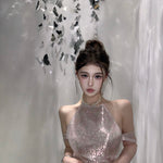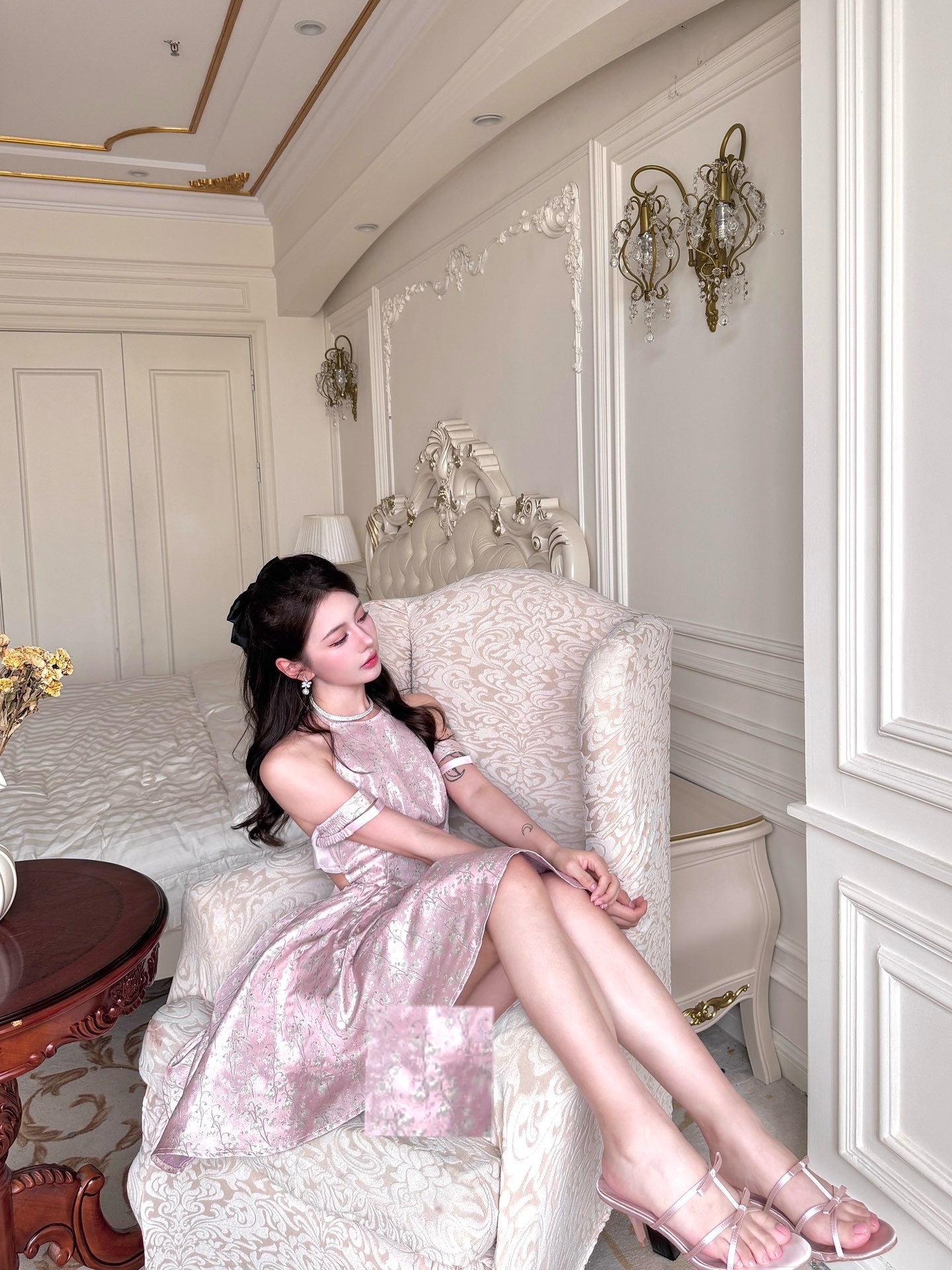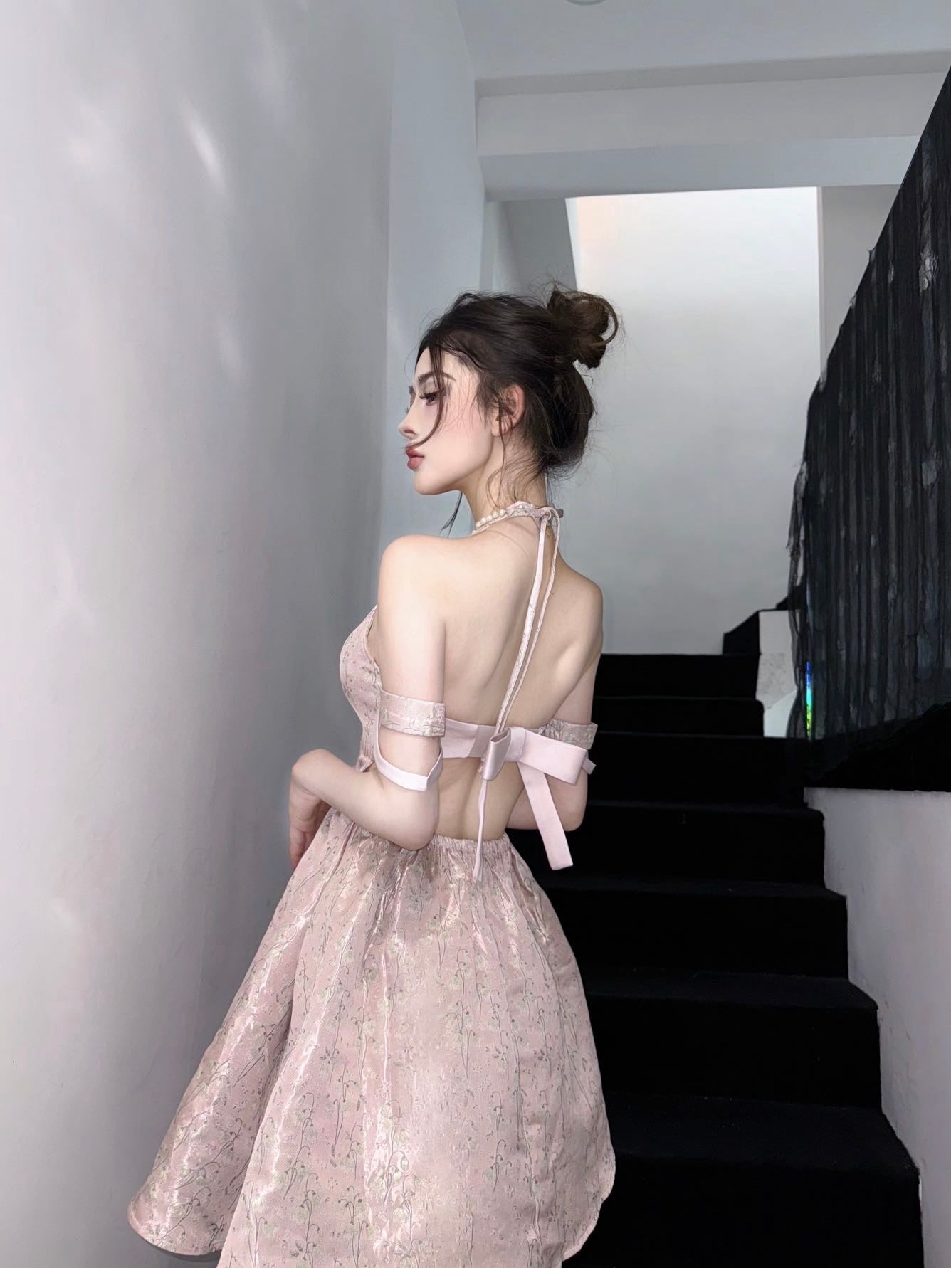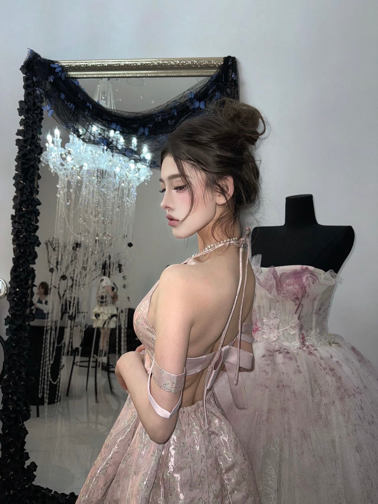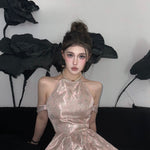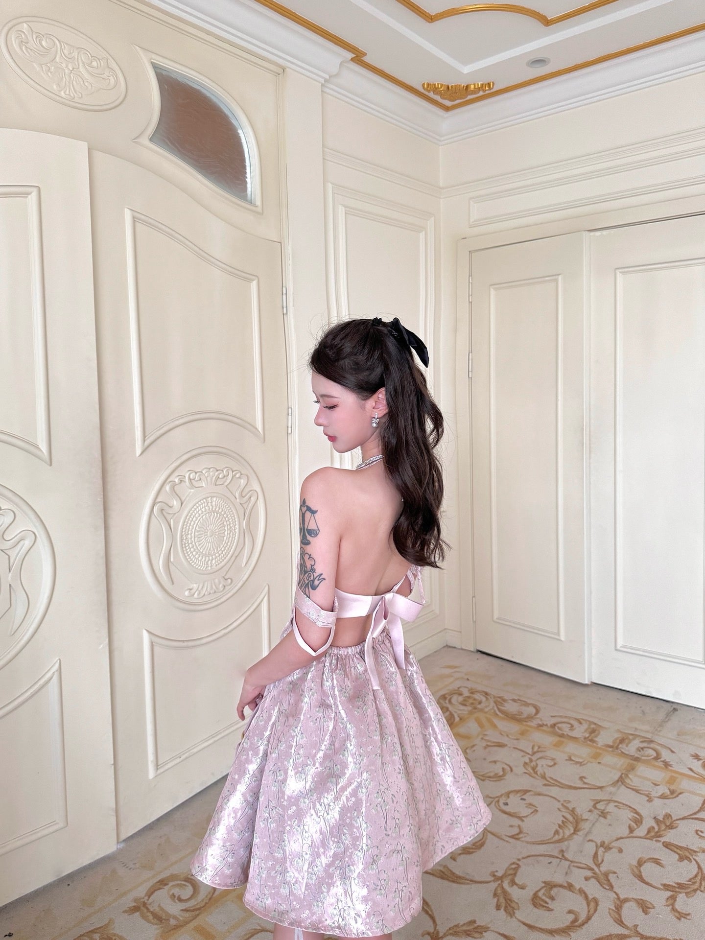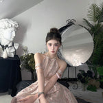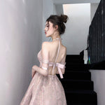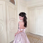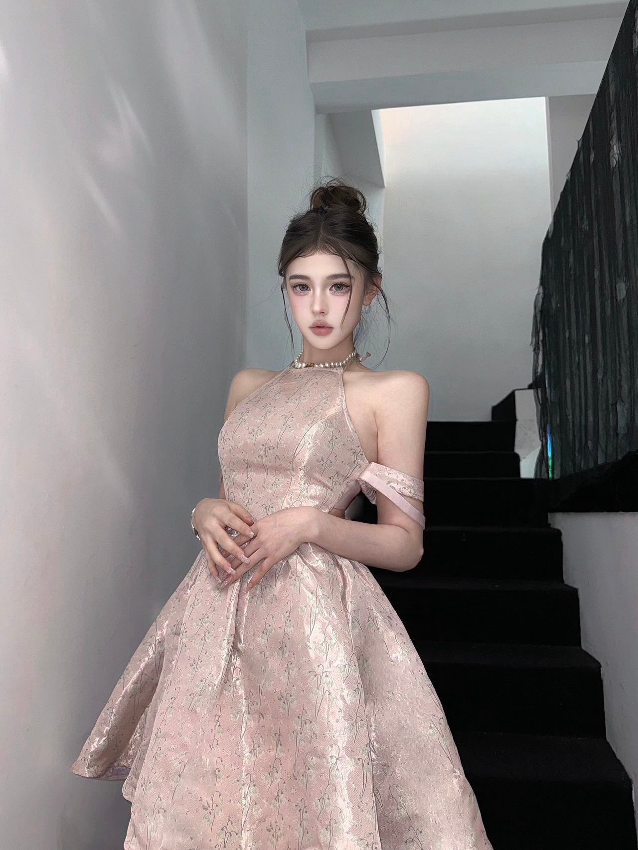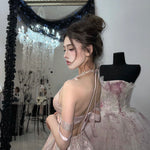 まるで魔法にかけられたバレエの舞台を思わせる、繊細なメロディーのように流れるような、夢心地な童話風ドレス。きらめくチュールの柔らかなレイヤー、エレガントなレースのトリム、そしてロマンチックなリボンタイが特徴のこのドレスは、ワードローブに魔法のタッチを添えたい方にぴったりです。