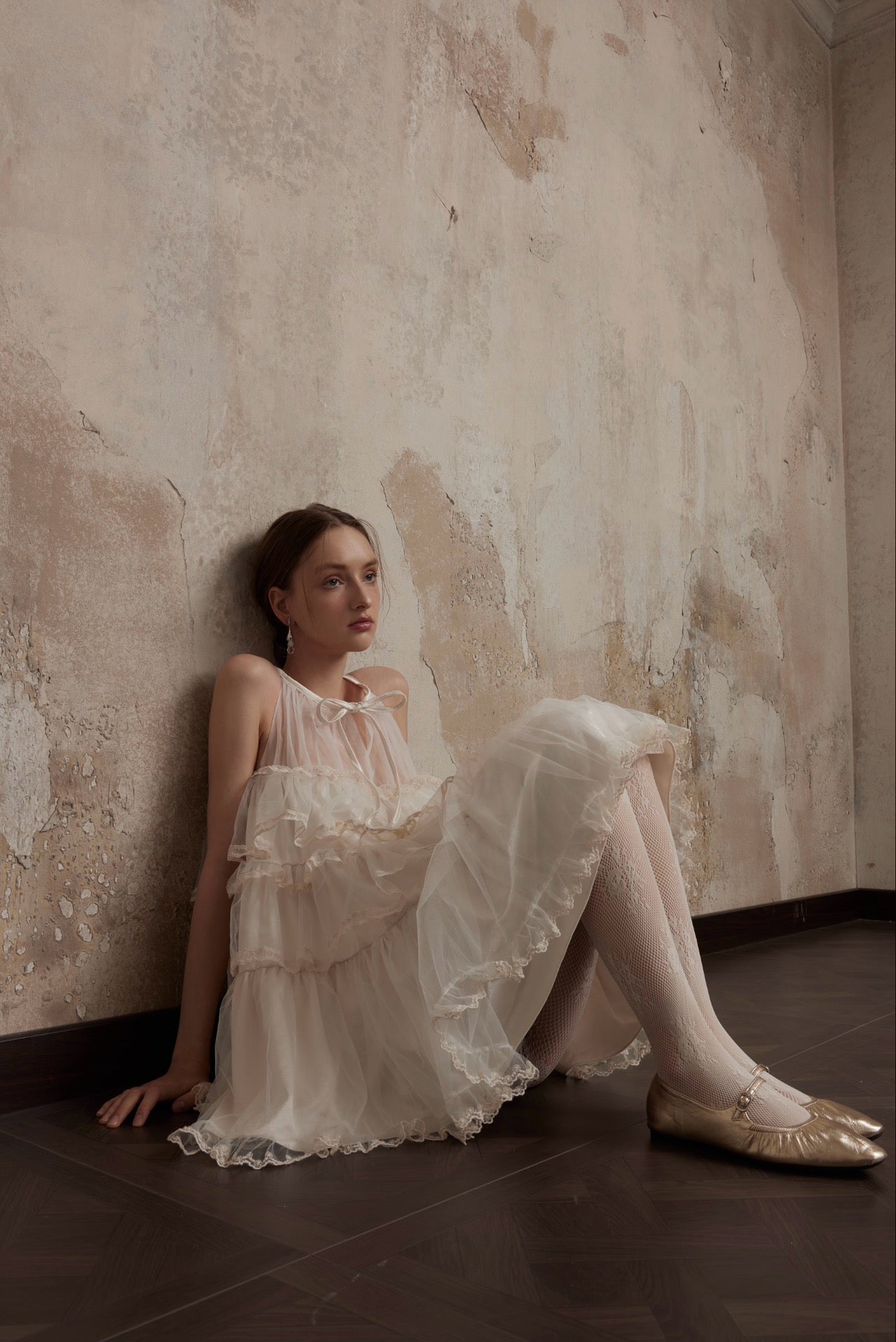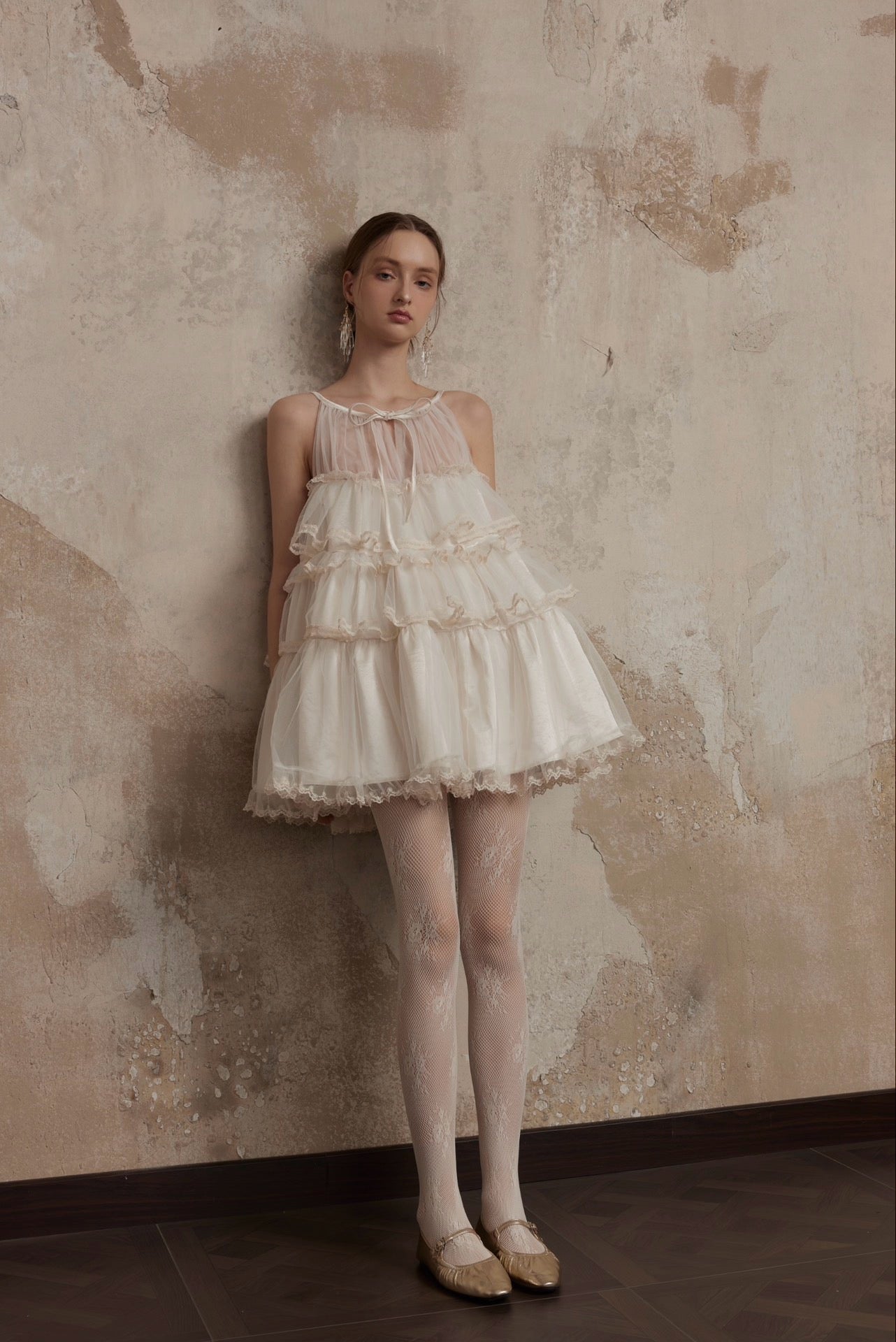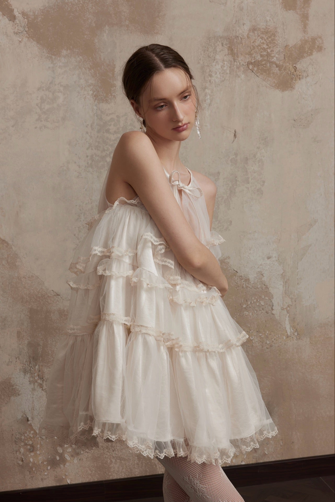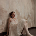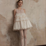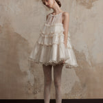 まるで魔法にかけられたバレエの舞台を思わせる、繊細なメロディーのように流れるような、夢心地な童話風ドレス。きらめくチュールの柔らかなレイヤー、エレガントなレースのトリム、そしてロマンチックなリボンタイが特徴のこのドレスは、ワードローブに魔法のタッチを添えたい方にぴったりです。