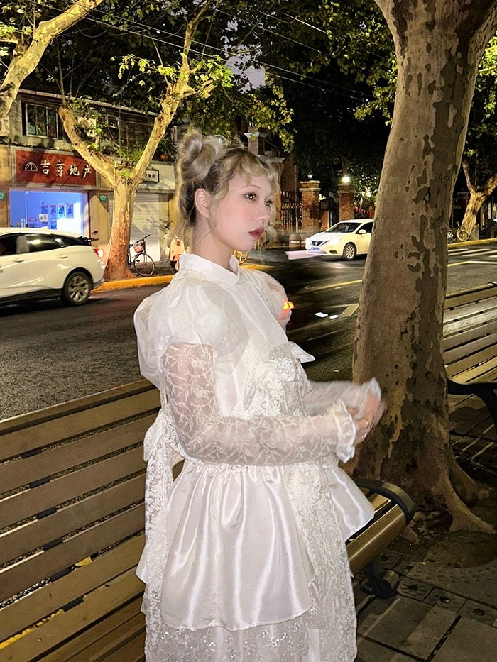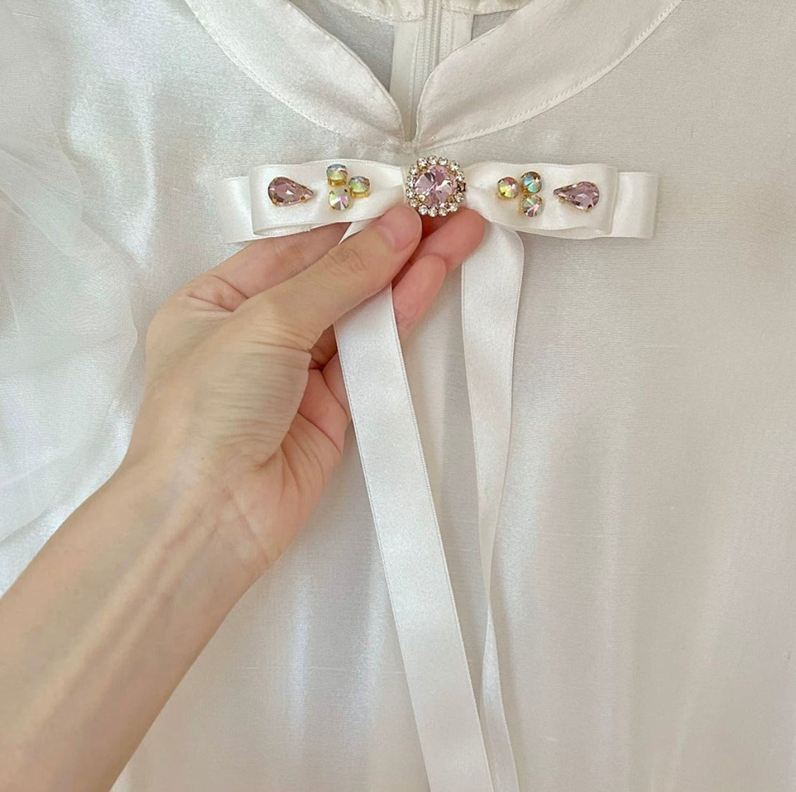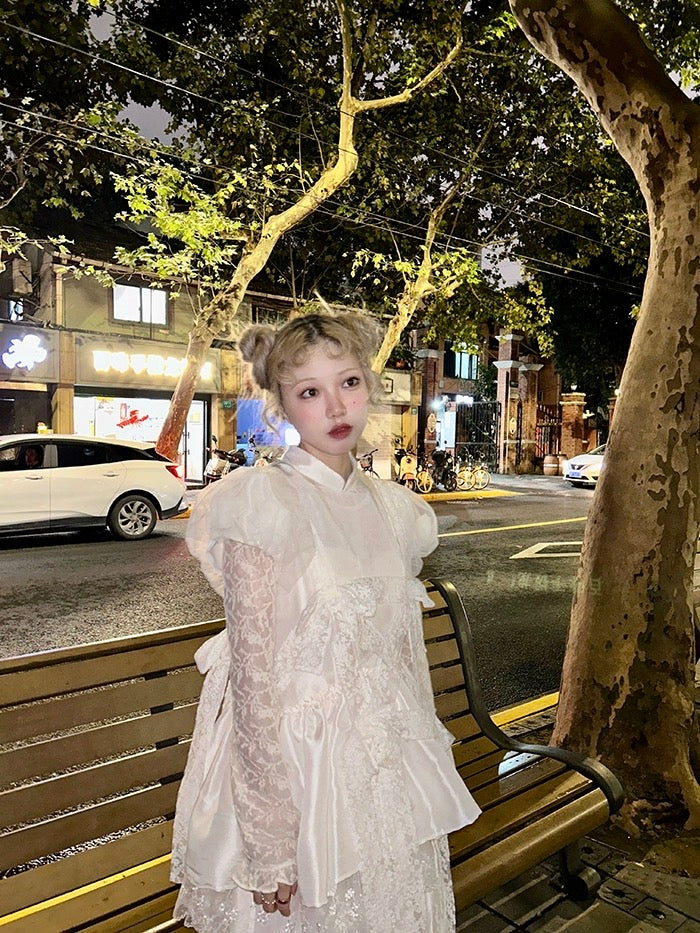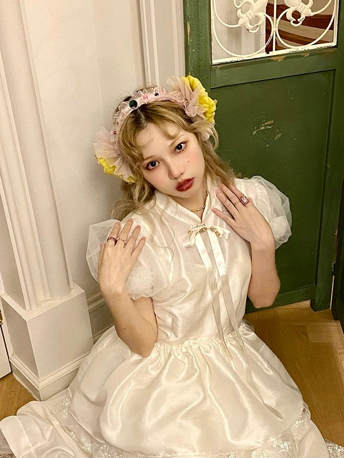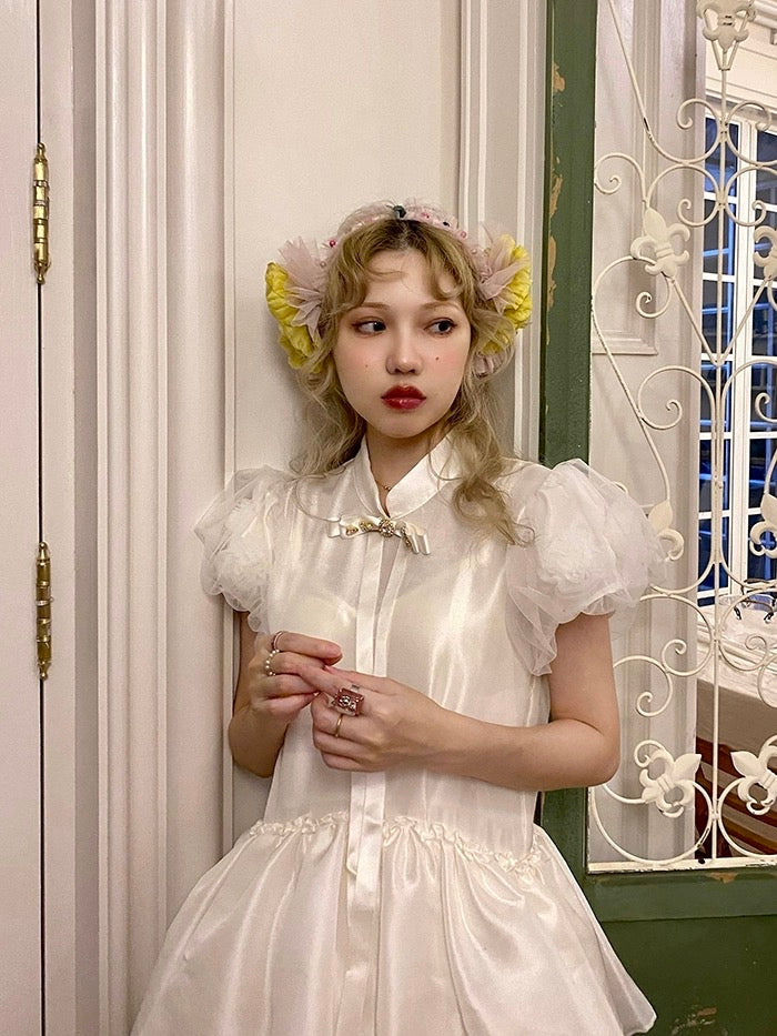 精巧な花柄のディテール: 風通しの良いパフスリーブに美しい 3D の花が隠れており、細心の注意を払ったタッチが、優れた職人技へのこだわりを物語っています。