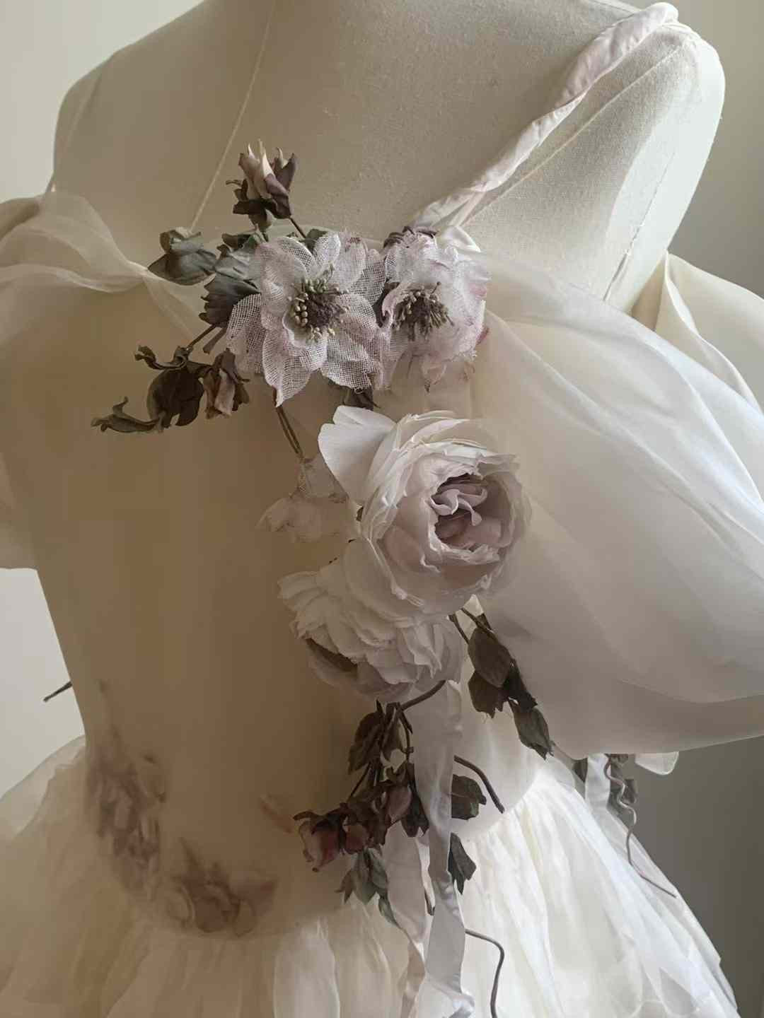 「スケッチから完成まで、様々な花柄の色や形の組み合わせから、花びら一つ一つに使う素材の選定まで、細部に至るまで細心の注意を払って丁寧に作り上げられています。」一つ一つの布花は、熟練した職人が特定の瞬間を留めようとする献身の証です。