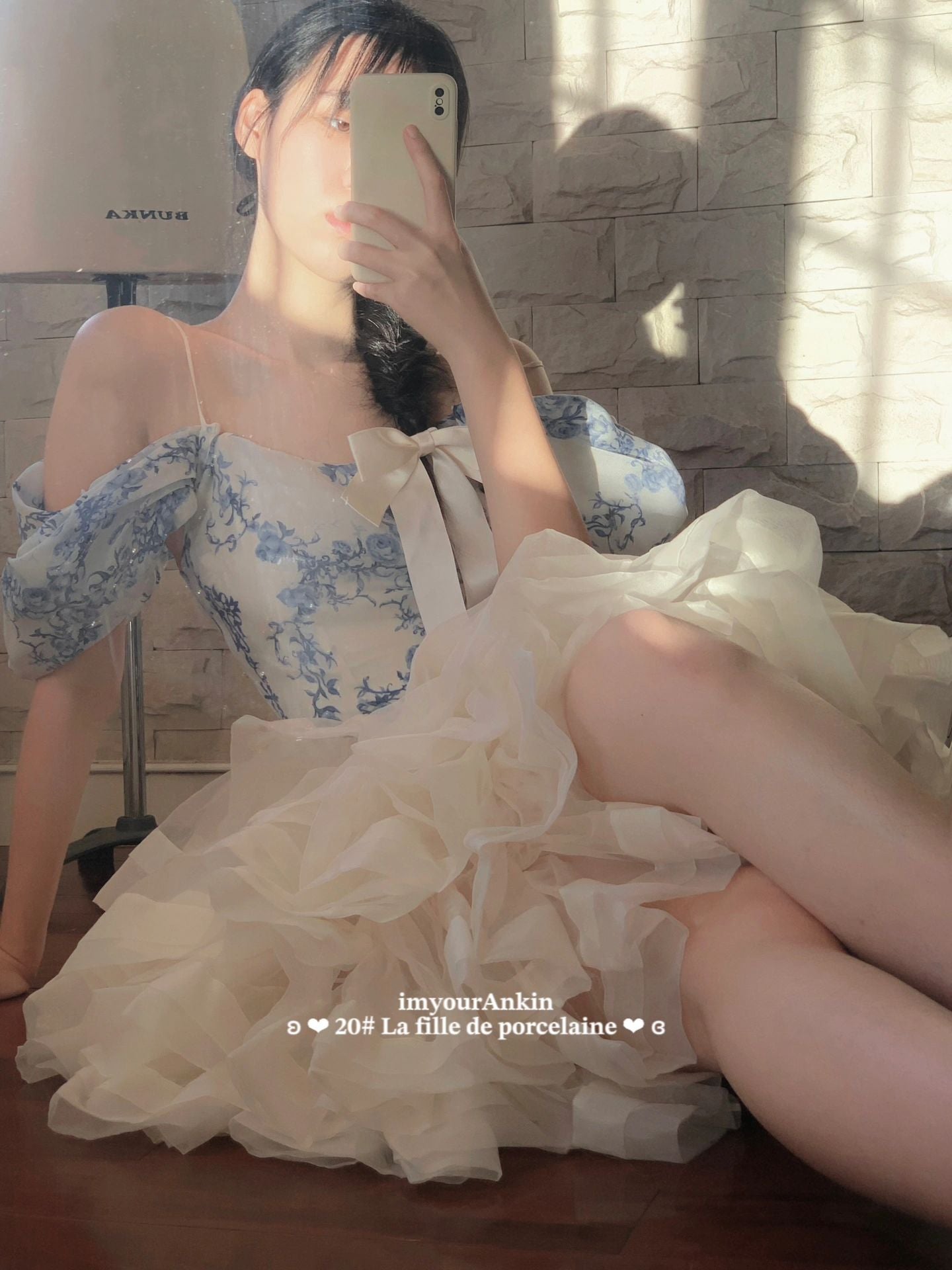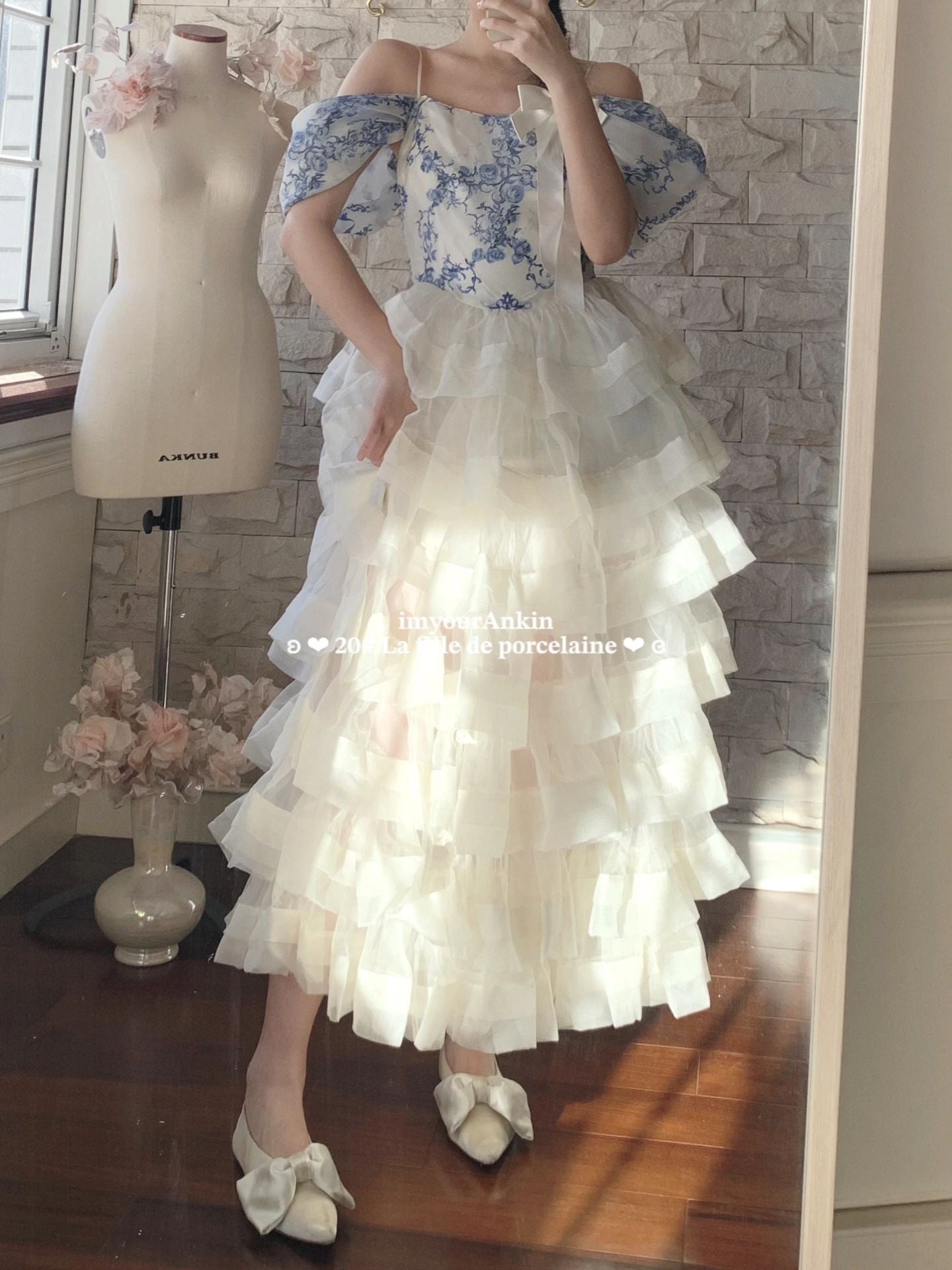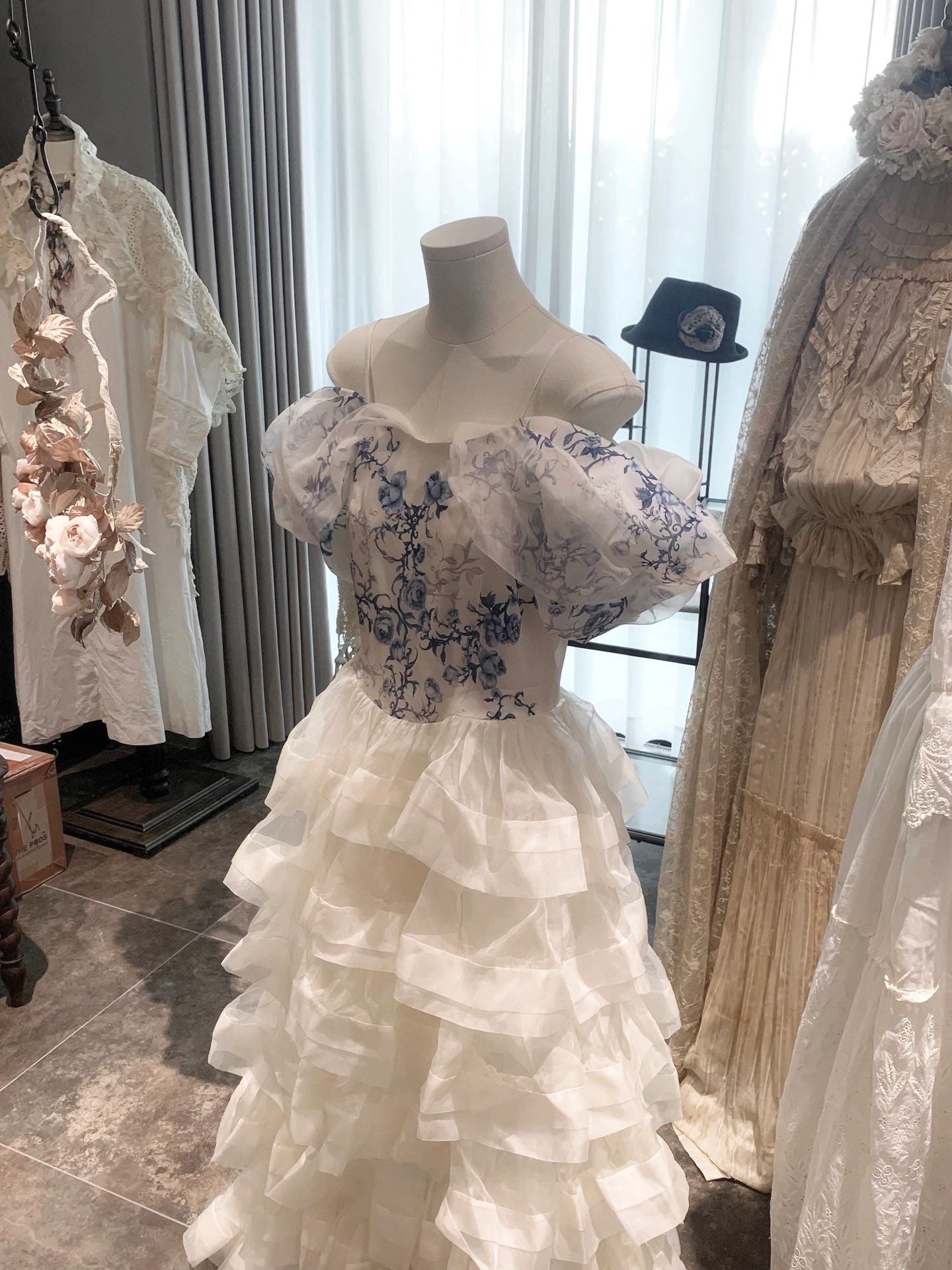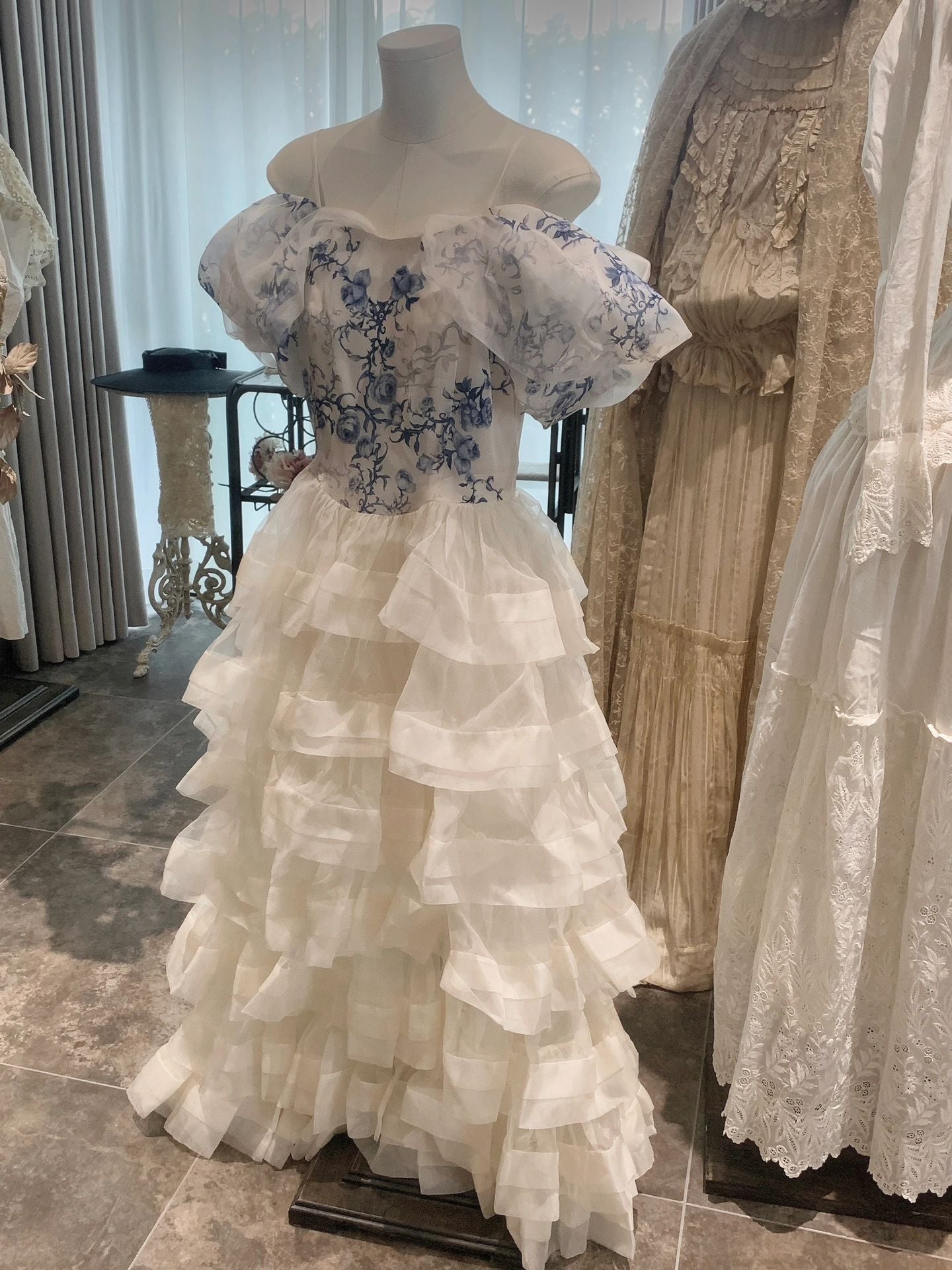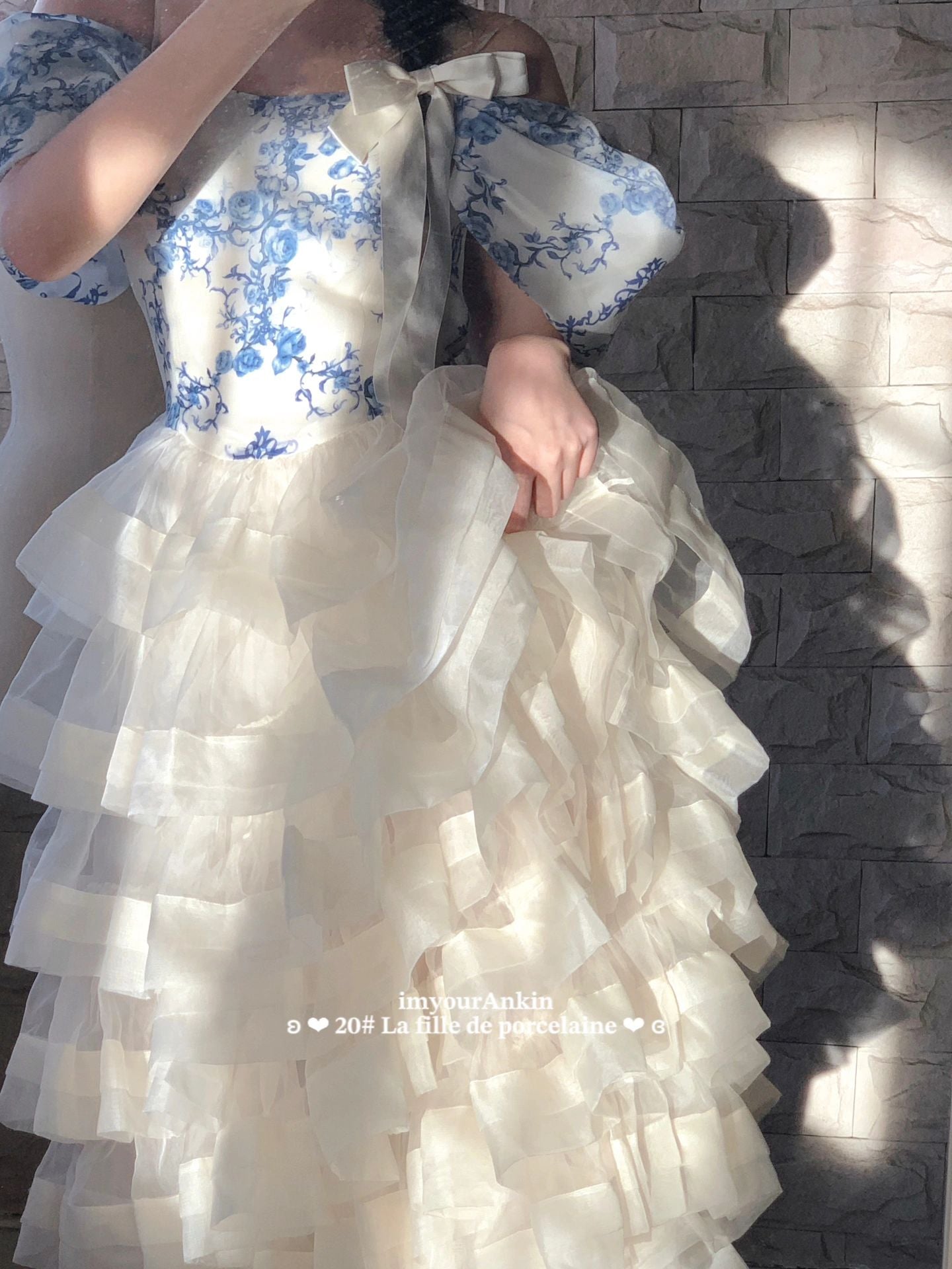 「『ニューヴィンテージ』という新しい言葉を見つけました。まるで、ヴィクトリア朝、ロココ、帝政時代の繊細でロマンチックな衣装への愛と、まさに私のために仕立てられたような気分です。こんなにも精巧でロマンチックな衣装に、私以外にも夢中な人はいるでしょうか?♥ この新しい「La fille de porcelaine(磁器の娘)」コレクションは、18世紀のヨーロッパ貴族が憧れた「神秘的な東洋文化」からインスピレーションを得ています。青と白の磁器プリントを基調に、繊細なシルクオーガンザを重ねることで、東洋の乙女が抱く神秘的でロマンチックな夢を描き出しています。