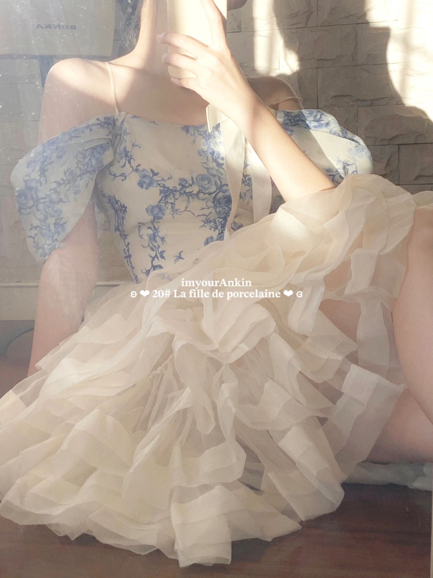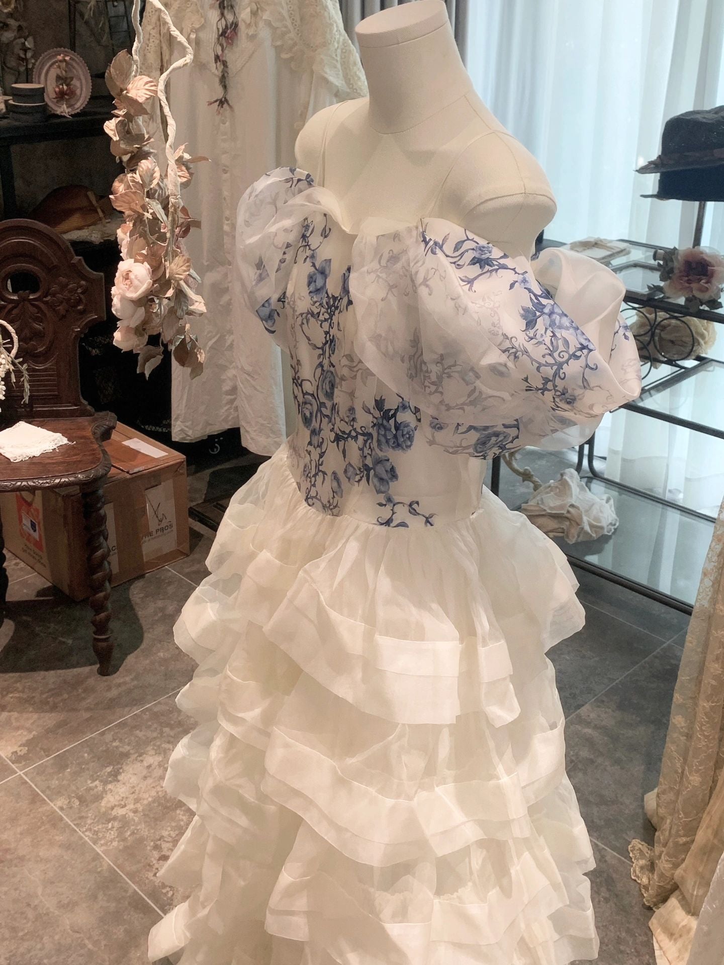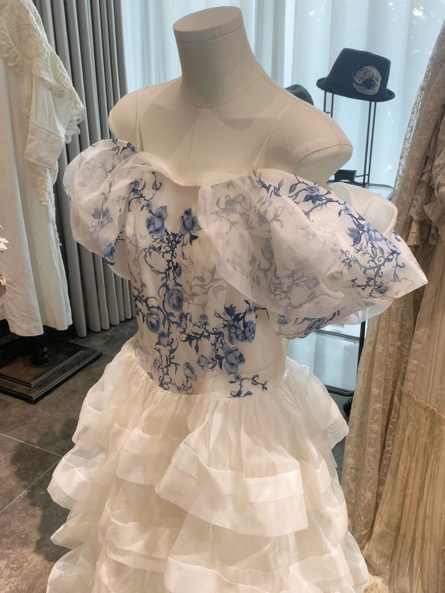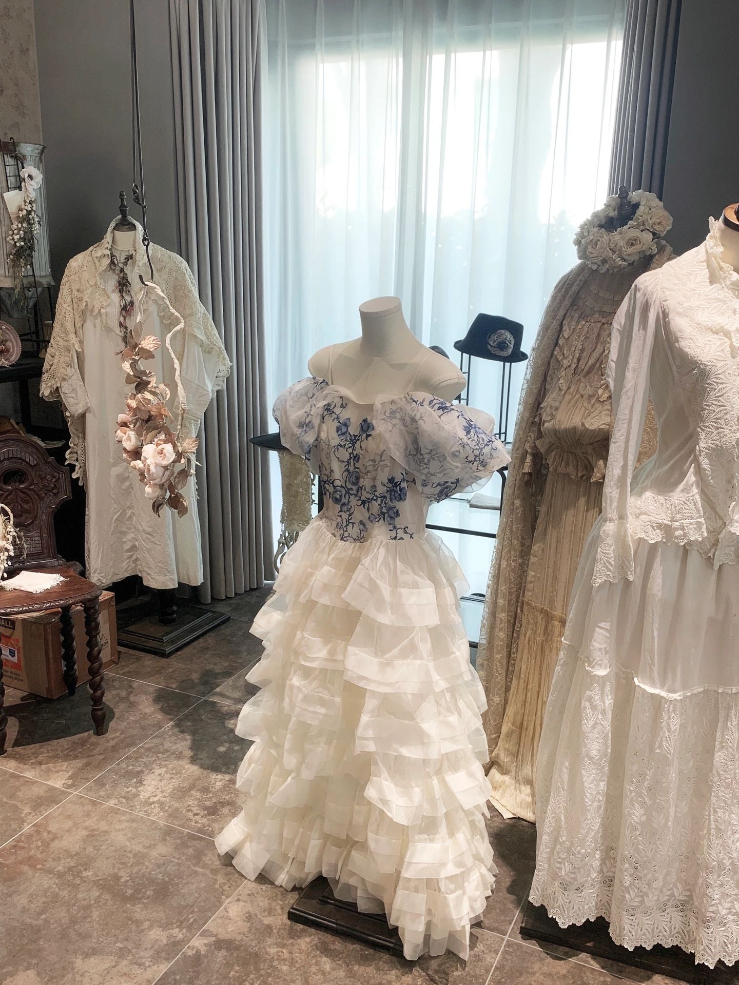 「『ニューヴィンテージ』という新しい言葉を見つけました。まるで、ヴィクトリア朝、ロココ、帝政時代の繊細でロマンチックな衣装への愛と、まさに私のために仕立てられたような気分です。こんなにも精巧でロマンチックな衣装に、私以外にも夢中な人はいるでしょうか?♥ この新しい「La fille de porcelaine(磁器の娘)」コレクションは、18世紀のヨーロッパ貴族が憧れた「神秘的な東洋文化」からインスピレーションを得ています。青と白の磁器プリントを基調に、繊細なシルクオーガンザを重ねることで、東洋の乙女が抱く神秘的でロマンチックな夢を描き出しています。