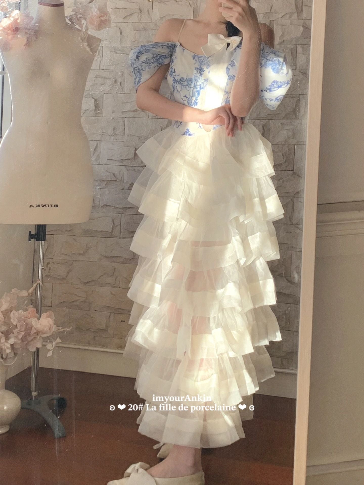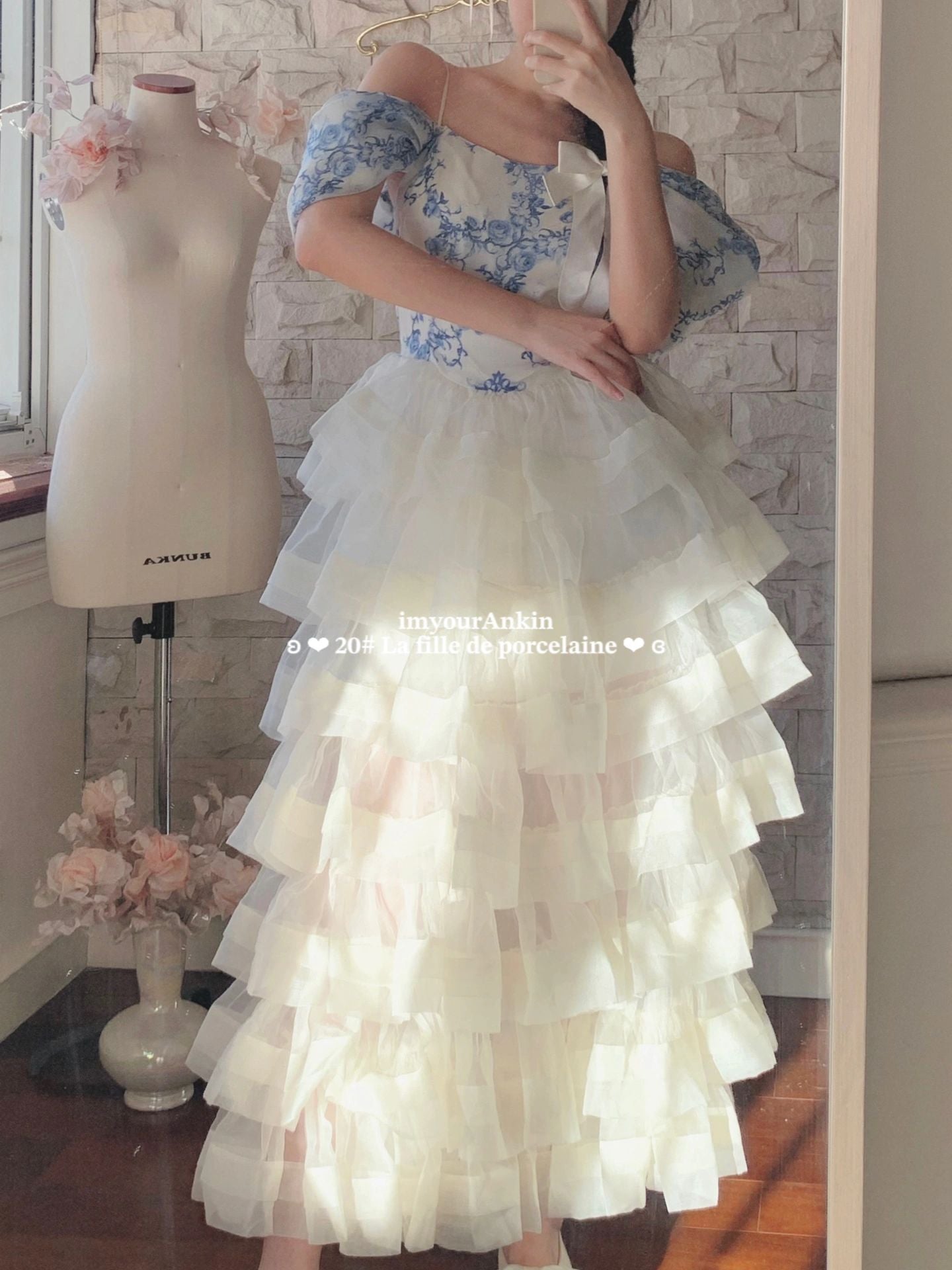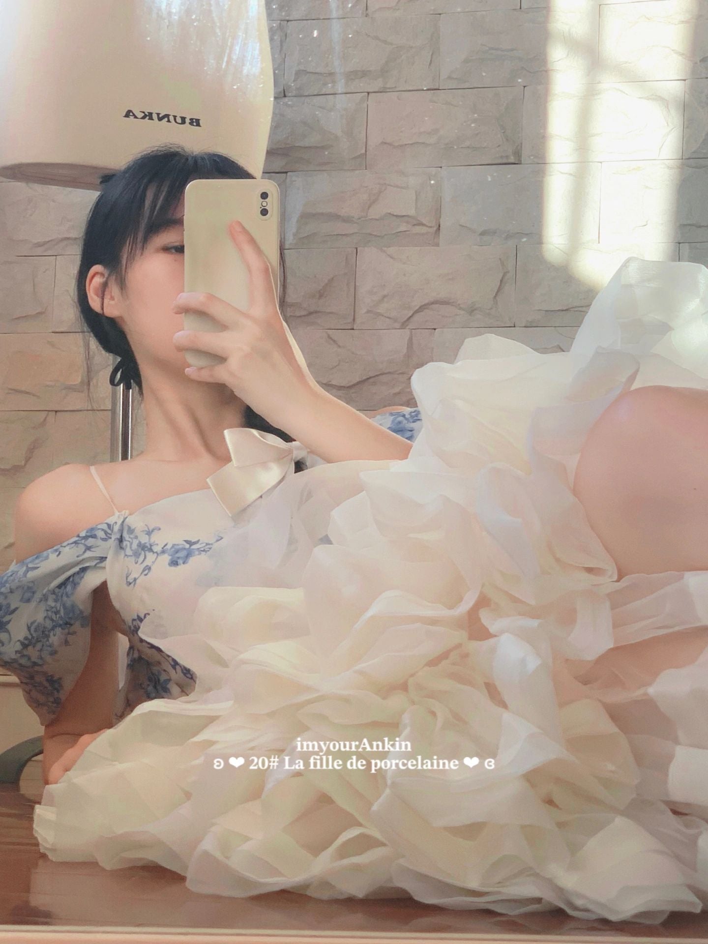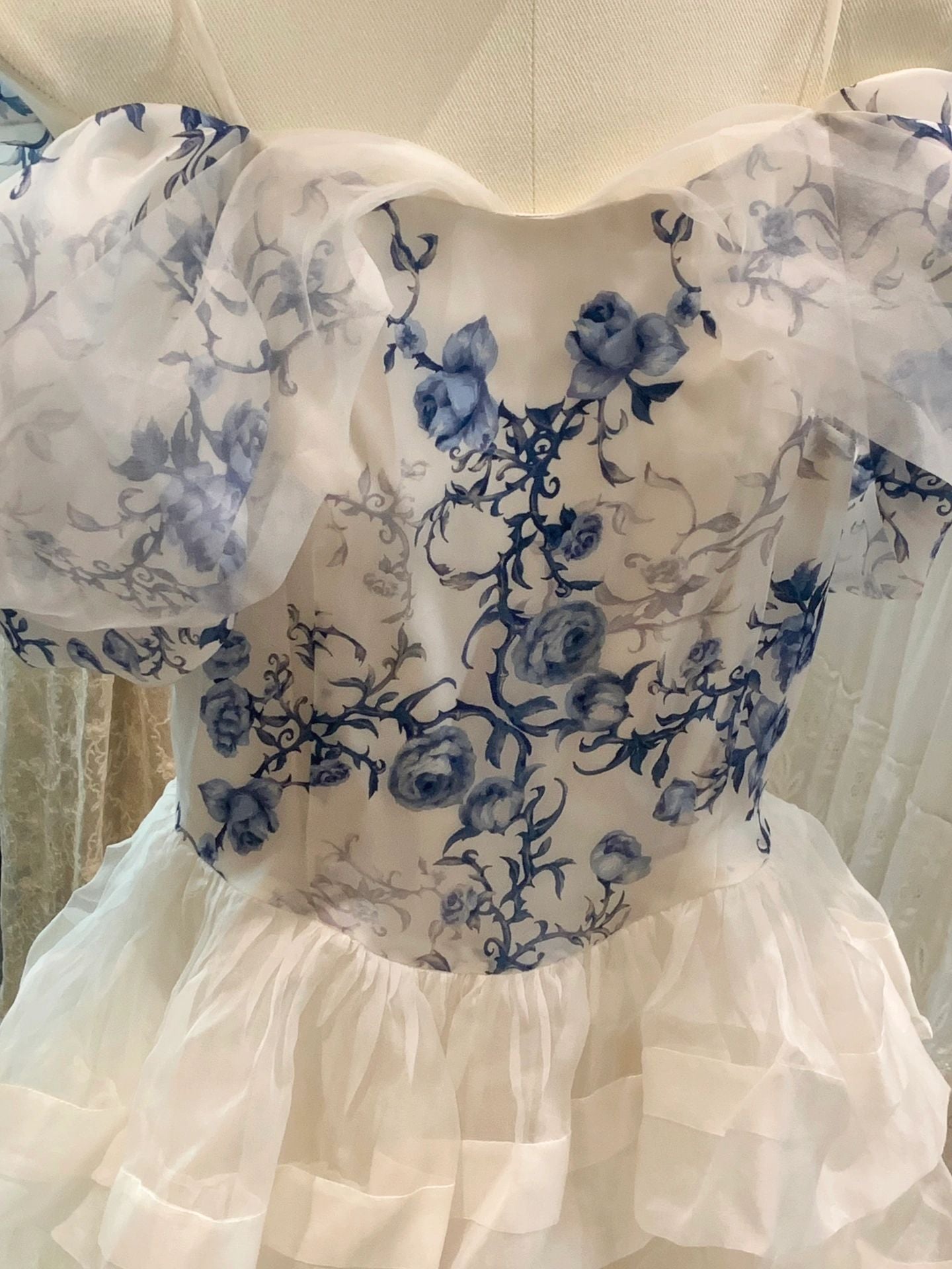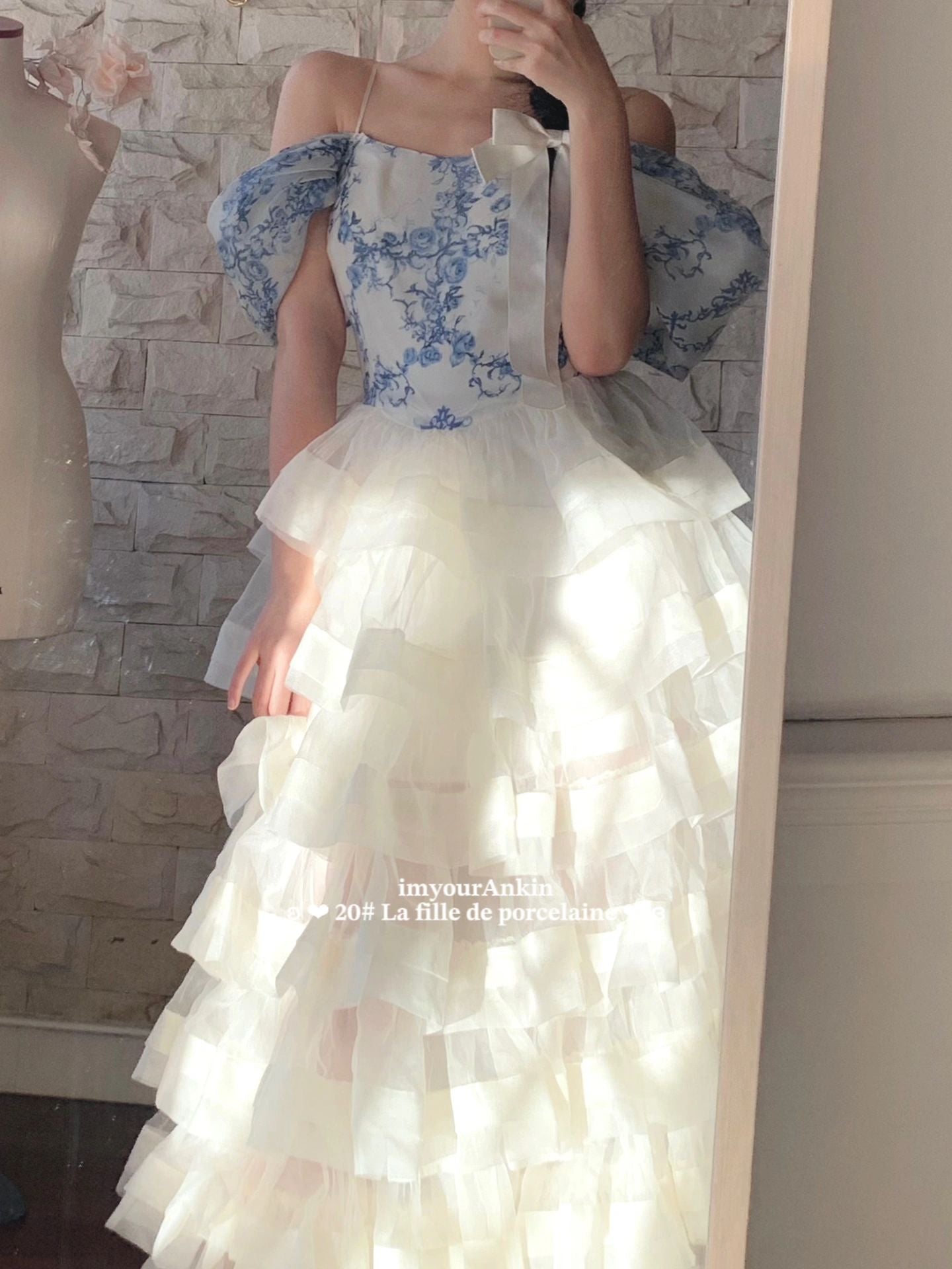 「『ニューヴィンテージ』という新しい言葉を見つけました。まるで、ヴィクトリア朝、ロココ、帝政時代の繊細でロマンチックな衣装への愛と、まさに私のために仕立てられたような気分です。こんなにも精巧でロマンチックな衣装に、私以外にも夢中な人はいるでしょうか?♥ この新しい「La fille de porcelaine(磁器の娘)」コレクションは、18世紀のヨーロッパ貴族が憧れた「神秘的な東洋文化」からインスピレーションを得ています。青と白の磁器プリントを基調に、繊細なシルクオーガンザを重ねることで、東洋の乙女が抱く神秘的でロマンチックな夢を描き出しています。