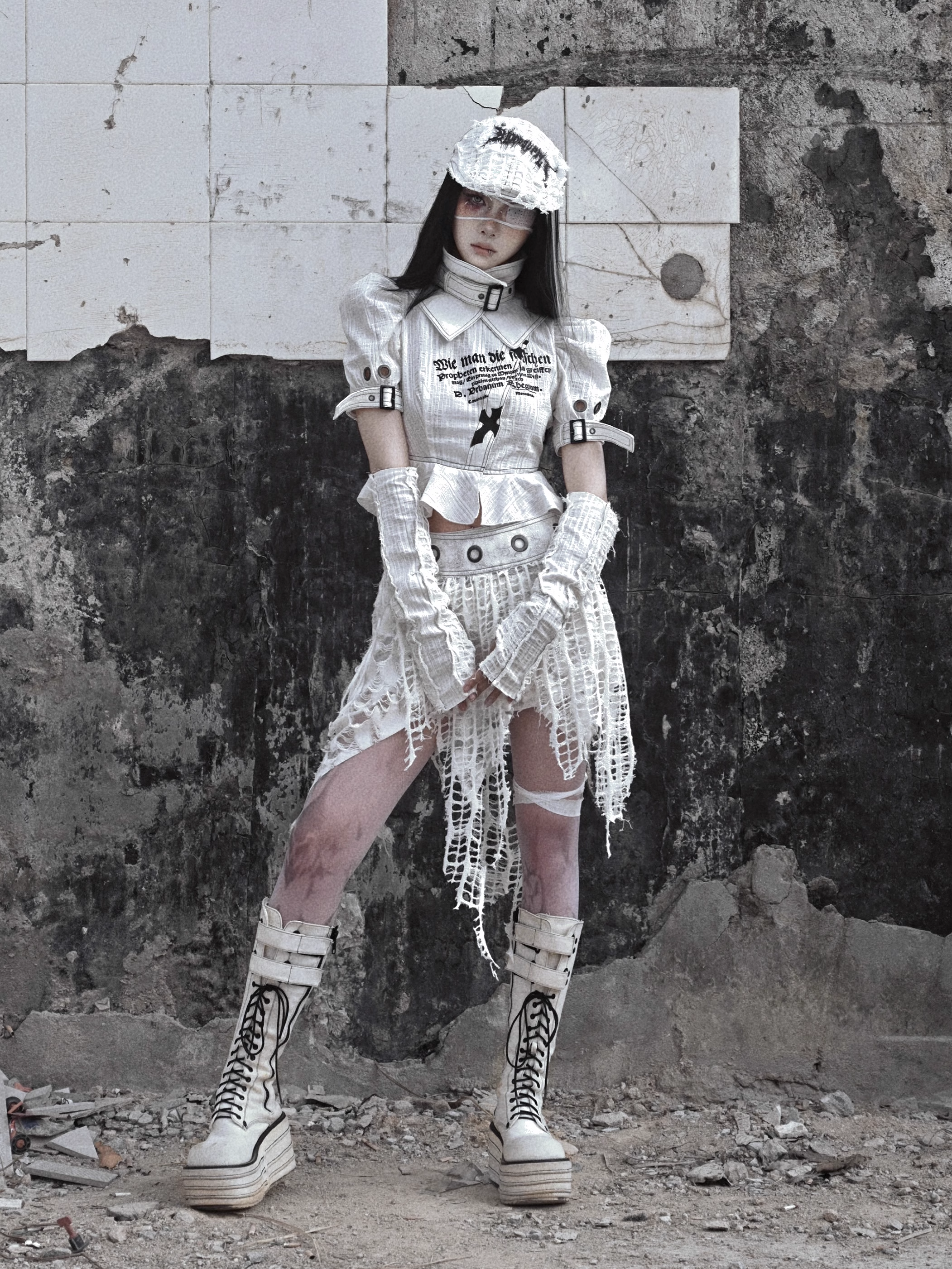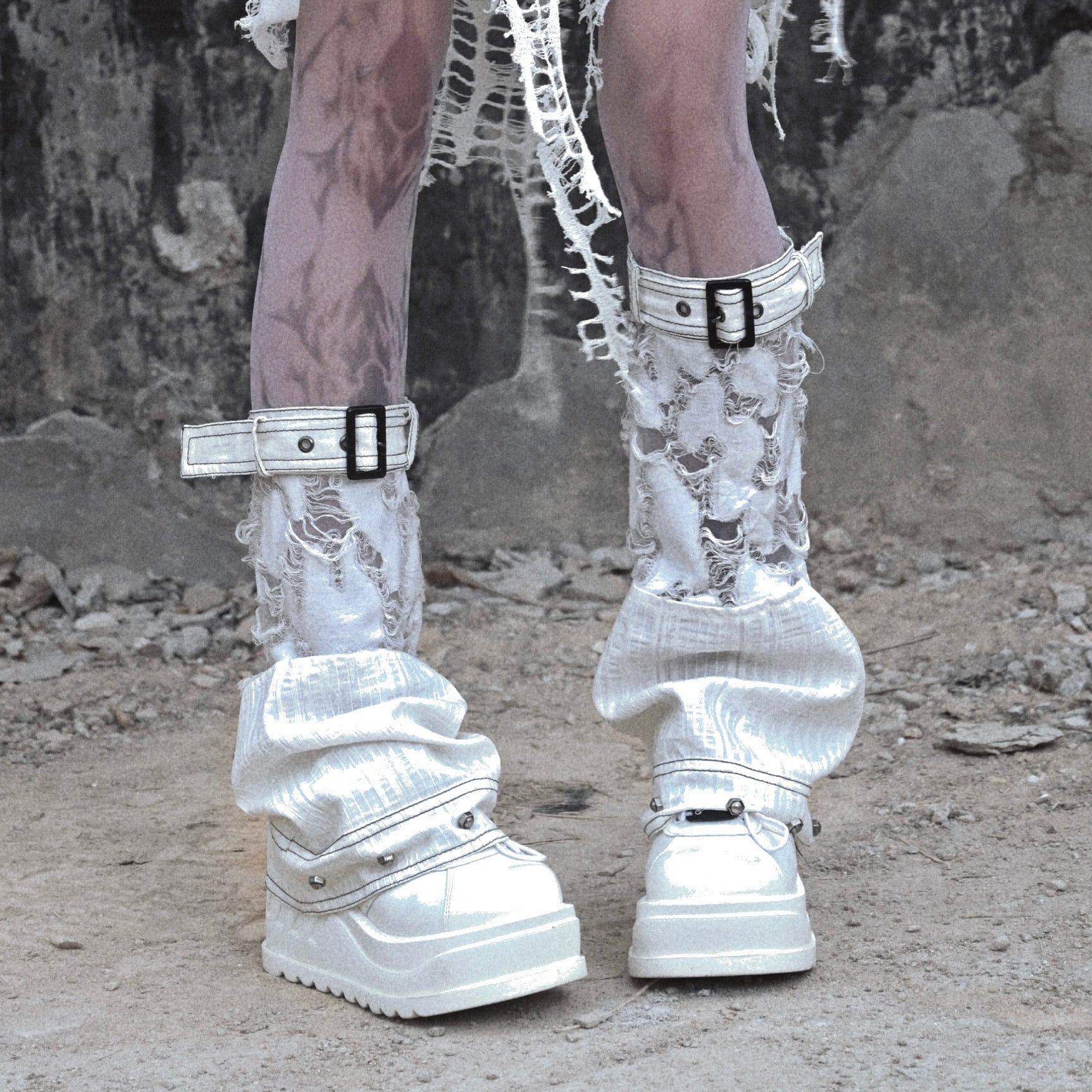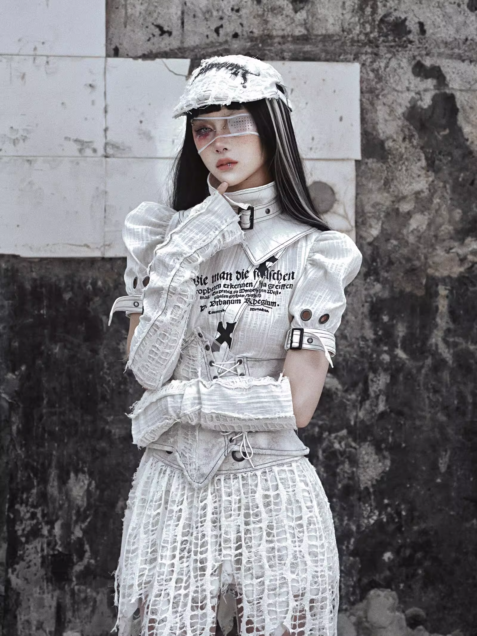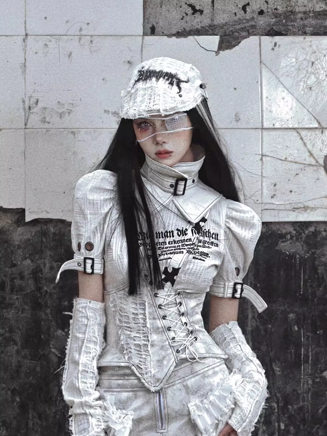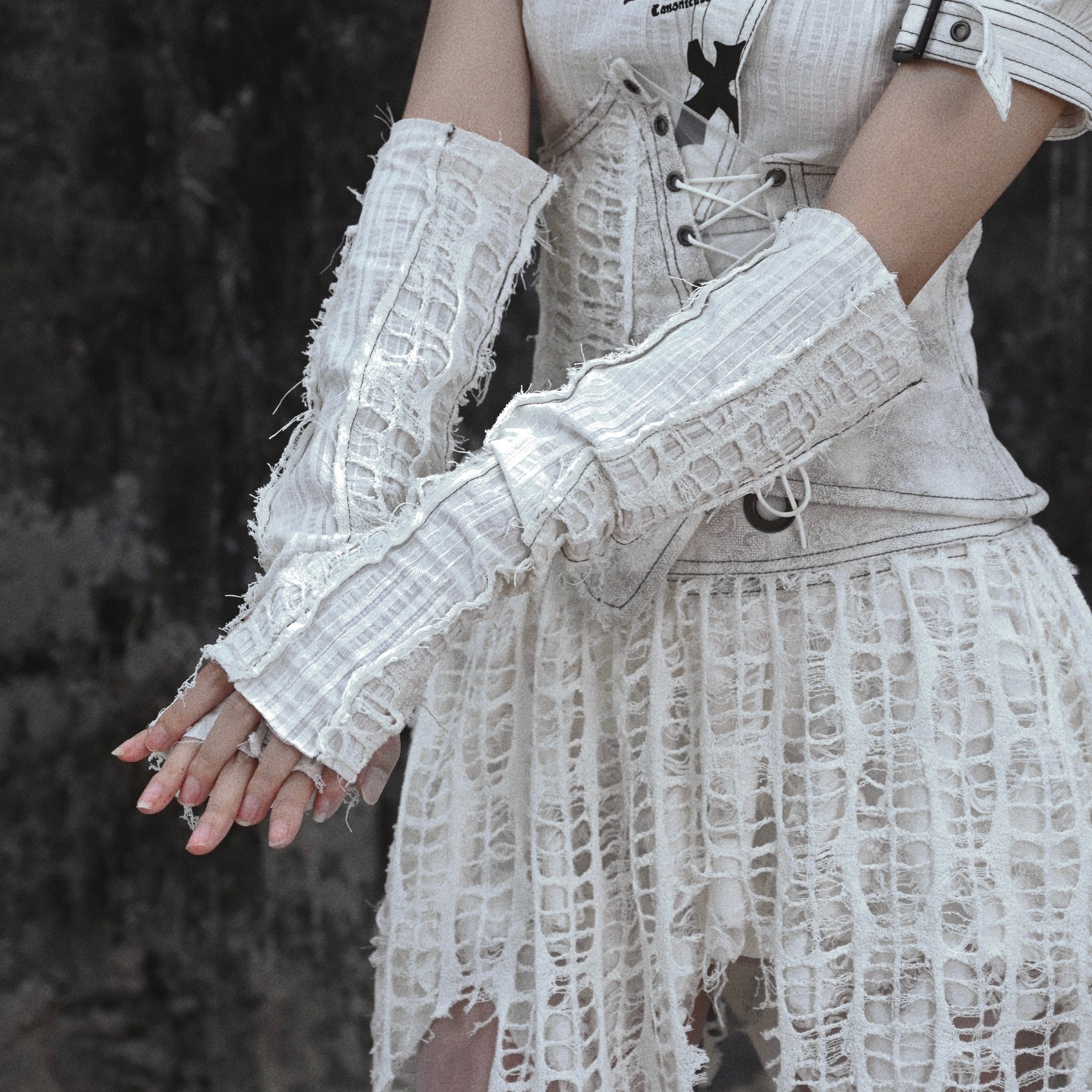 アームスリーブ:このアームスリーブは、意図的にダメージ加工を施したコットンとリネンの混紡生地で作られており、スタイリッシュでエッジの効いた外観を提供します。