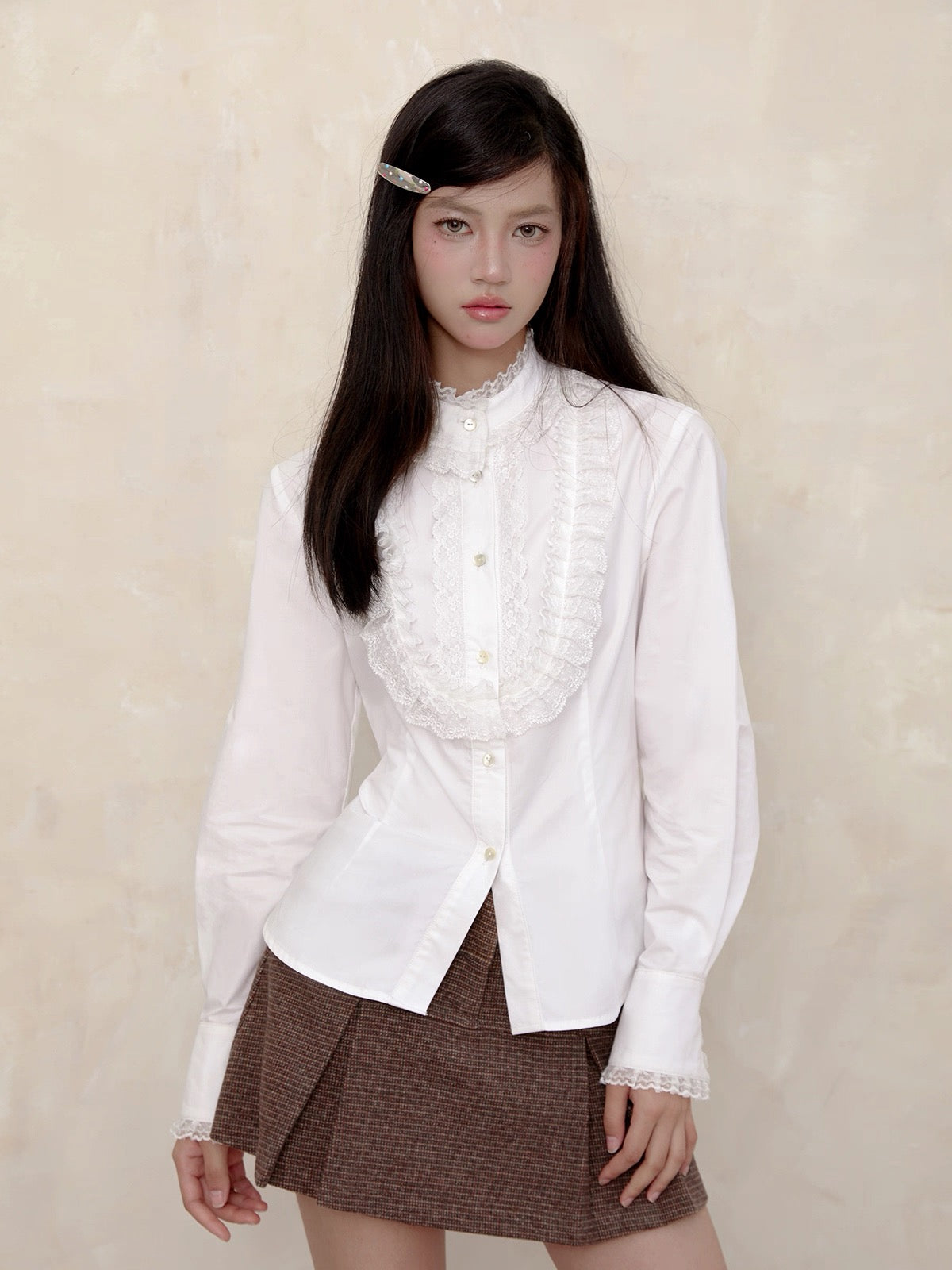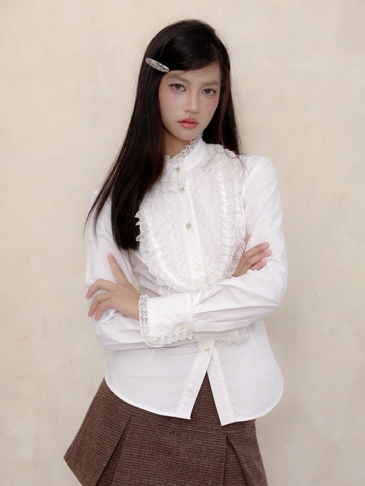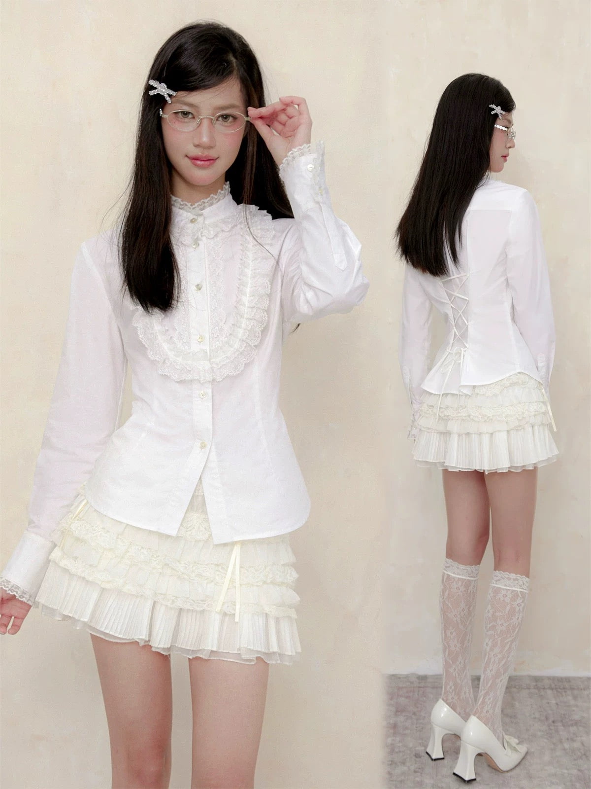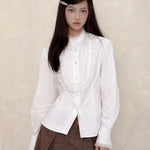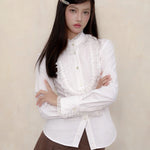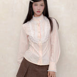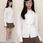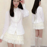 A touch of vintage nobility, softened with modern sweetness. This KiraYura blouse features a delicate high lace collar, cascading front ruffles, and subtle pearl-like buttons that whisper elegance. The tailored waist is adorned with a romantic corset-style ribbon back—adjustable and graceful like a doll’s silhouette from a storybook.