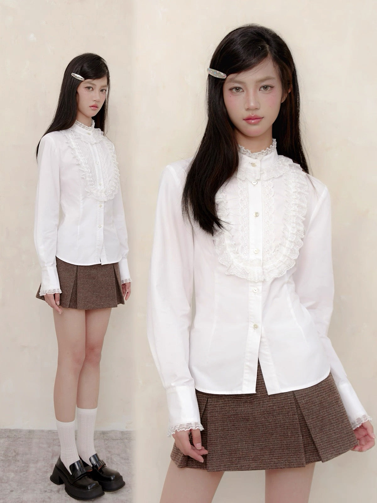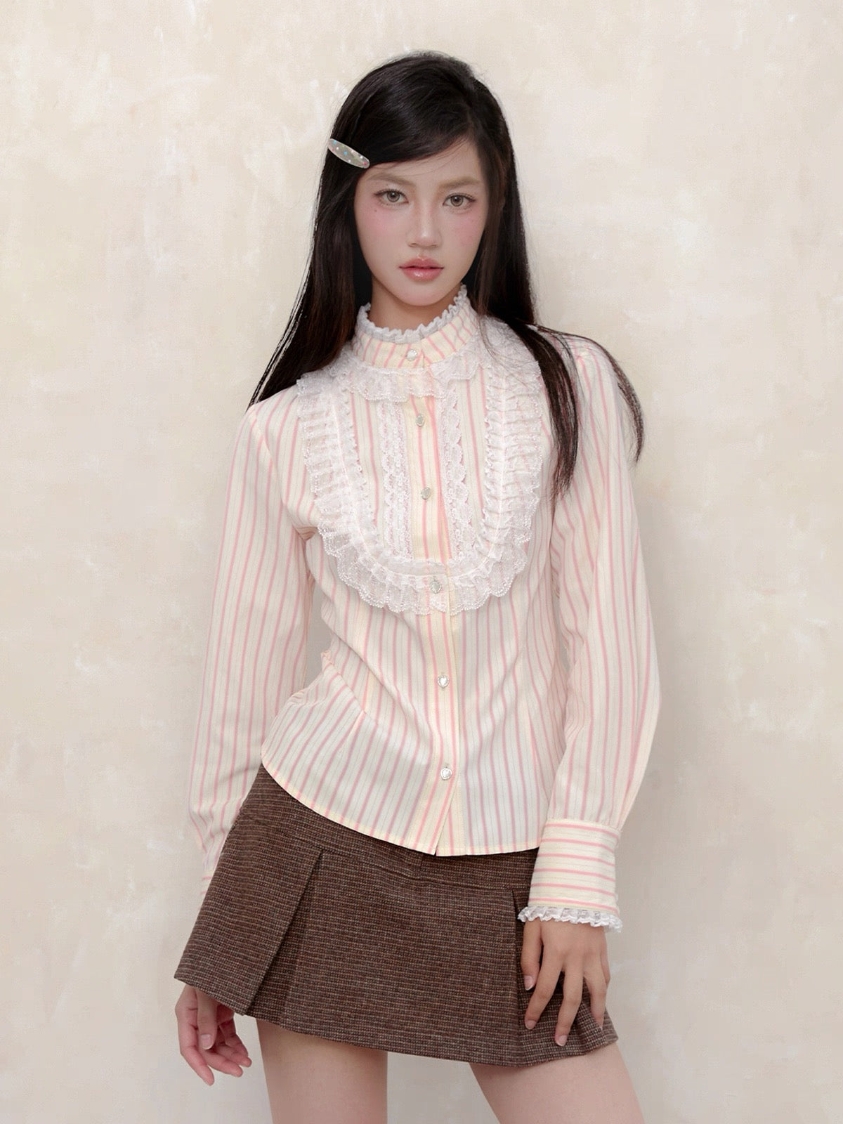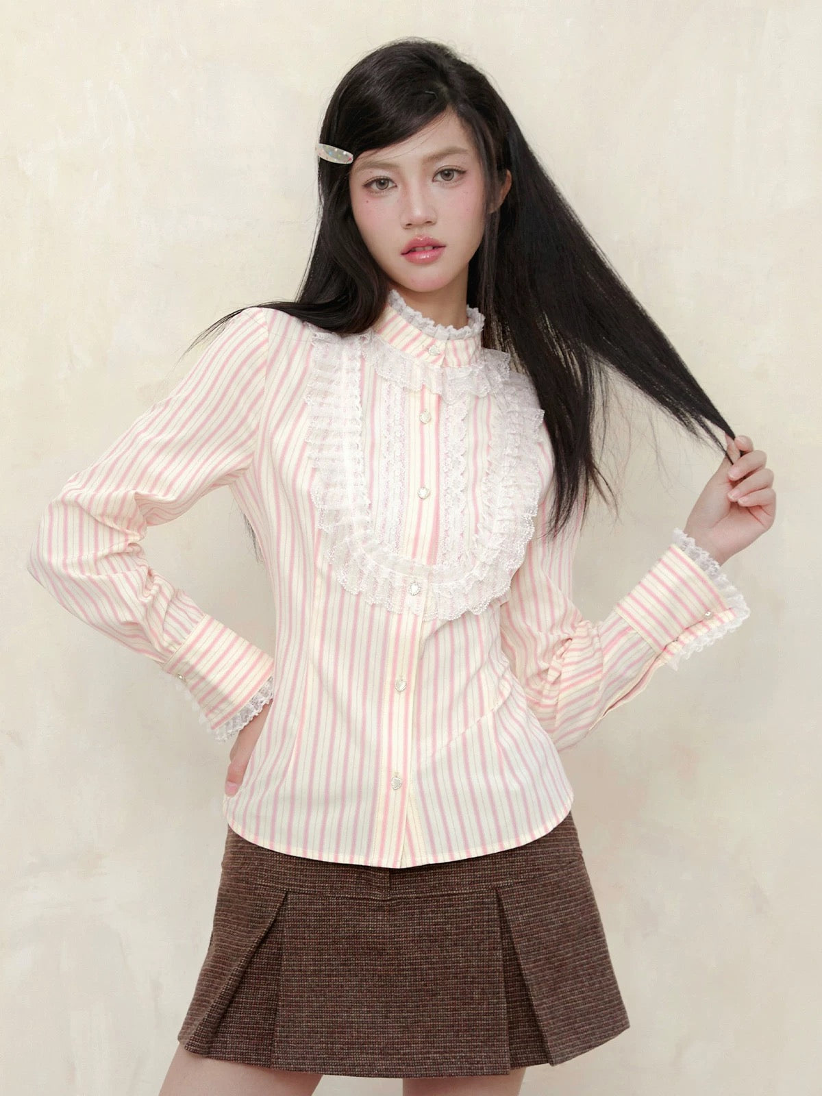 A touch of vintage nobility, softened with modern sweetness. This KiraYura blouse features a delicate high lace collar, cascading front ruffles, and subtle pearl-like buttons that whisper elegance. The tailored waist is adorned with a romantic corset-style ribbon back—adjustable and graceful like a doll’s silhouette from a storybook.