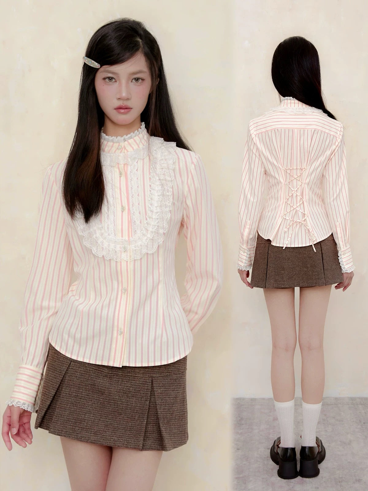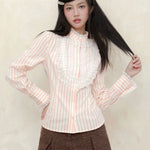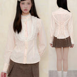 Available in classic white or soft striped pastel, this piece pairs effortlessly with skirts, jumpers, or bloomers, perfect for every romantic girl’s wardrobe—from café moments to secret garden strolls.