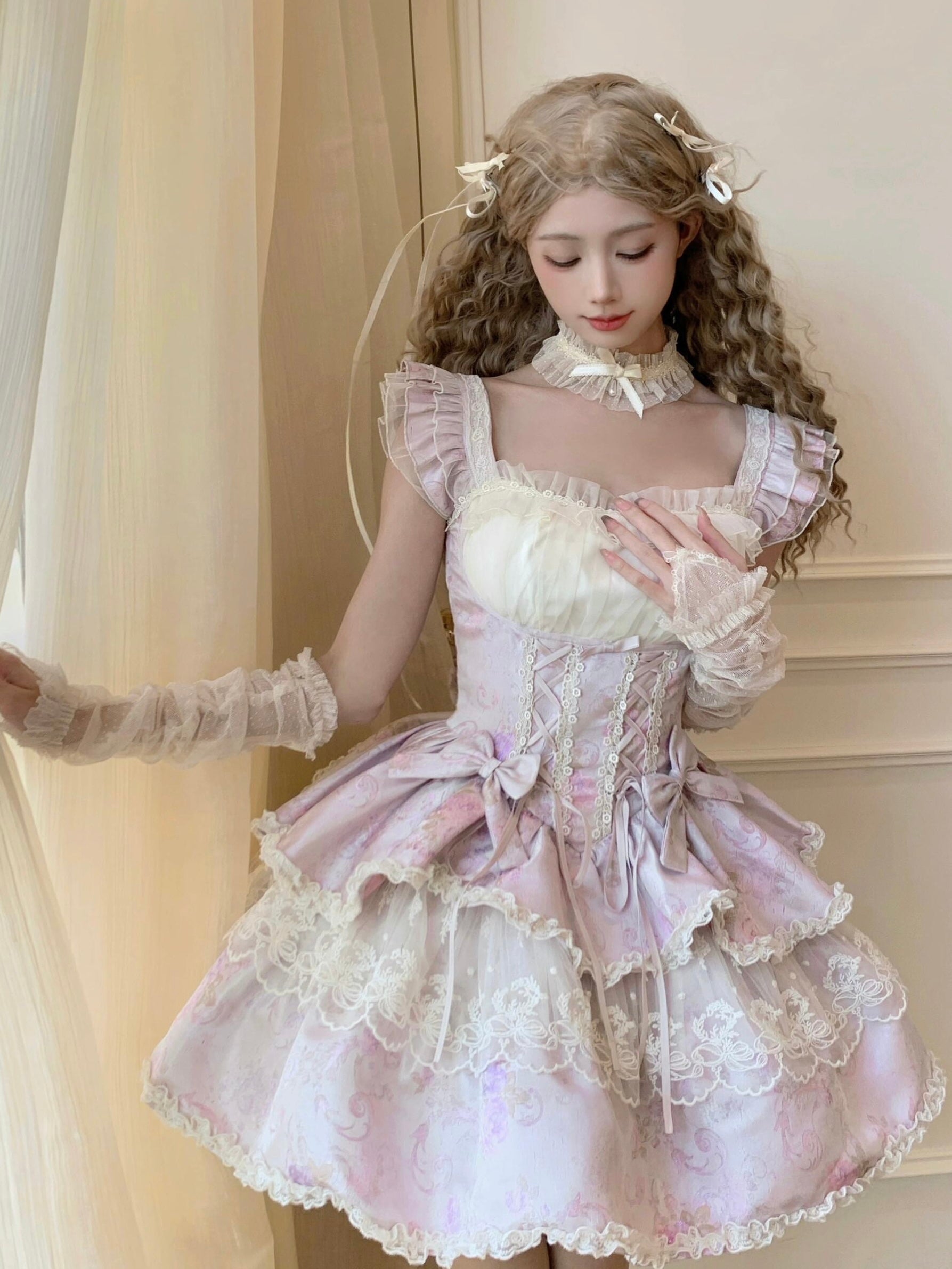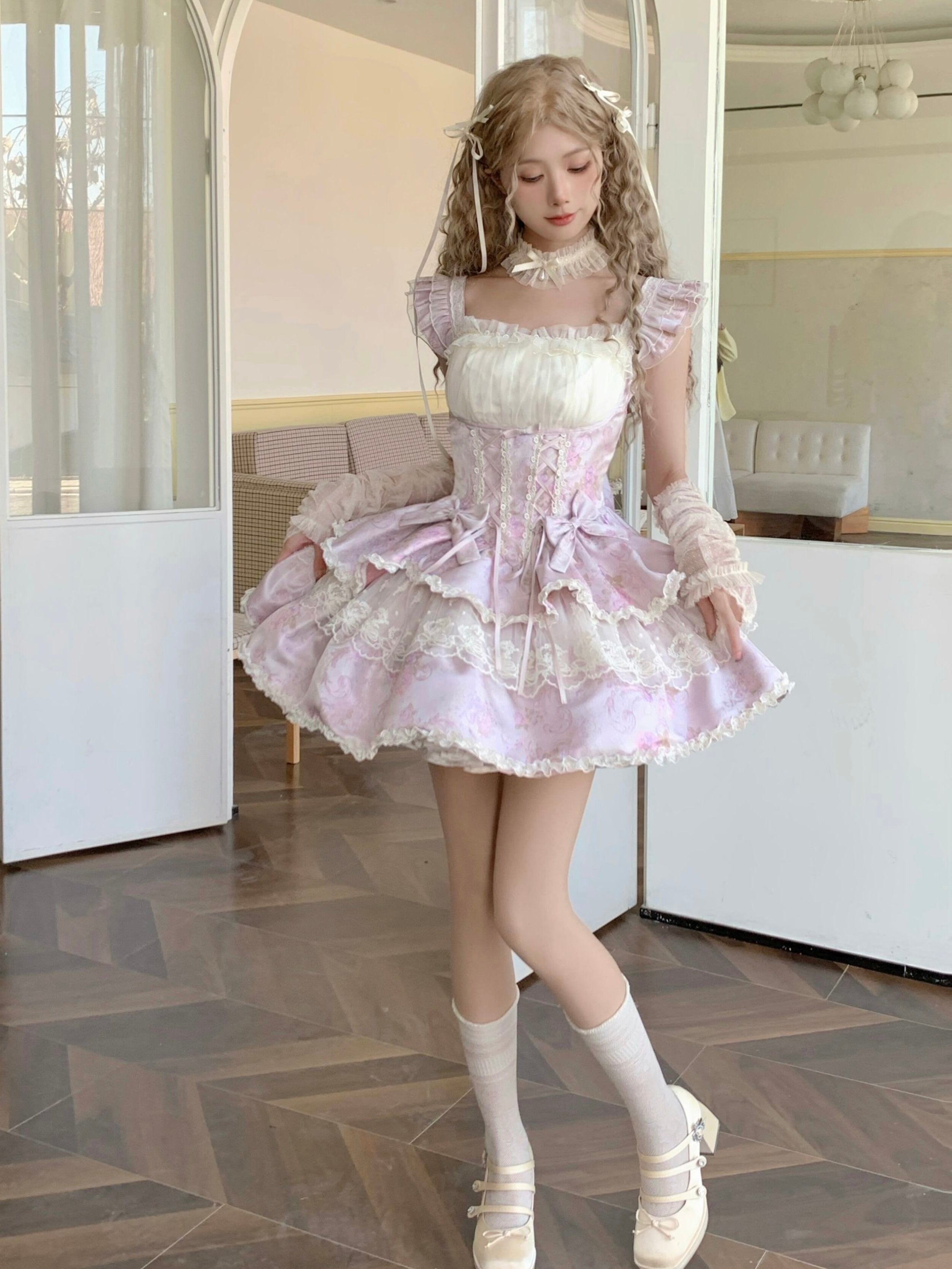 モデルはボリュームを出すためにインナーペチコートを着用したXSサイズを着用しています。ペチコートは付属しておりません。