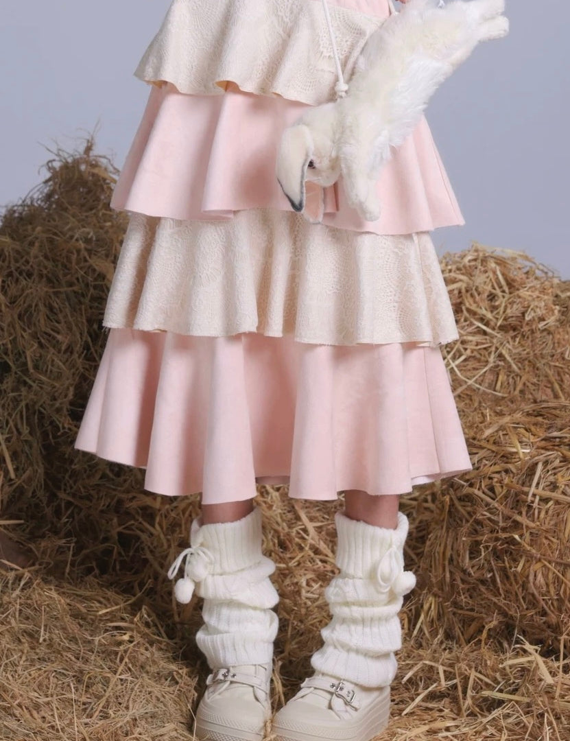 Girl wearing a pink peiliee design cottonn babydoll top and white skirt holding a plush bunny.