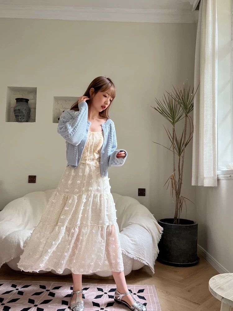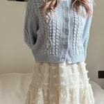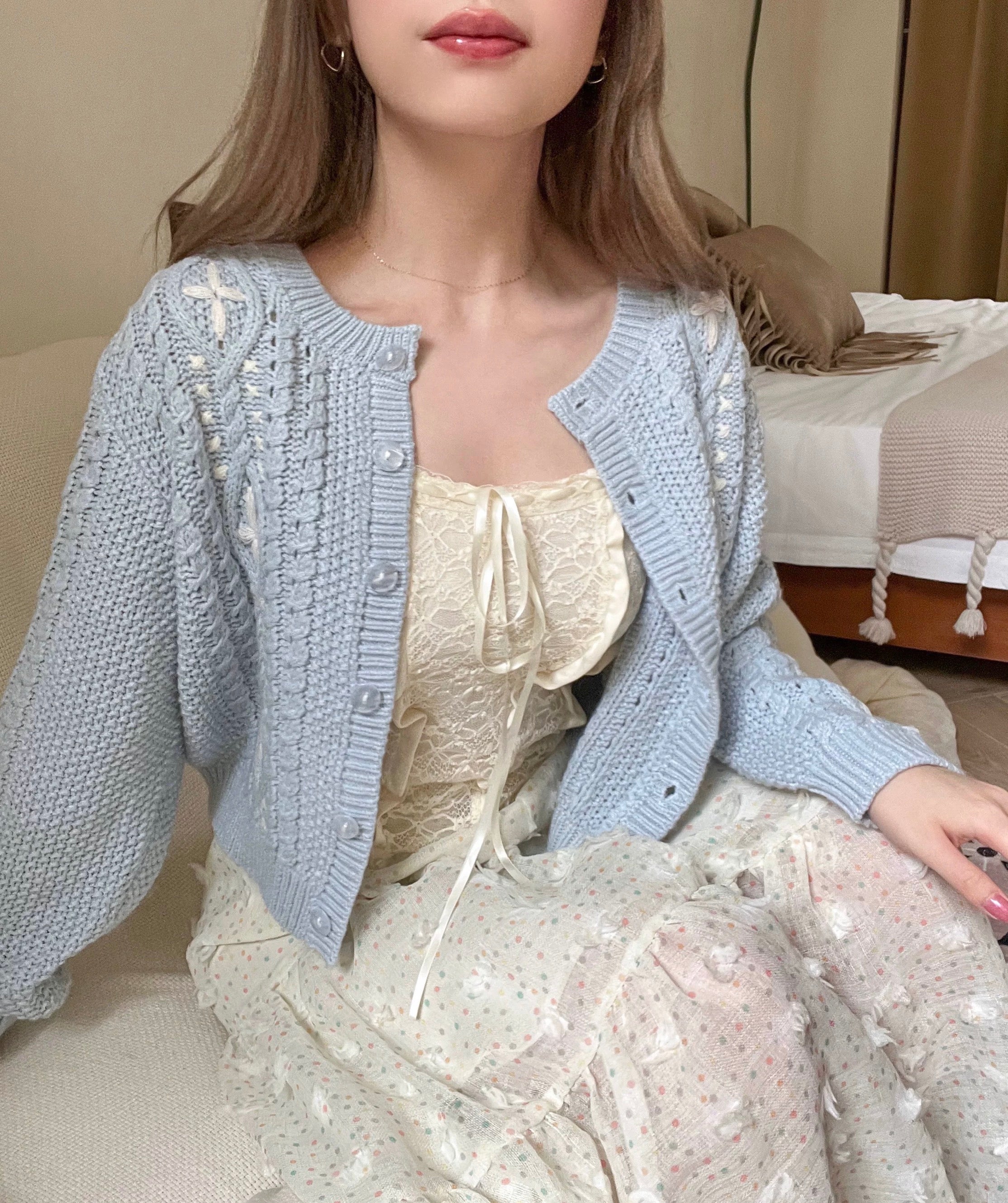Perfect for layering over lace camisoles, pastel dresses, or pairing with a velvet ribbon in your hair, this cardigan brings a coquette mood to everyday moments. It’s babydoll sweetness make it a wardrobe treasure for dreamy afternoons, cozy cafés, or strolling through a pastel winter wonderland.