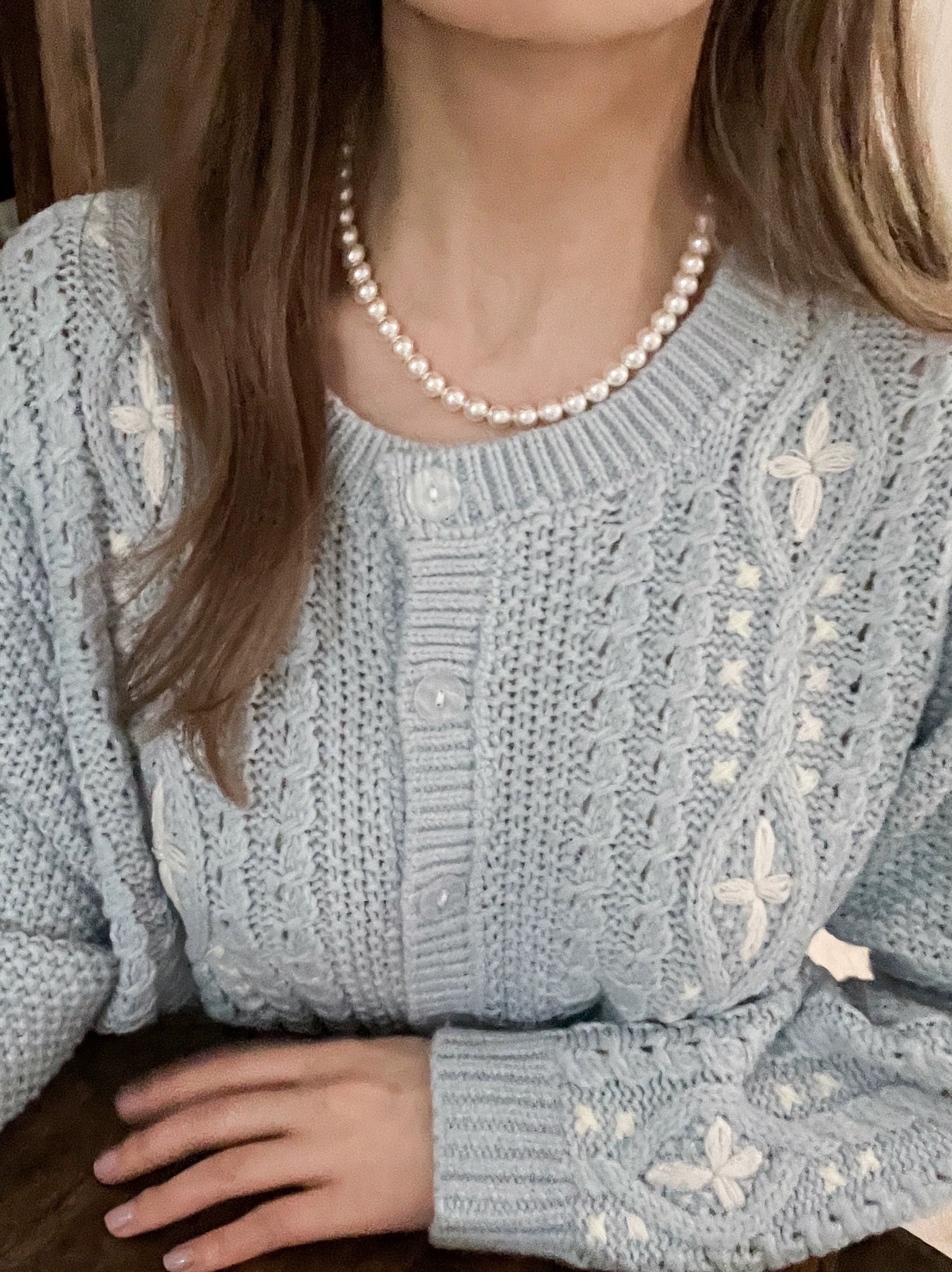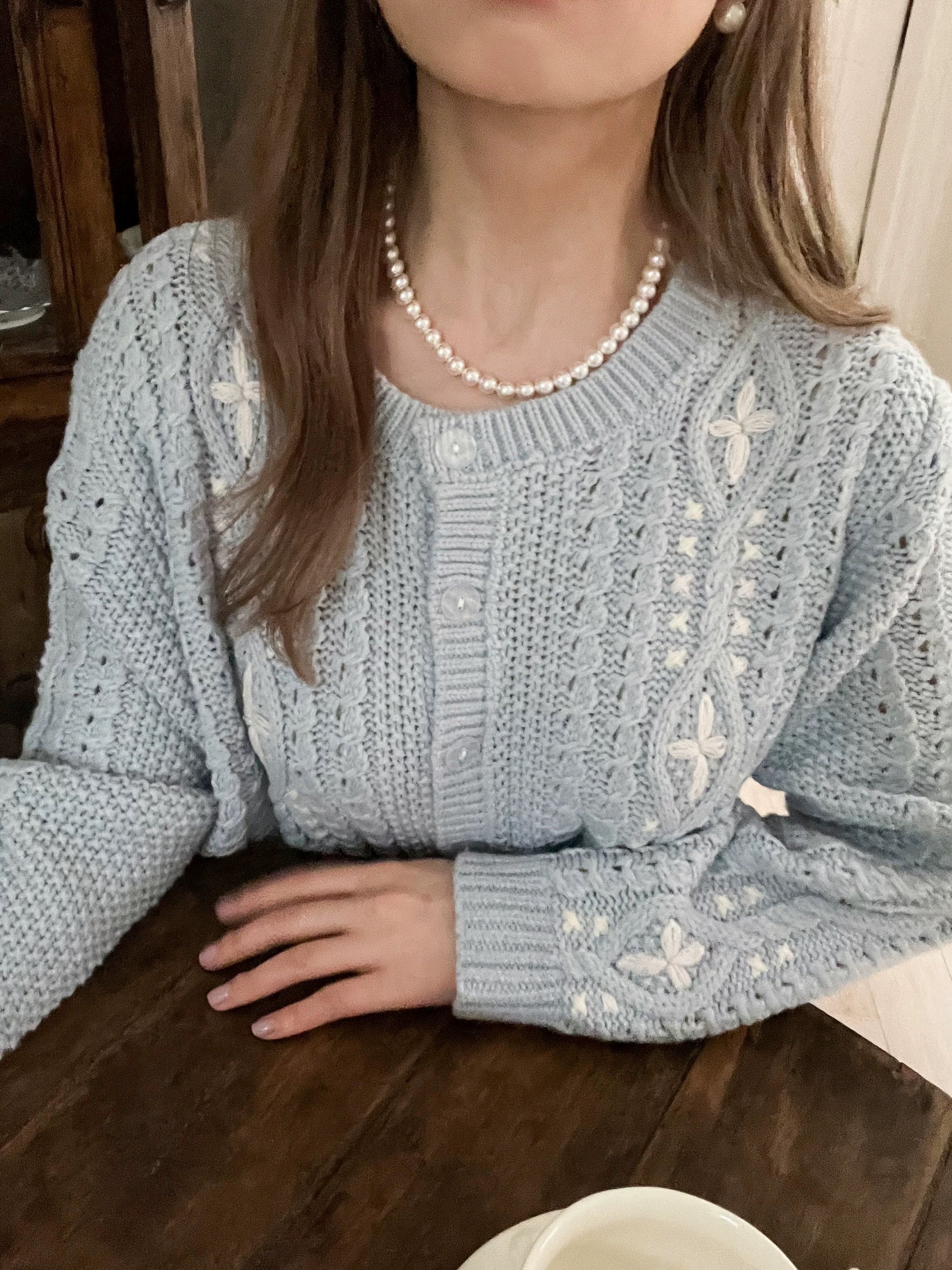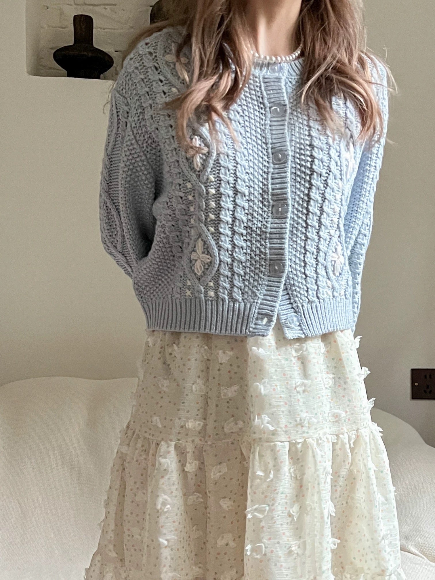 Delicate pastel-blue yarn is woven into sweet vintage patterns, accented with soft ivory embroidery that looks like little snowflakes resting on clouds.