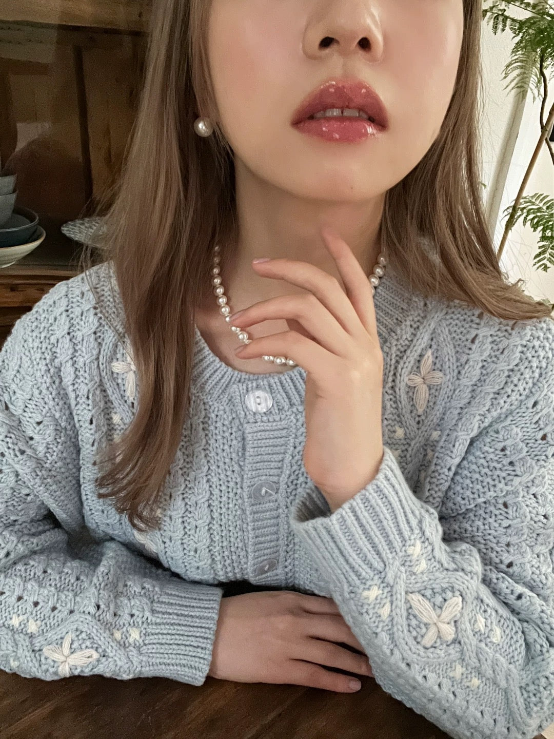 A cardigan as light and tender as a snow angel’s whisper—made for girls who love Larme-kei romanticism, bows, pearls, and the magic of soft knitwear.