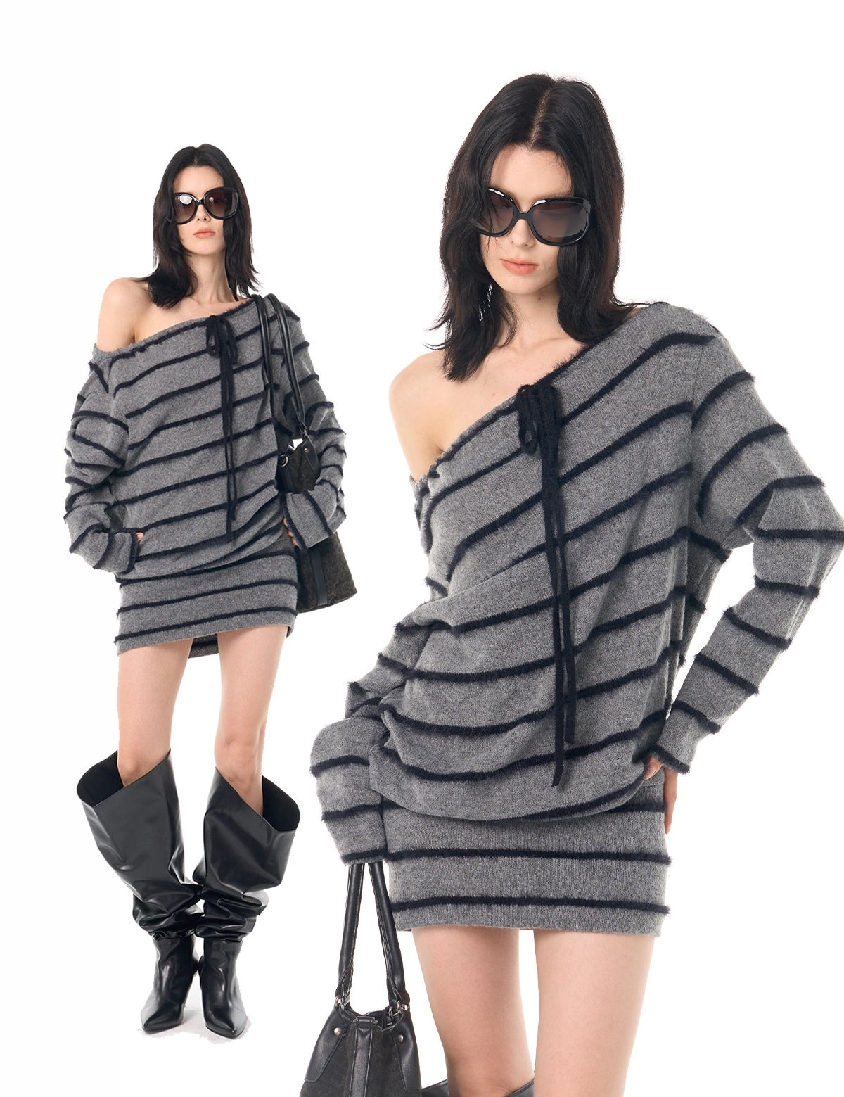 34Ounce Striped Wool Blend Off-Shoulder Mini Dress