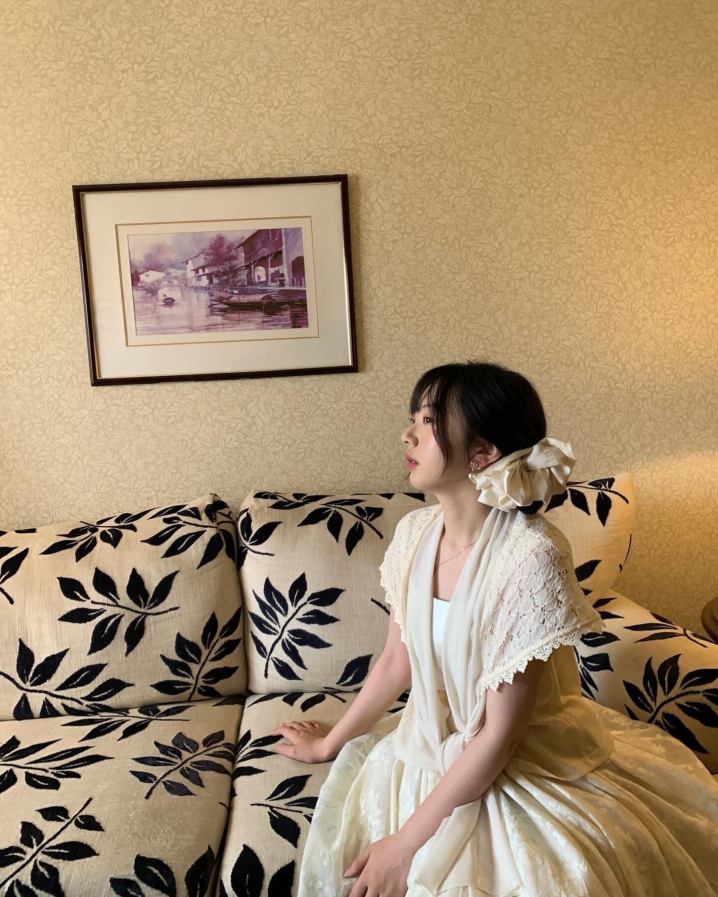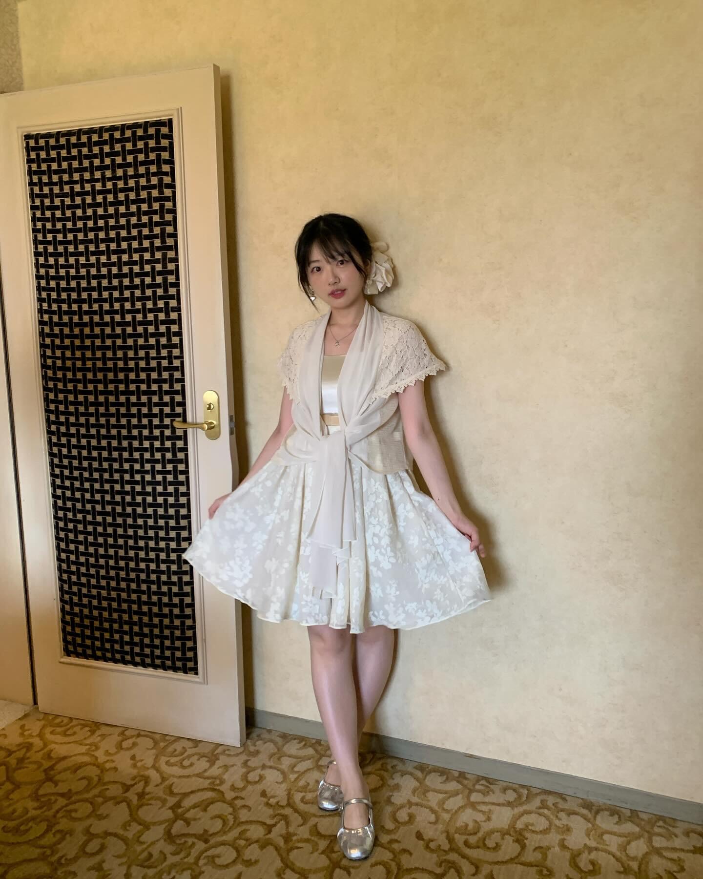 スカートの裾にはほんのり透け感のある刺繍が施されており、軽やかでフェミニンな雰囲気に。