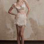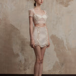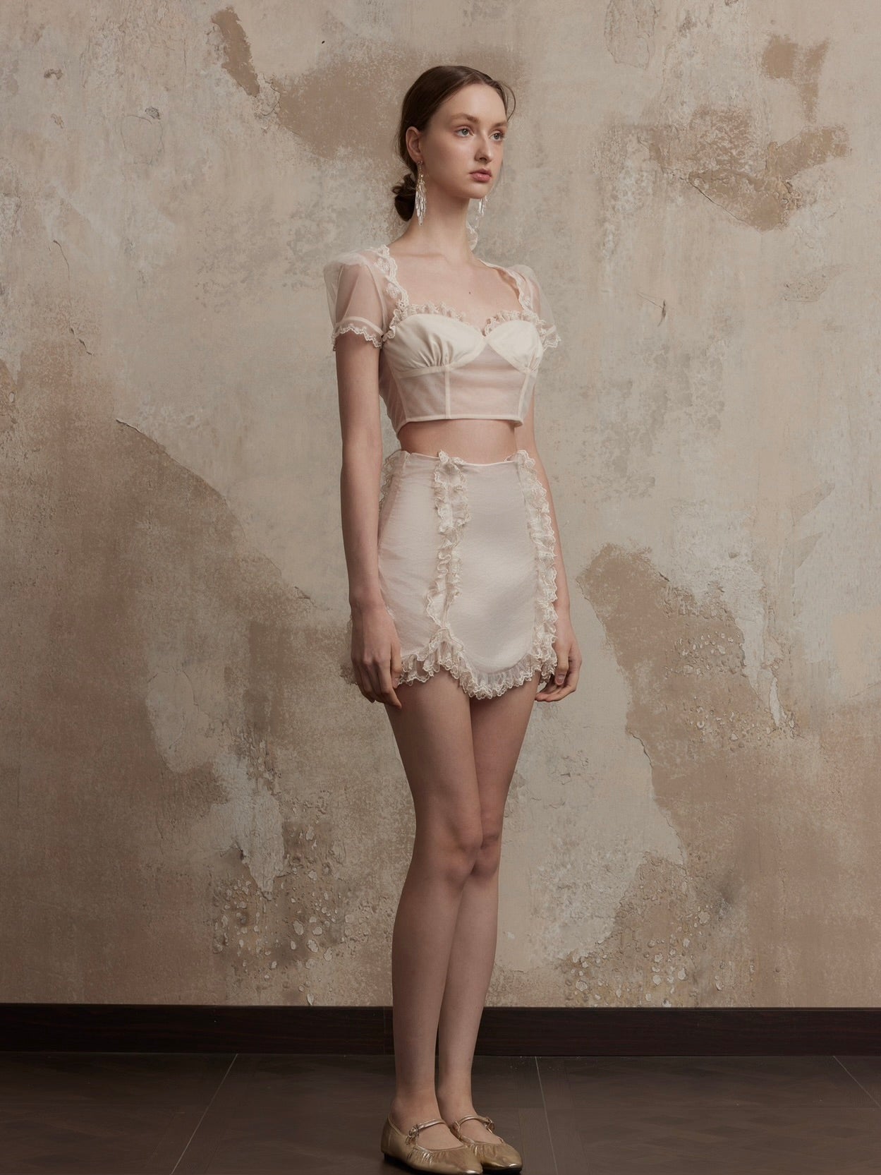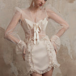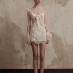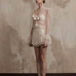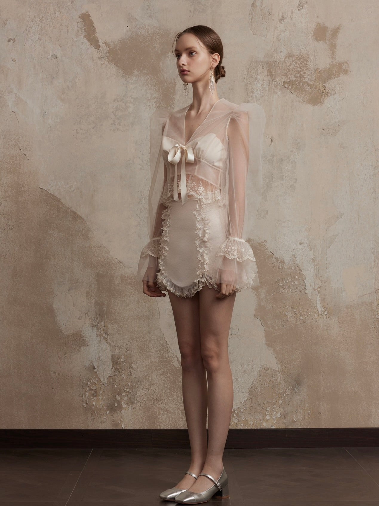 透け感のあるヌードメッシュで織り上げられたルー・ドゥ・ルン」スカートは、優美なタッチで肌を優しく包み込みます。袖口と裾にあしらわれた繊細なレースのディテールが、洗練されたロマンスを演出します。エレガントなVネックラインにはサテンリボンとバタフライノットがあしらわれ、優雅さと洗練さが絶妙なバランスで調和されています。