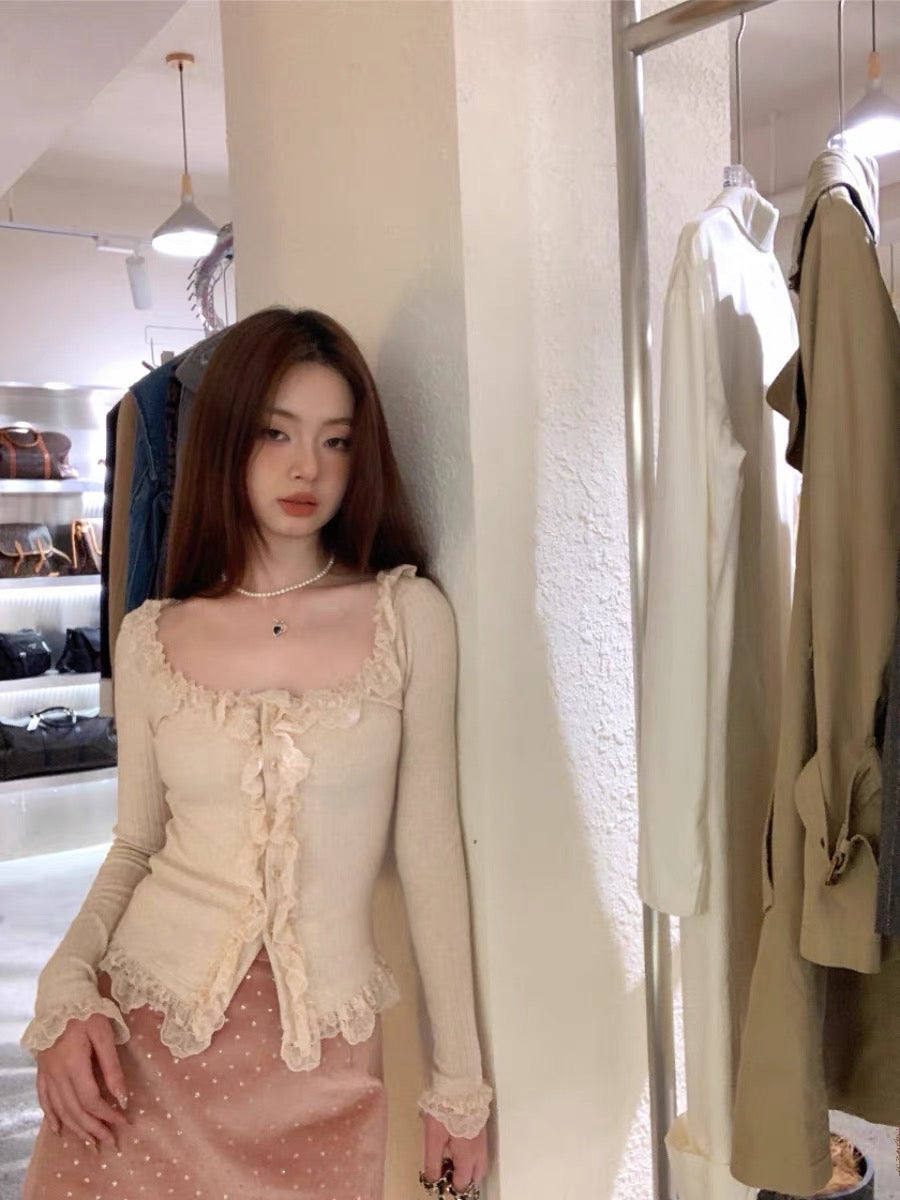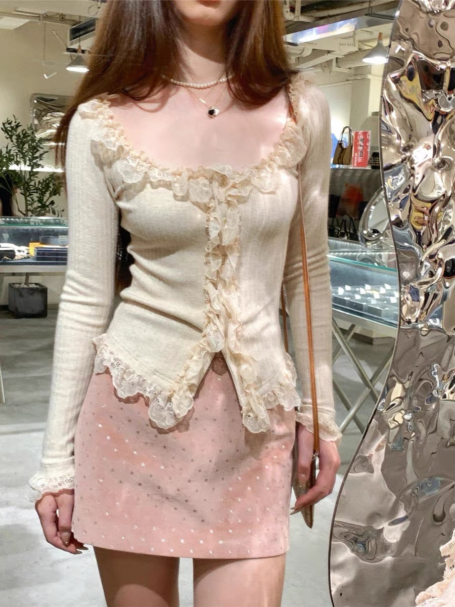 「ピーチピンクレースカーディガン」のご紹介です!繊細なレースを贅沢に使用したオープンフロントのカーディガンは、カジュアルな着心地と女性らしいエレガントさを両立。