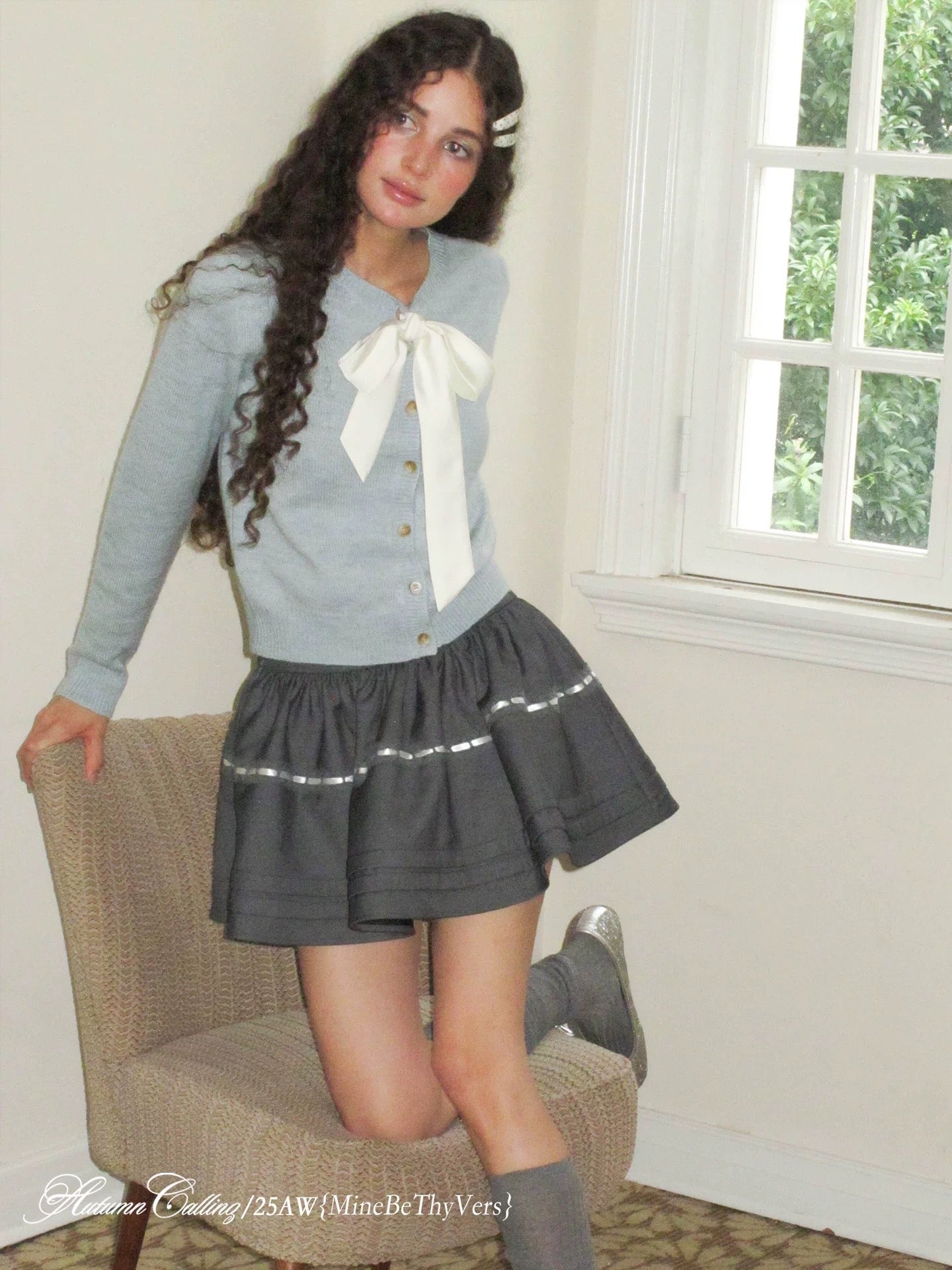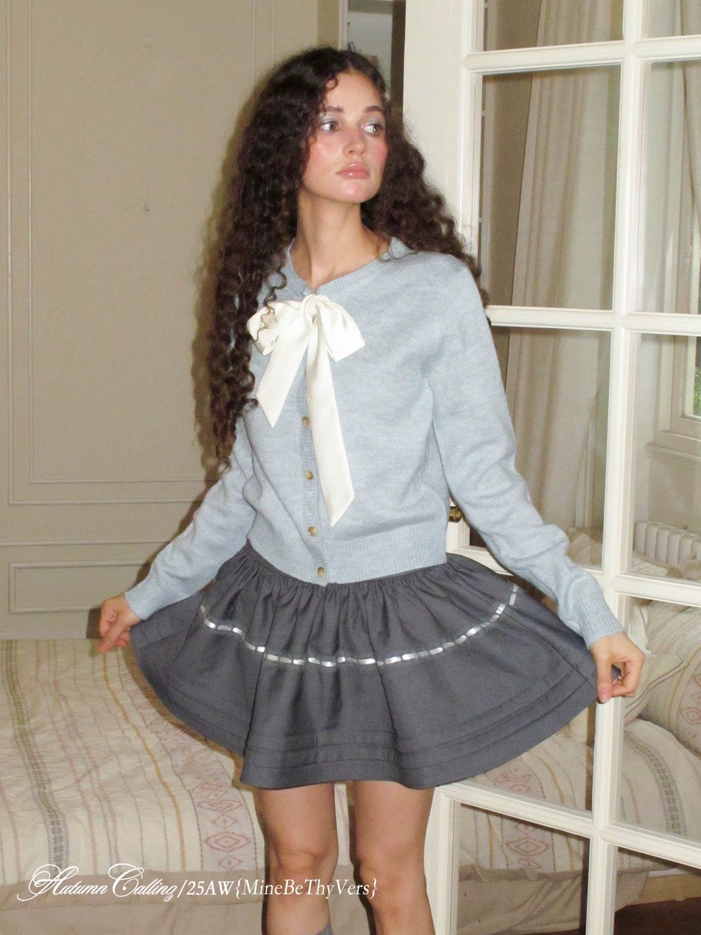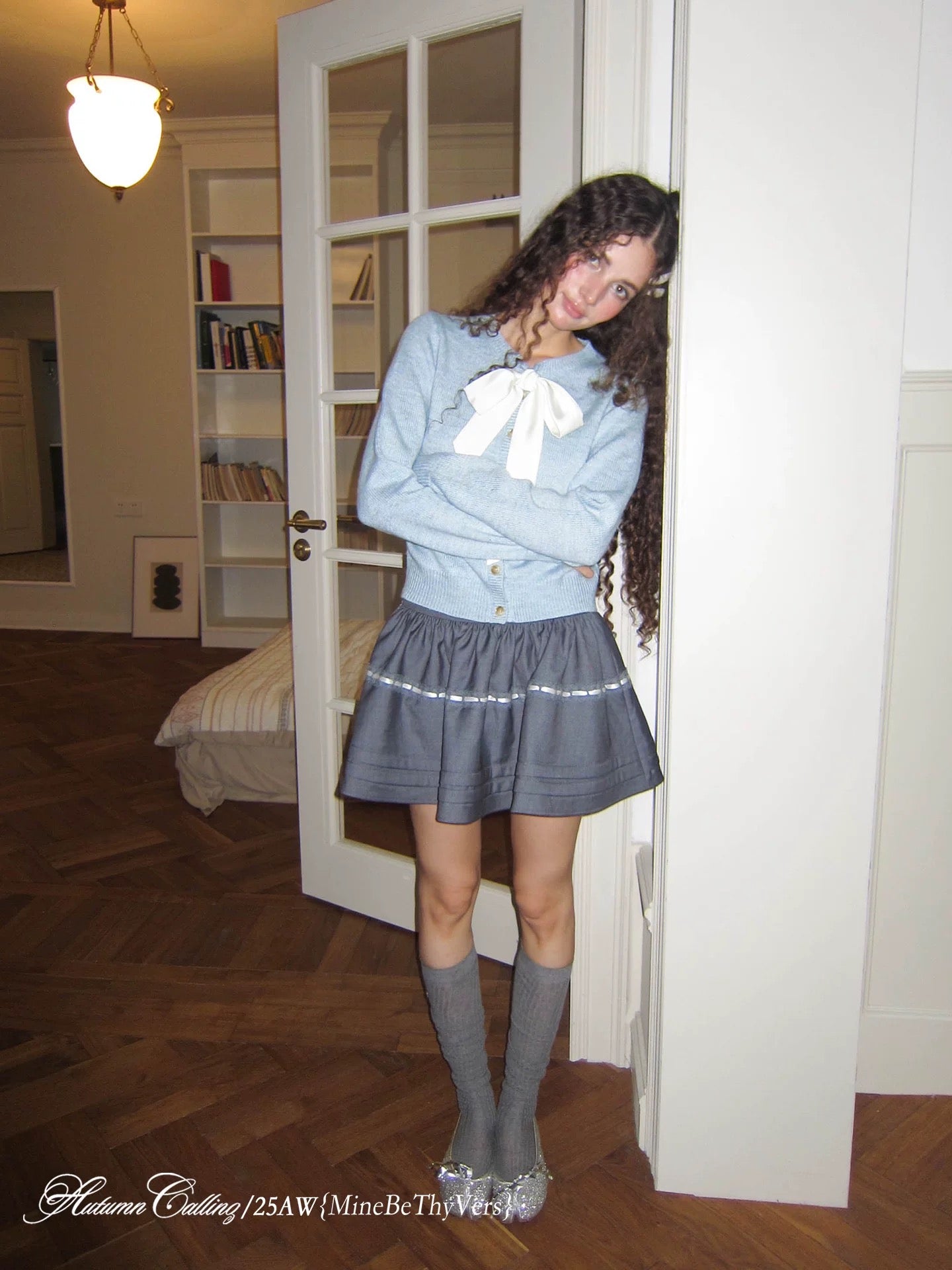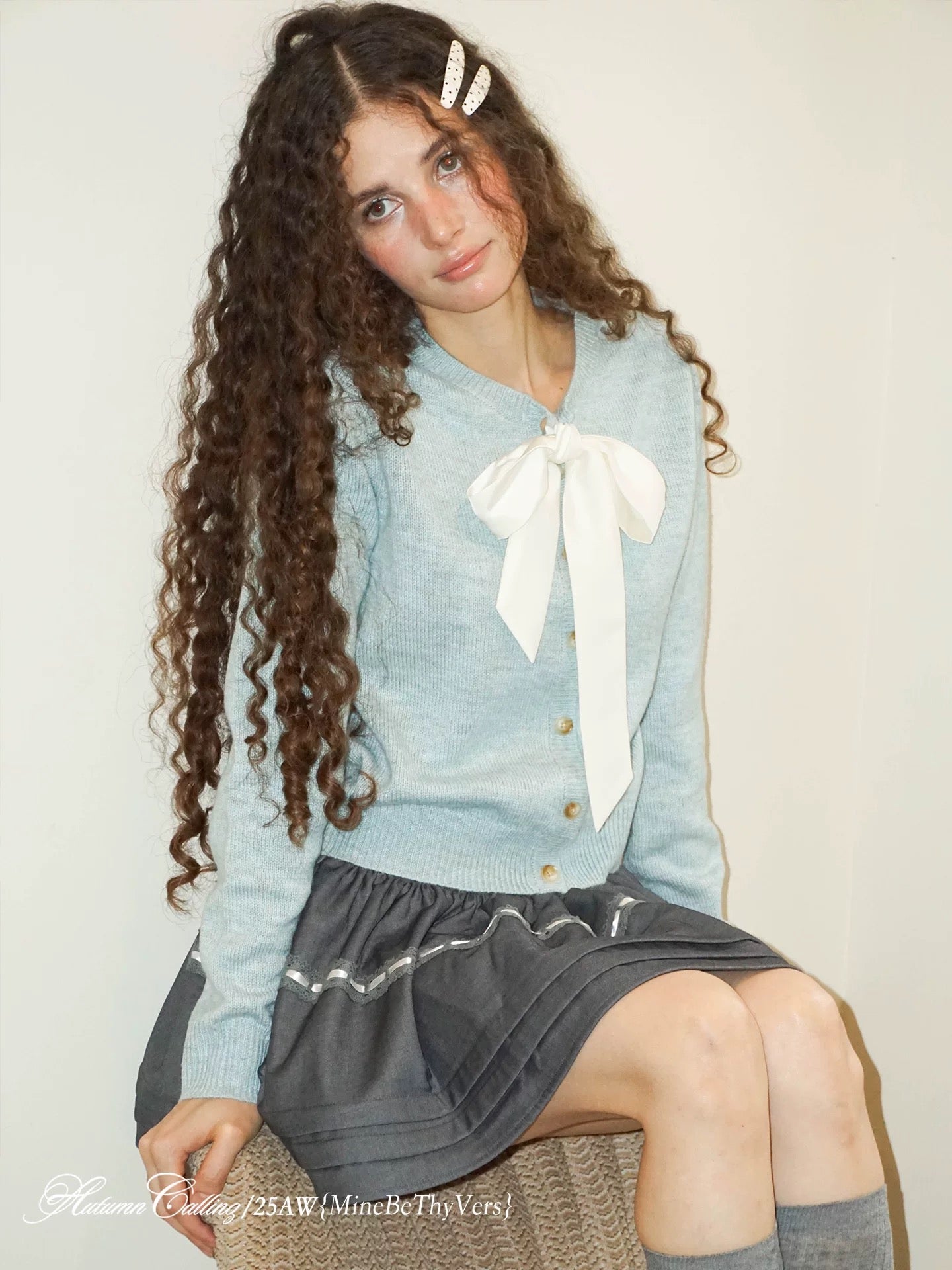 Soft as a snowflakes in winter wonderland — this pastel blue cardigan wraps you in gentle warmth and quiet elegance. The satin ribbon bow ties delicately at the collar, adding a touch of dreamy femininity to the relaxed wool-blend knit. Finished with gold-tone buttons and a slightly cropped silhouette, it pairs beautifully with pleated skirts or wool shorts for that classic MineBeThyVers charm.