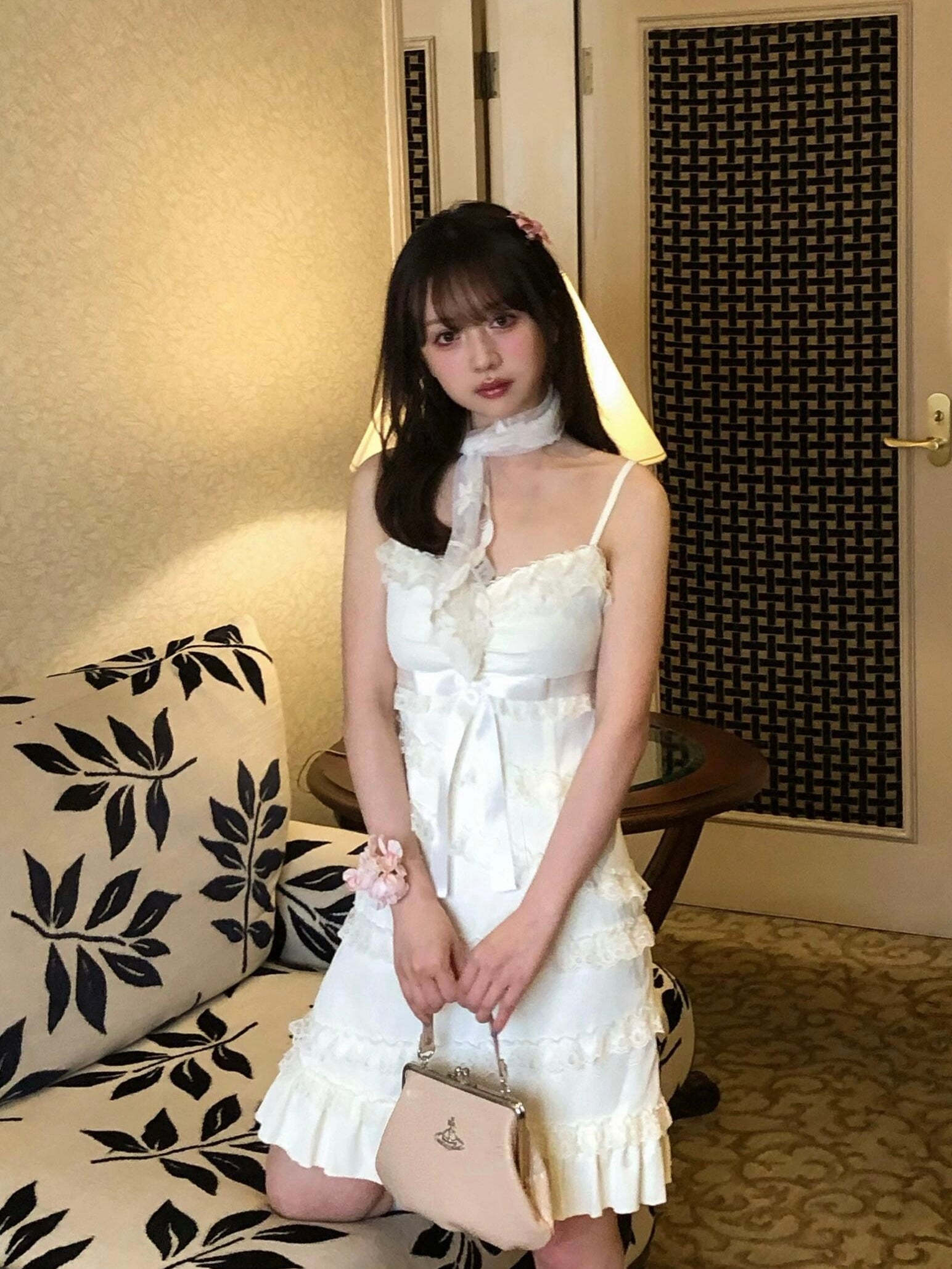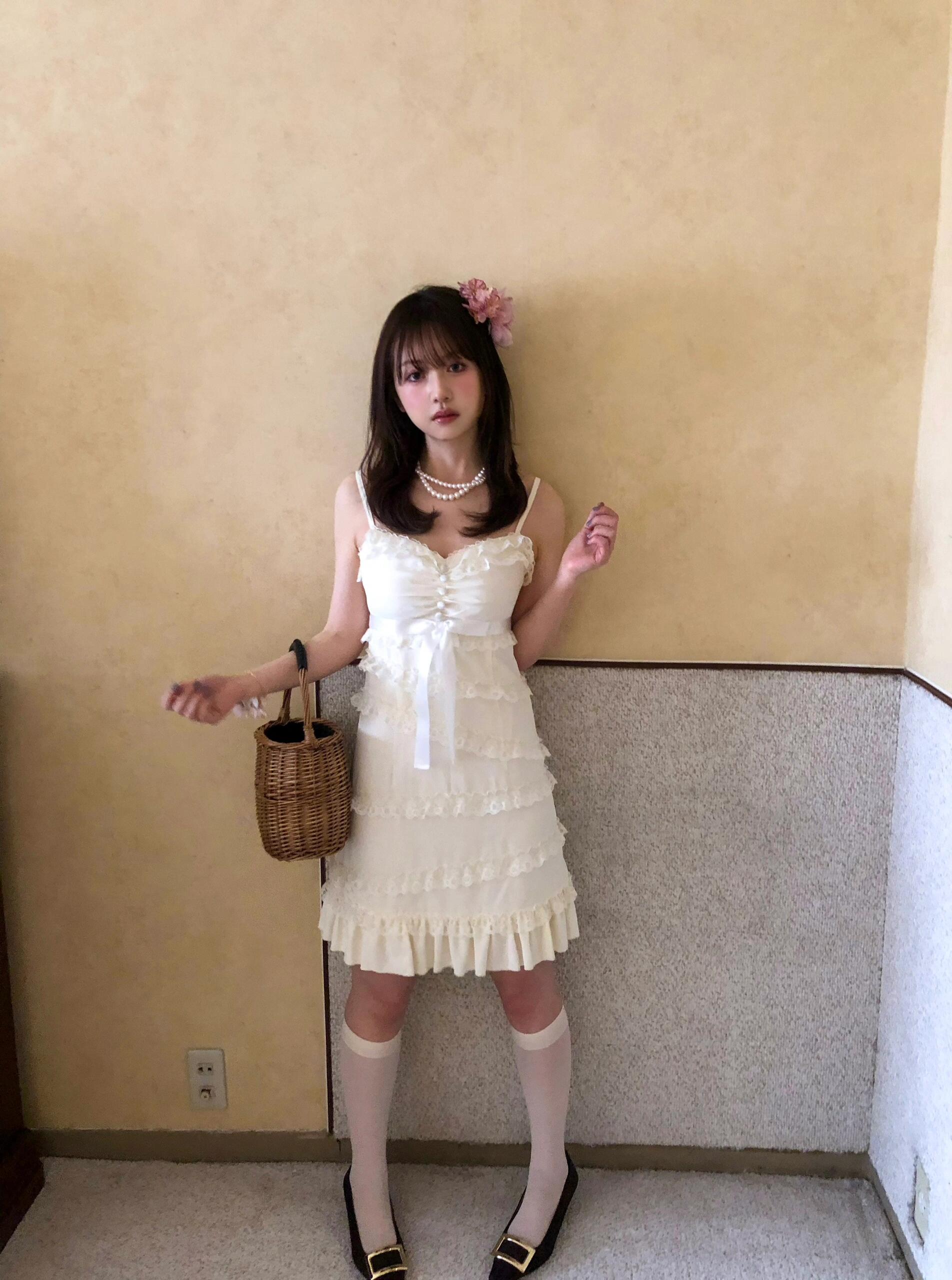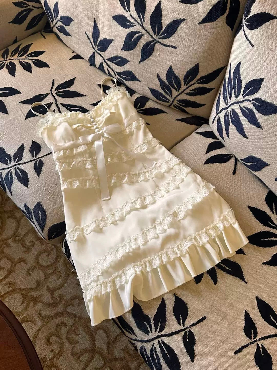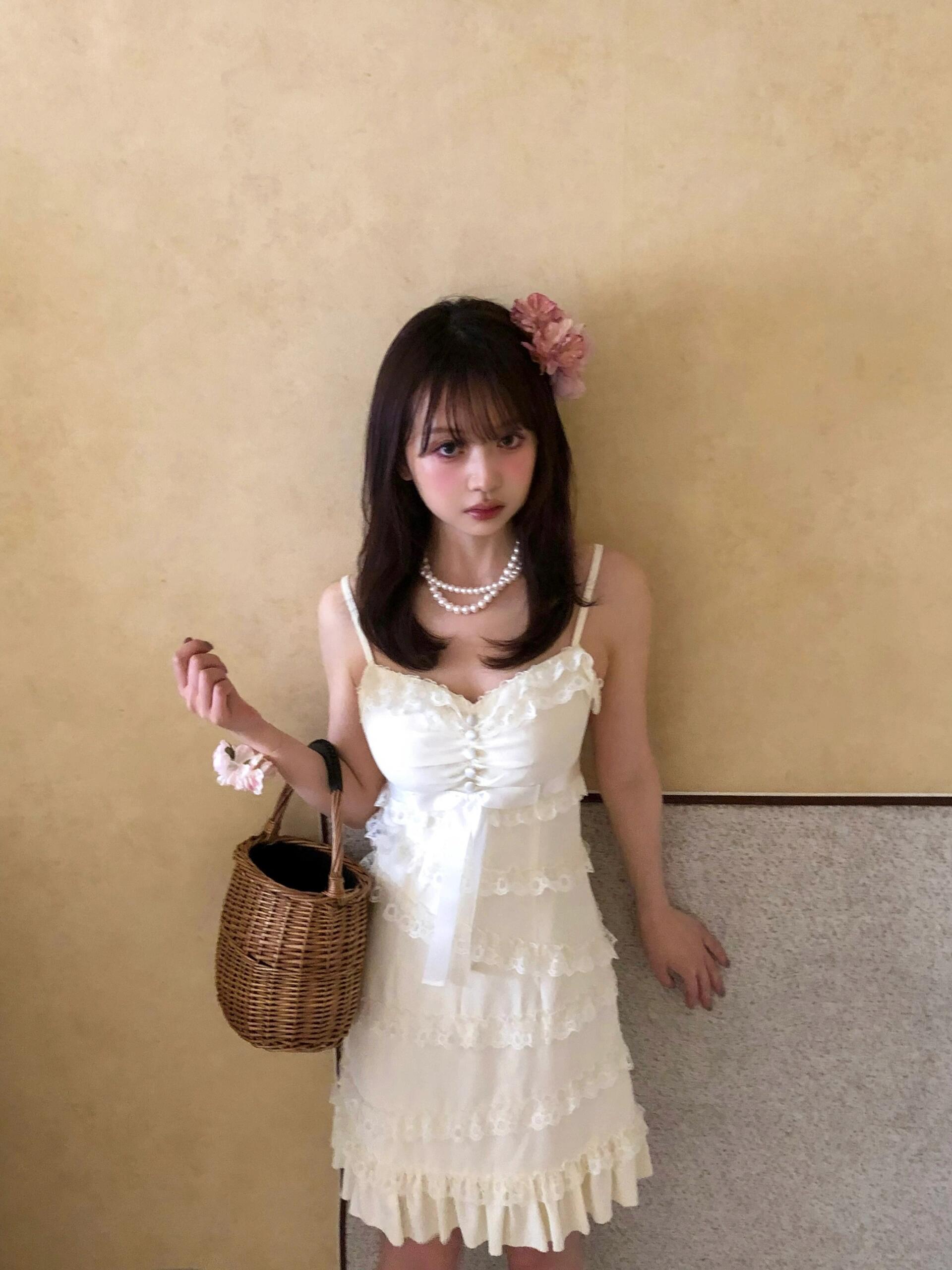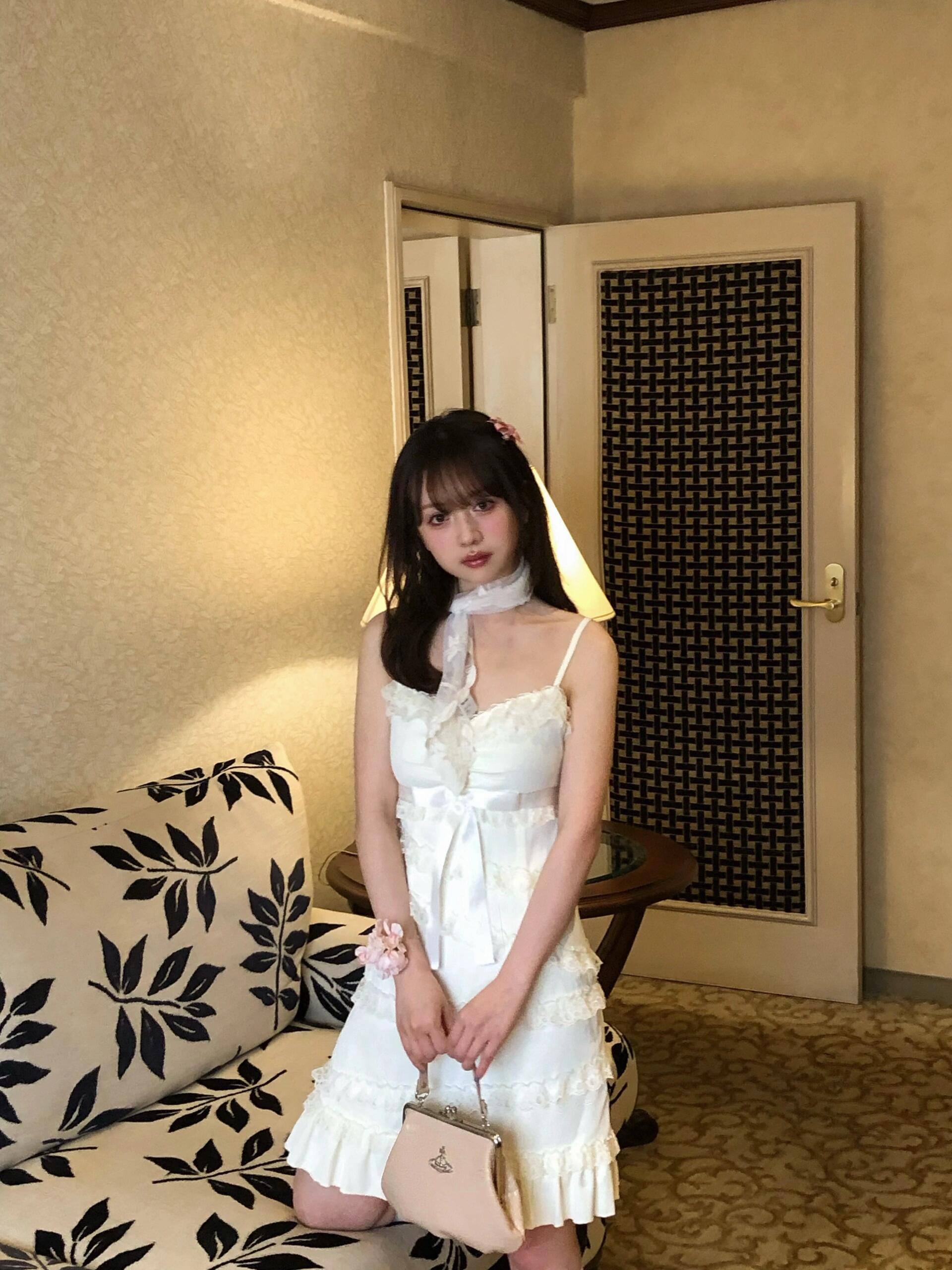 スカート部分のアシンメトリーなレースのディテールが、ドレスに「キュートな小さなケーキ」のような雰囲気を添え、完璧な仕上げを演出しています。ヴィンテージのレースショールを合わせると、プリンセスのような雰囲気さえ漂い、ノスタルジックでロマンチックな魅力を自然に表現しています。