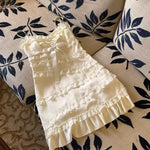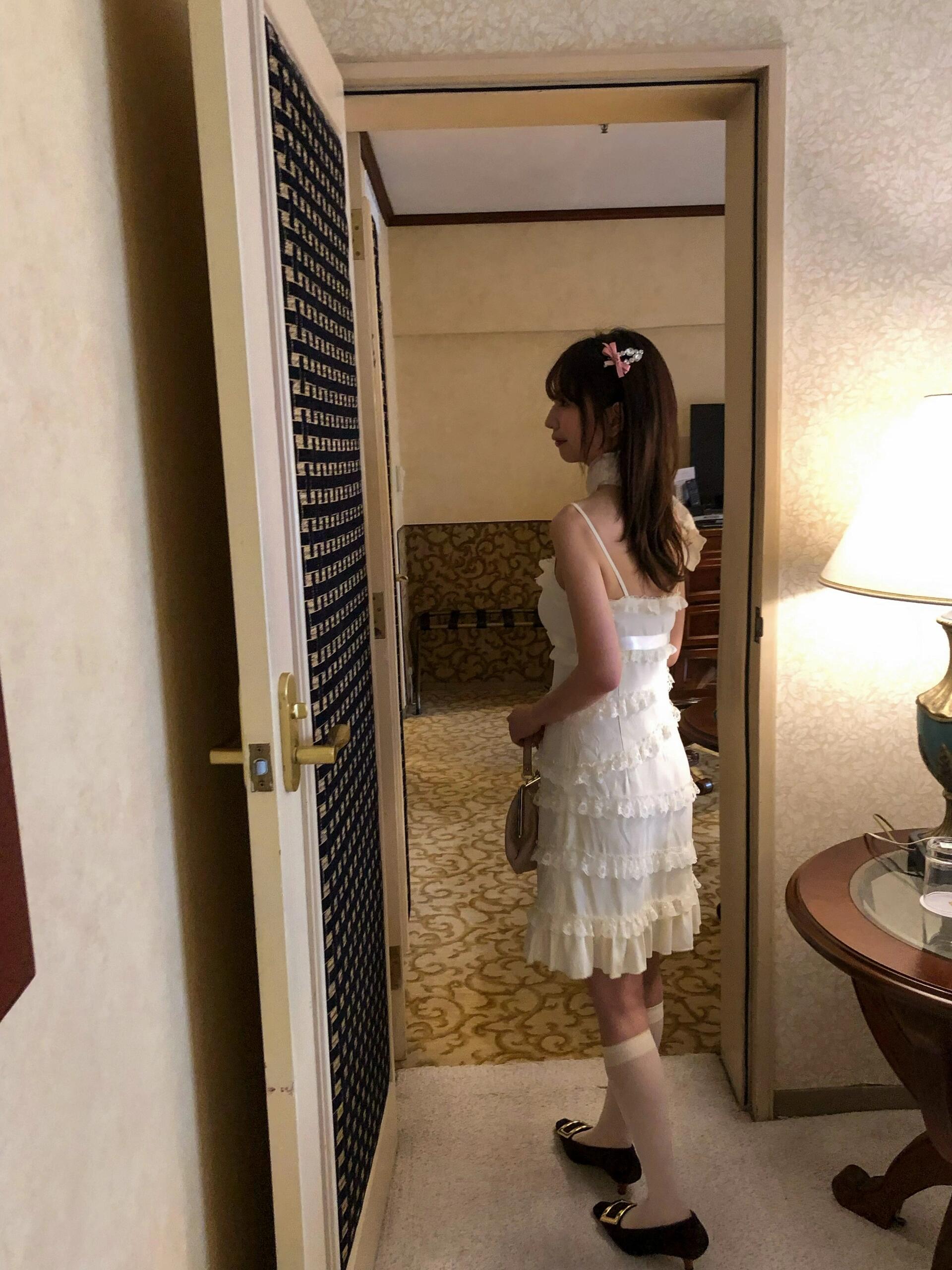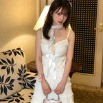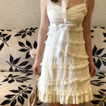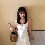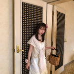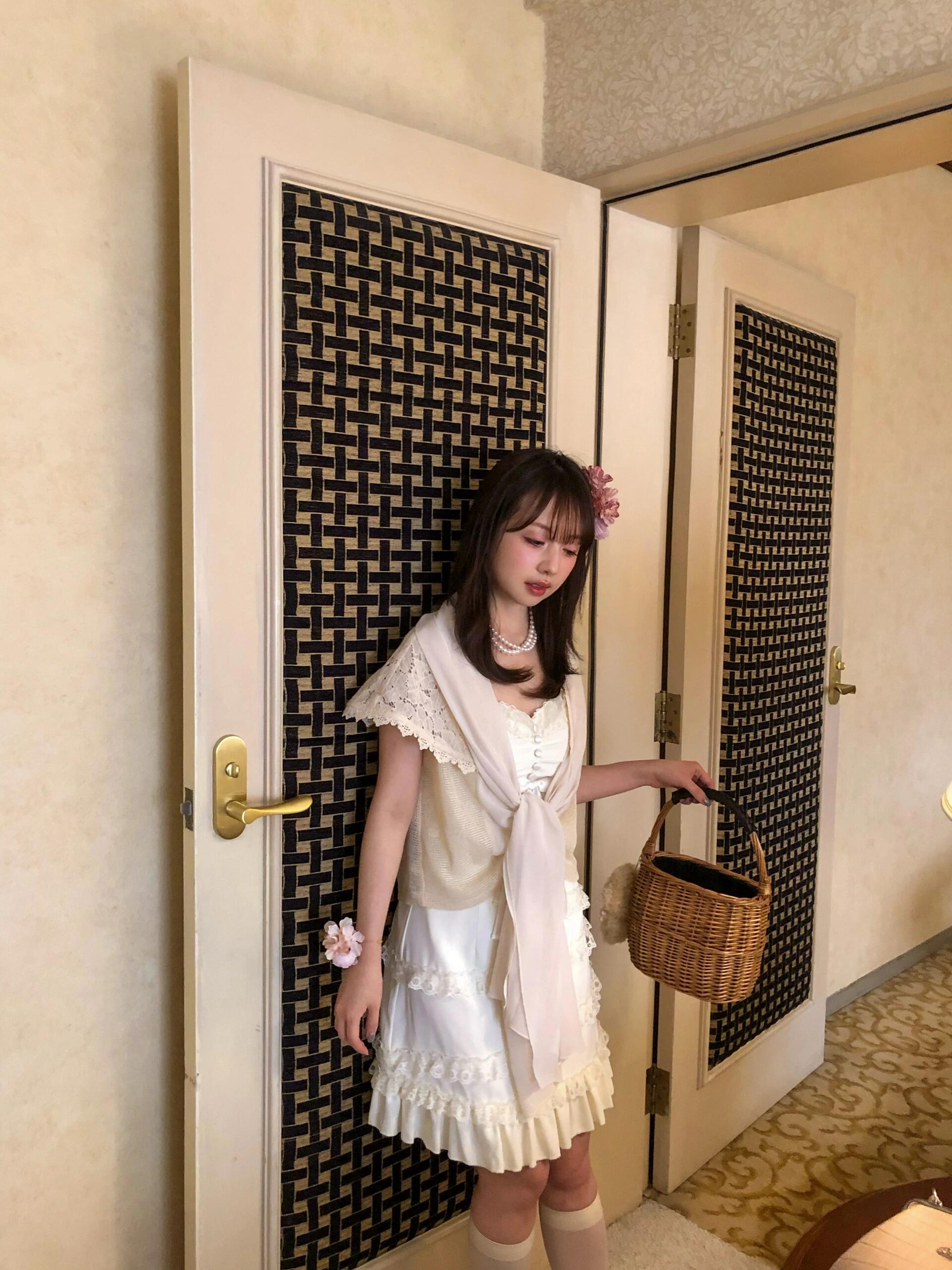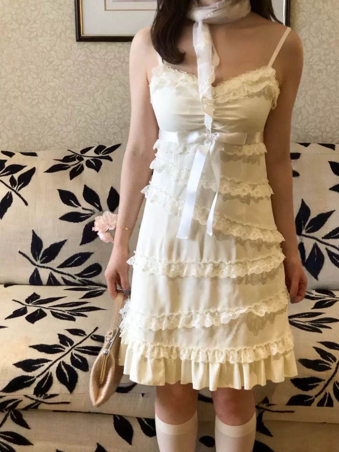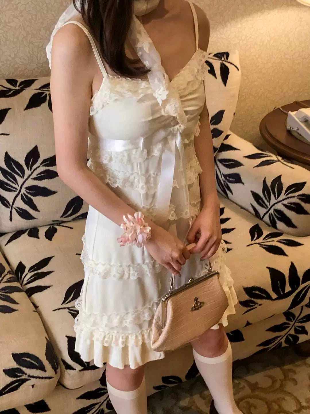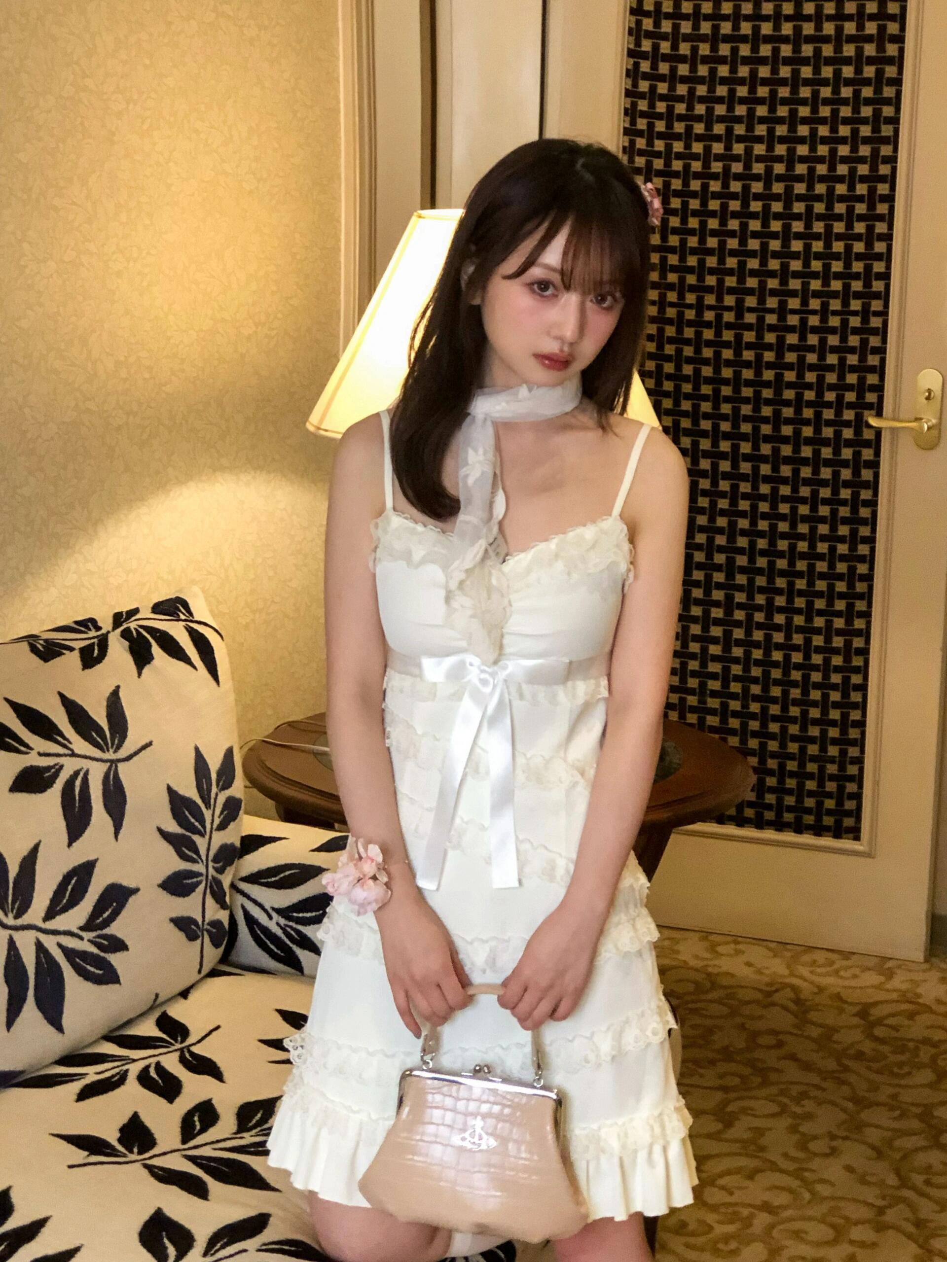 スカート部分のアシンメトリーなレースのディテールが、ドレスに「キュートな小さなケーキ」のような雰囲気を添え、完璧な仕上げを演出しています。ヴィンテージのレースショールを合わせると、プリンセスのような雰囲気さえ漂い、ノスタルジックでロマンチックな魅力を自然に表現しています。
