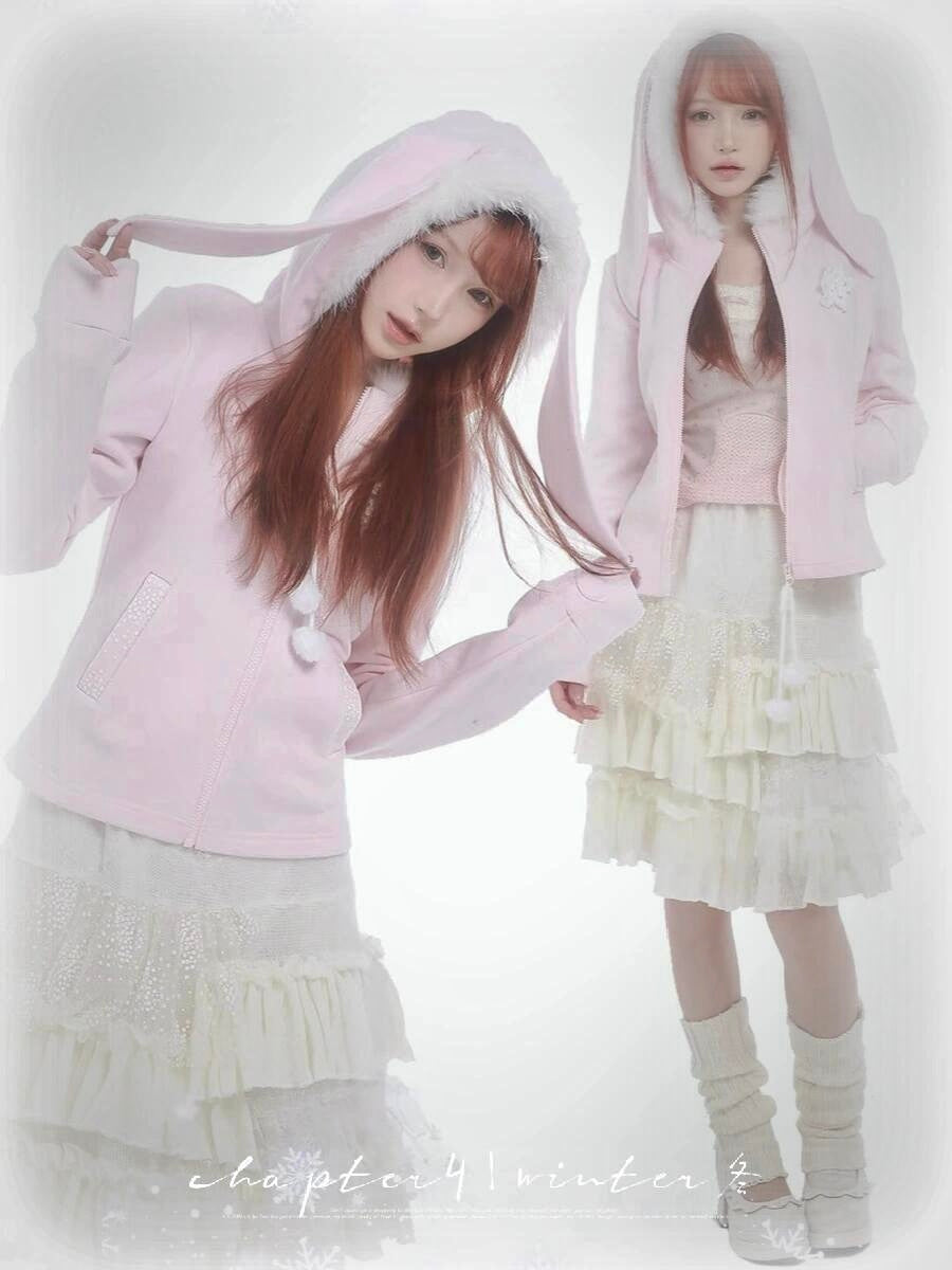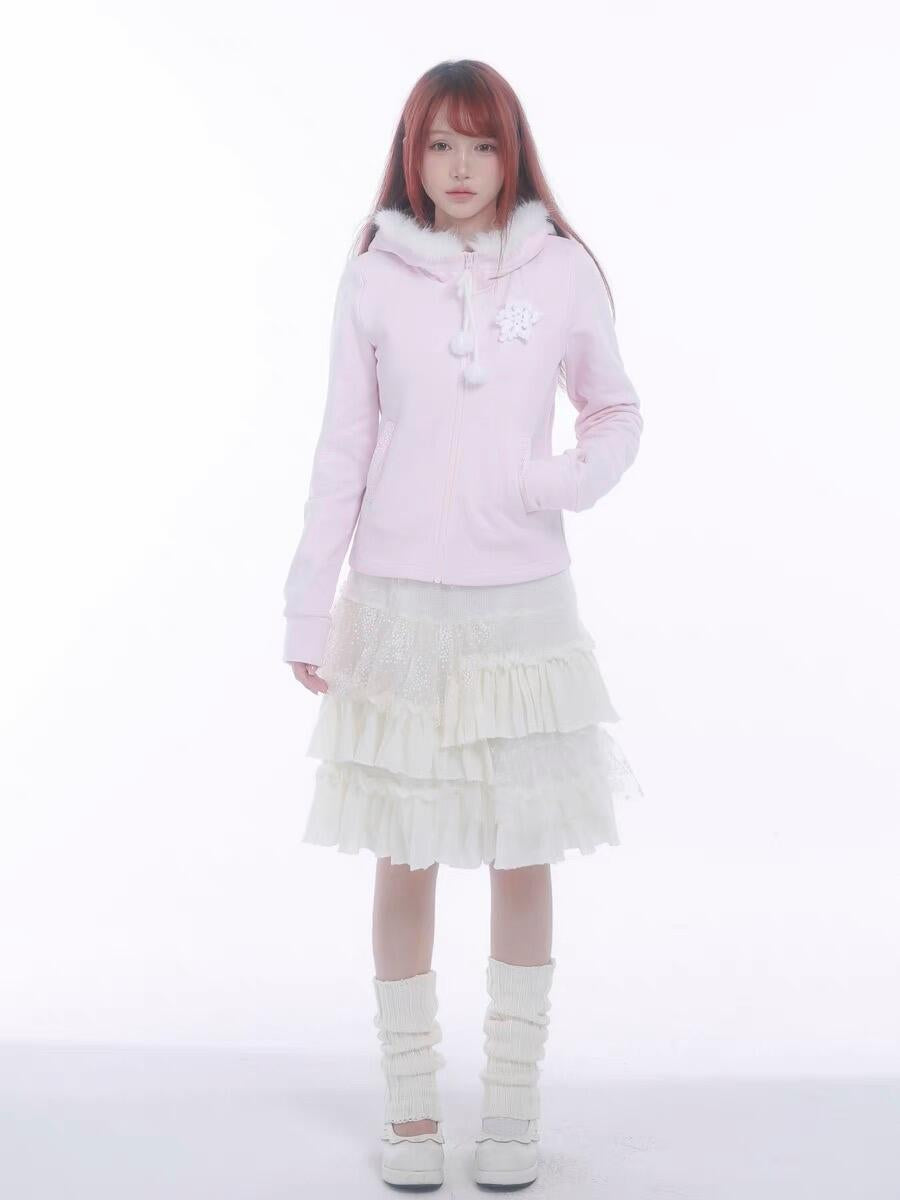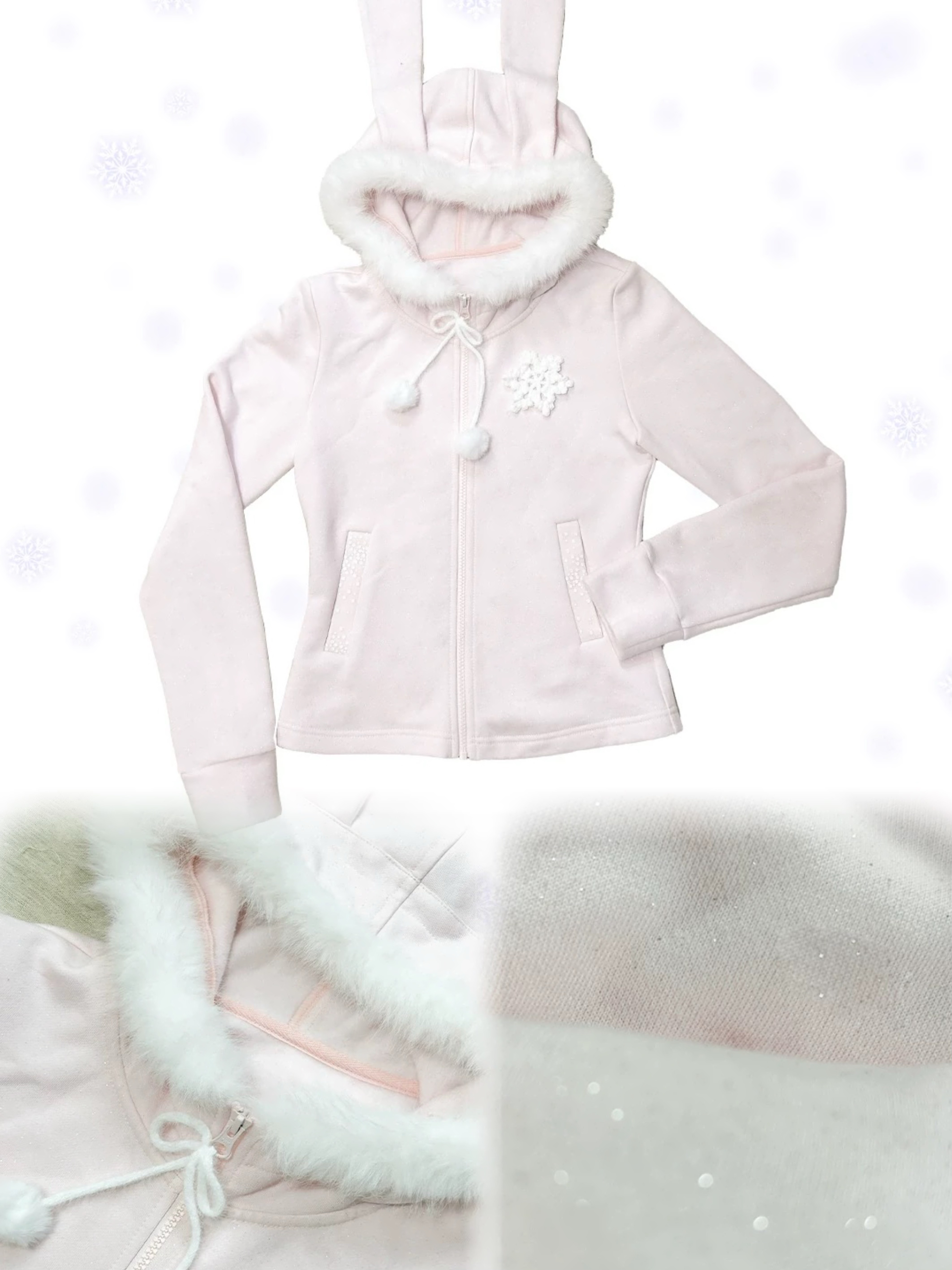 光が当たると、生地全体がキラキラと輝く小さなスパンコールで覆われ、初雪の後の雪の結晶のようにきらめきます。胸元のクロシェ編みの雪の結晶と、ファスナーのリボンポンポンが、さらに温かみのある冬の雰囲気を添えています。