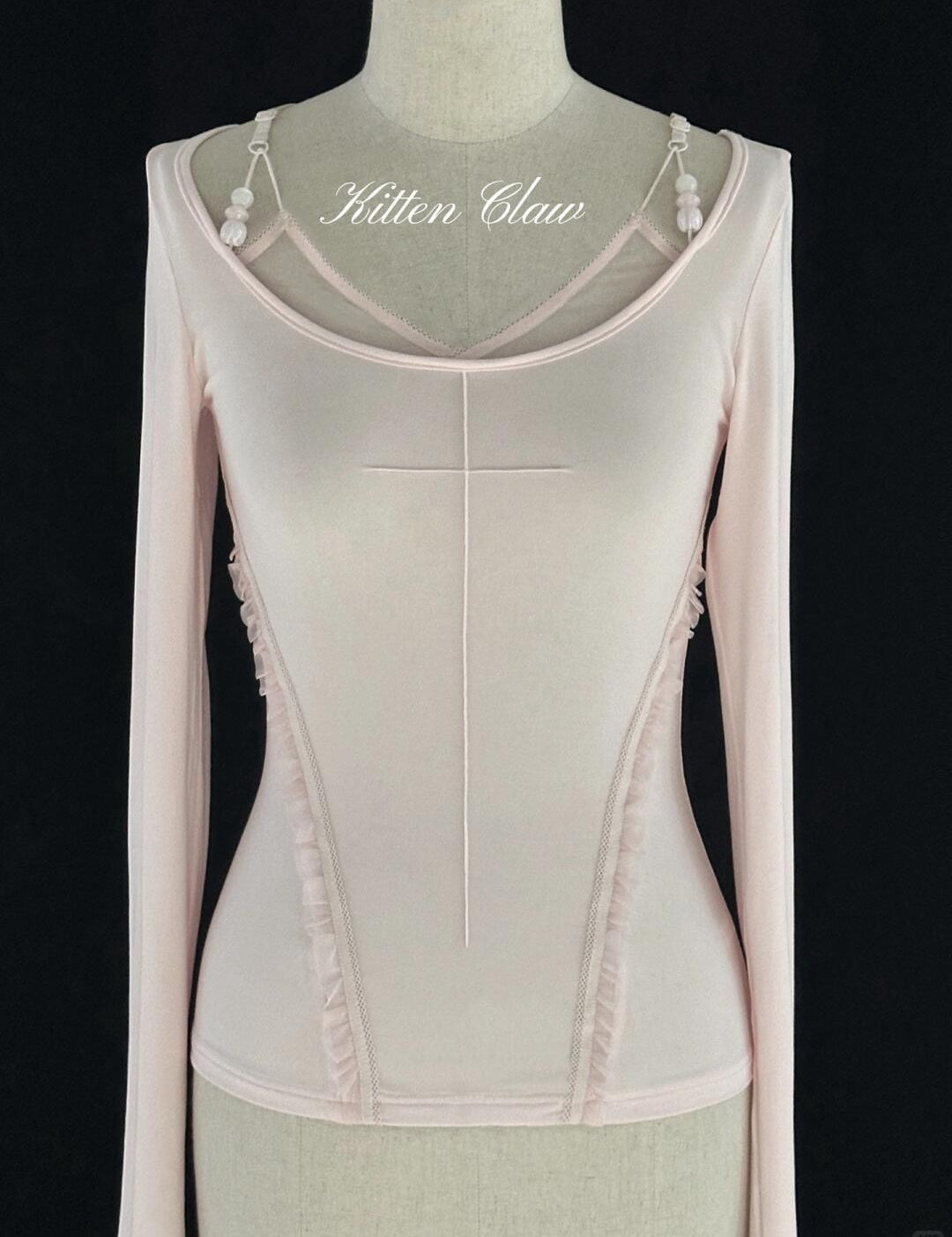 Woman wearing KittenClaw White Dream Cross Set with a sheer top and ruffled skirt in a vintage room.
