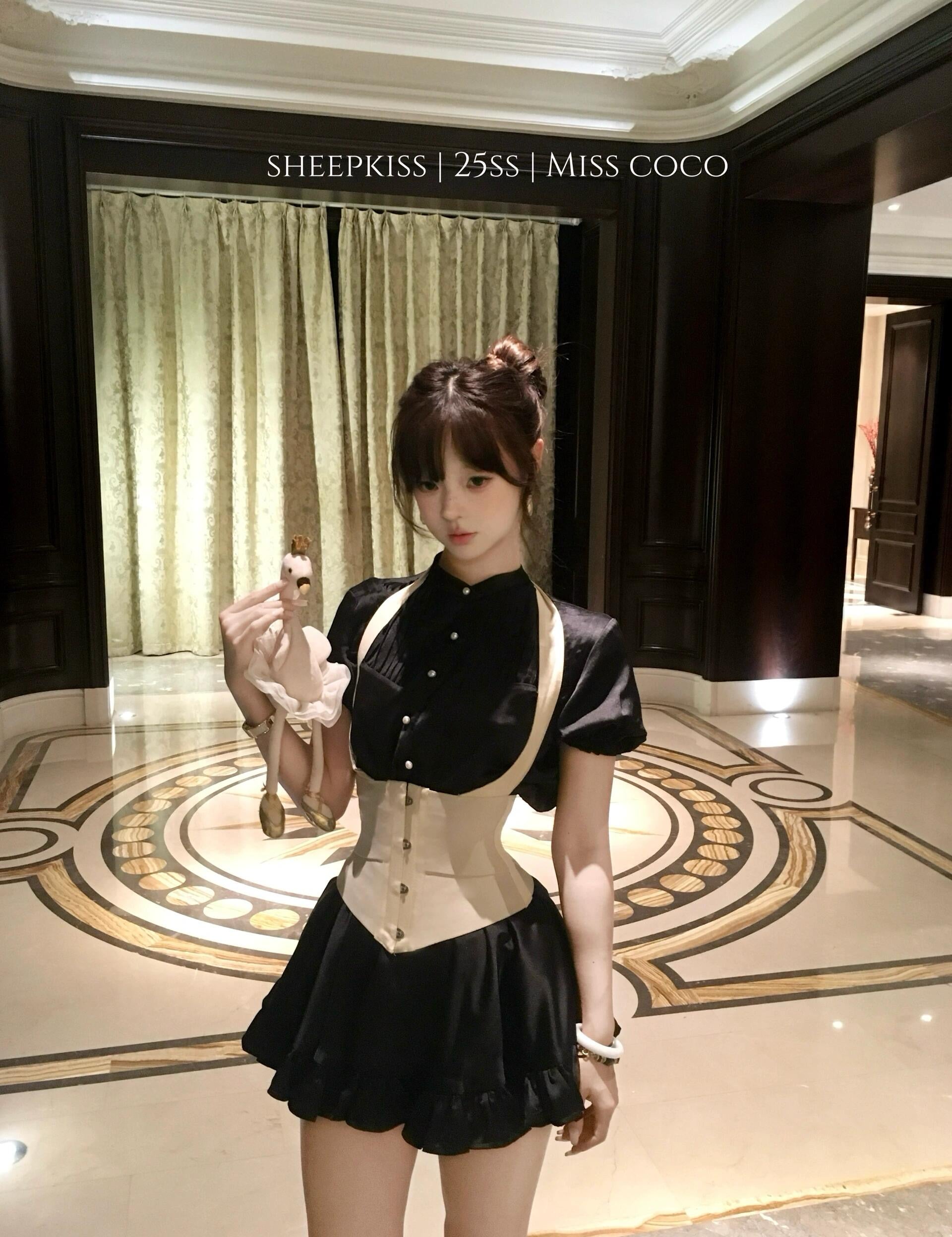 SheepKiss Miss Coco Black Satin Shirt and Skirt Set