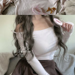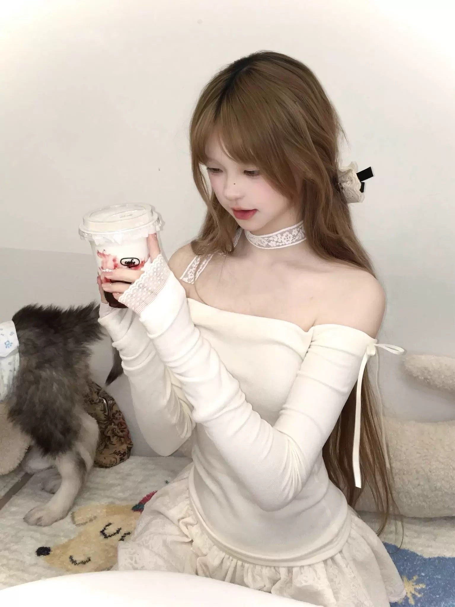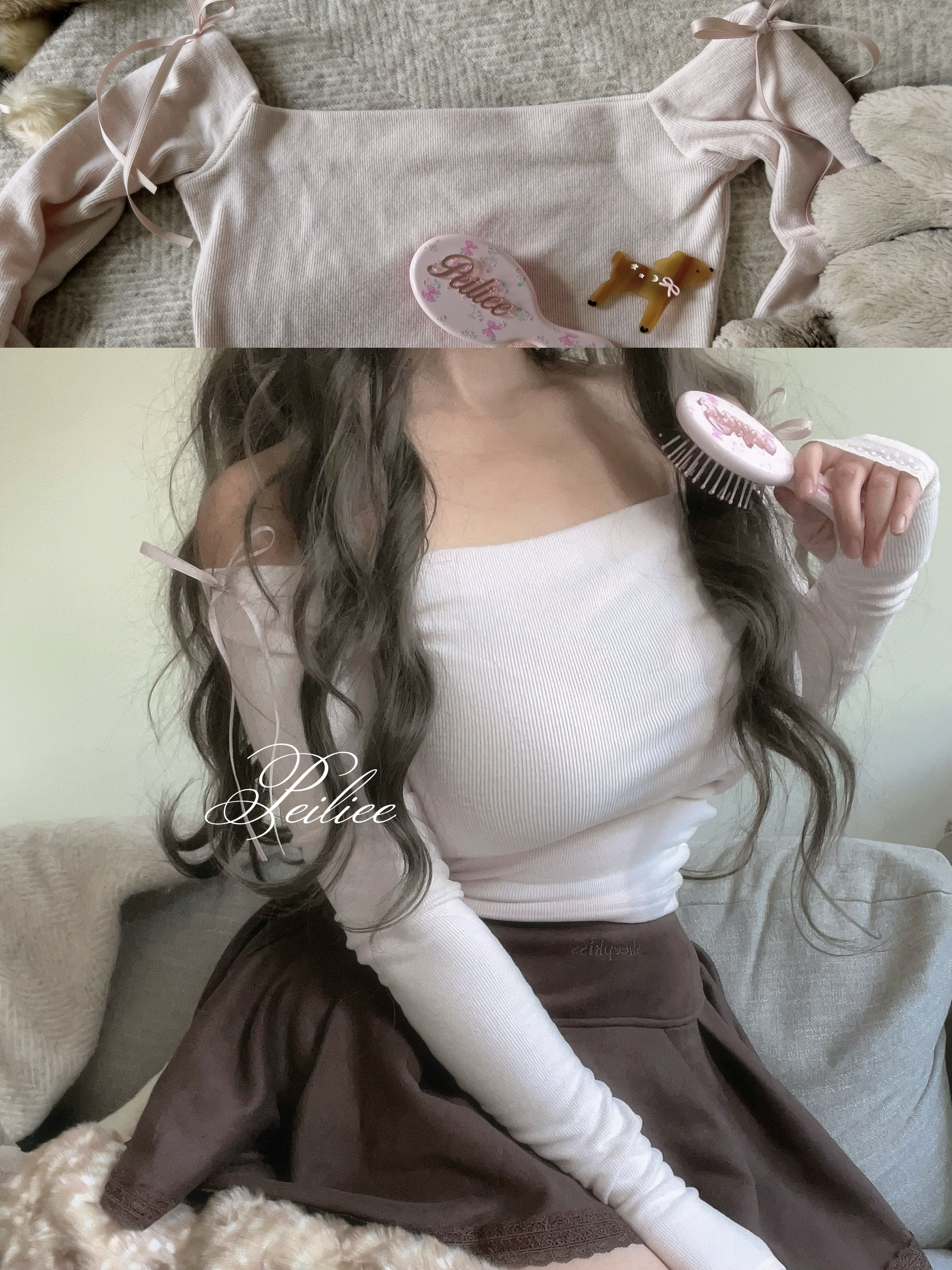まさにコケットコアの夢。極上のストレッチ性を誇るフランネルトップスは、まるで温かい抱擁のように肌に溶け込みます。繊細なリブ編みの質感が、エフォートレスにボディラインを美しく整え、あらゆる動きを柔らかくフェミニンに演出します。マット仕上げのリボンが肩を美しく彩り、透け感のあるドット柄レースの袖口が、ヴィンテージ感あふれるロマンスを添えます。素材は?焼きたてのスフレをイメージしてみてください。ふわふわでエアリー、そしてとびきり柔らかな生地です。暖かさを保ちながら、自然なボディラインを美しく見せるようデザインされたこのトップスは、重ね着にも、単体でも活躍する完璧な一枚です。