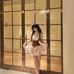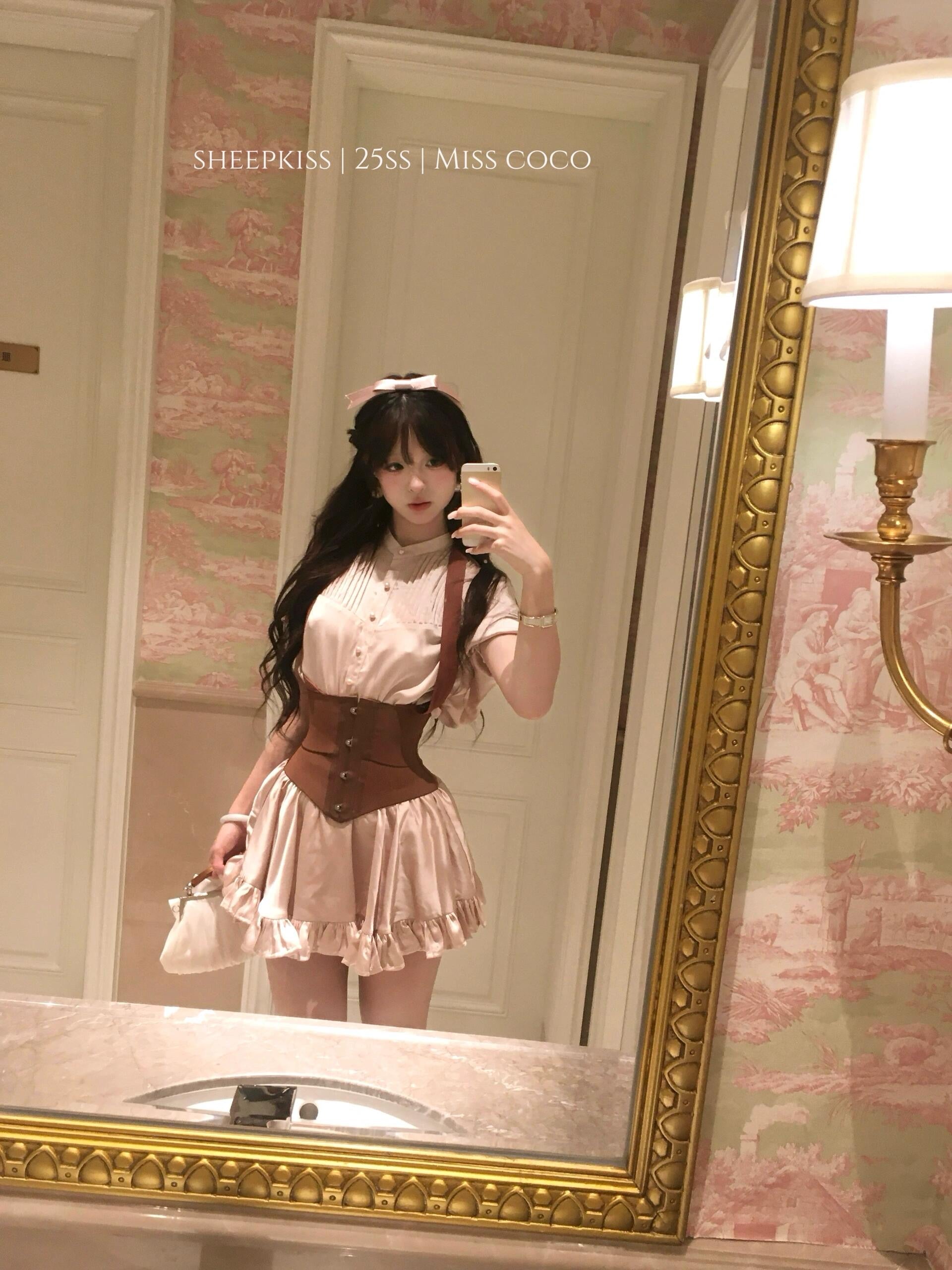 The top features delicate pleating and a refined mandarin collar, paired with pearl buttons for a touch of noble charm. The peplum waistline gently flares, enhancing the silhouette with a playful yet polished feel. The skirt’s built-in lace-trimmed safety shorts add both security and sweetness, blooming out like a little cupcake when you twirl.