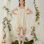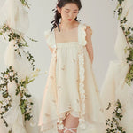水のようにドレープする、軽やかな質感の生地を使用したこのドレスは、サイドのルーシュで調節でき、お好みのシルエットにアレンジできます。ストラップとウエストには繊細な花のアップリケがあしらわれ、さりげなく詩的な魅力を添えています。