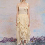 水のようにドレープする、軽やかな質感の生地を使用したこのドレスは、サイドのルーシュで調節でき、お好みのシルエットにアレンジできます。ストラップとウエストには繊細な花のアップリケがあしらわれ、さりげなく詩的な魅力を添えています。