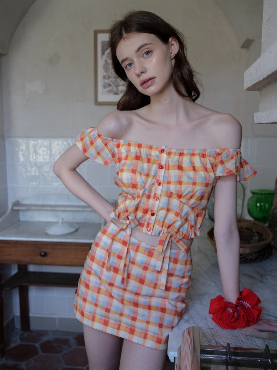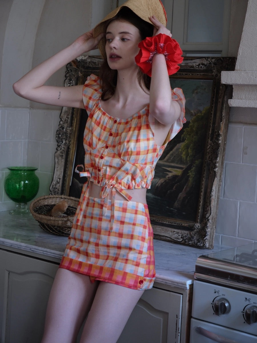 The irregular orange plaid print, perfectly matching the top, adds a sweet retro style that’s both charming and cute girly vibe