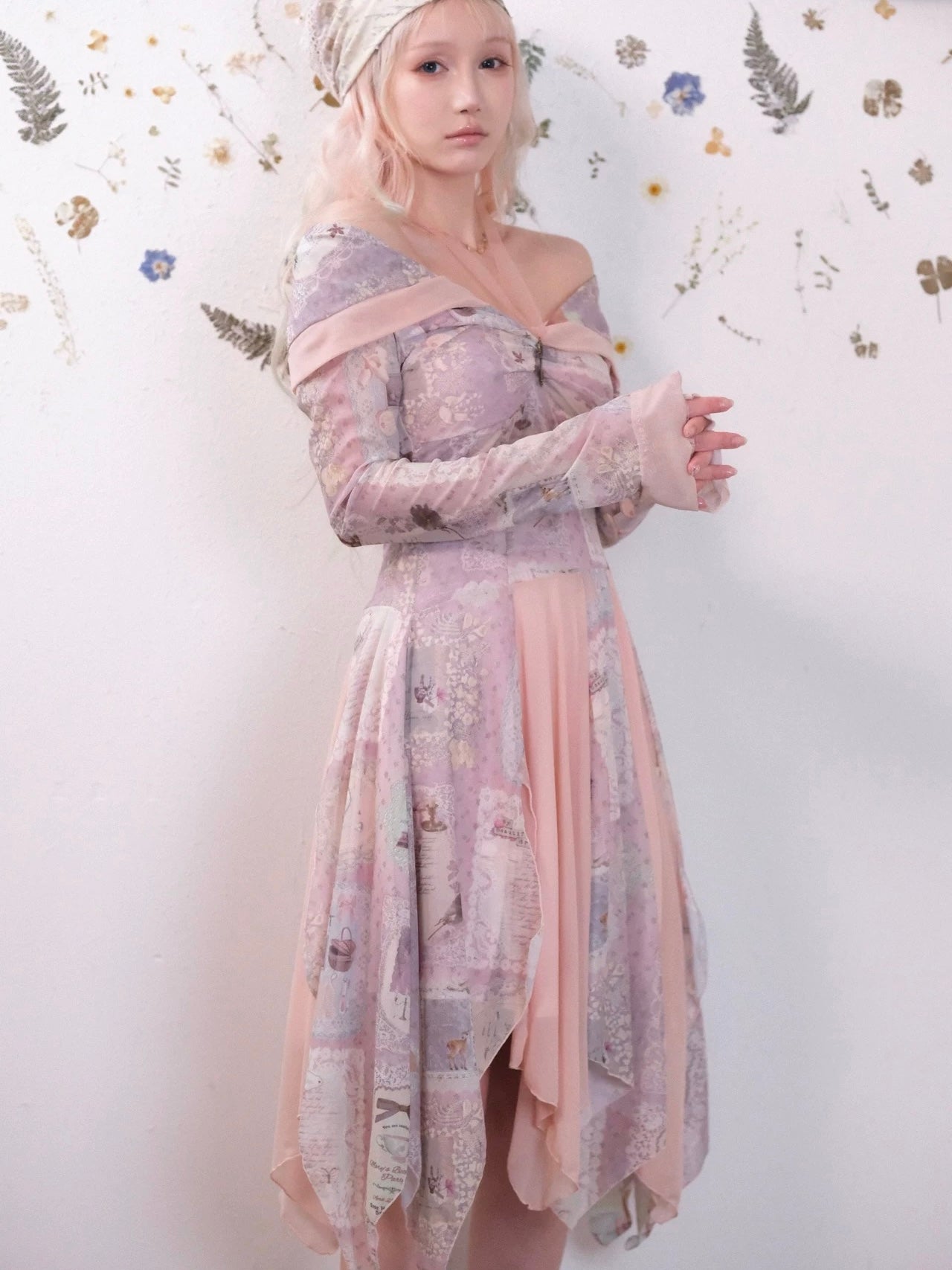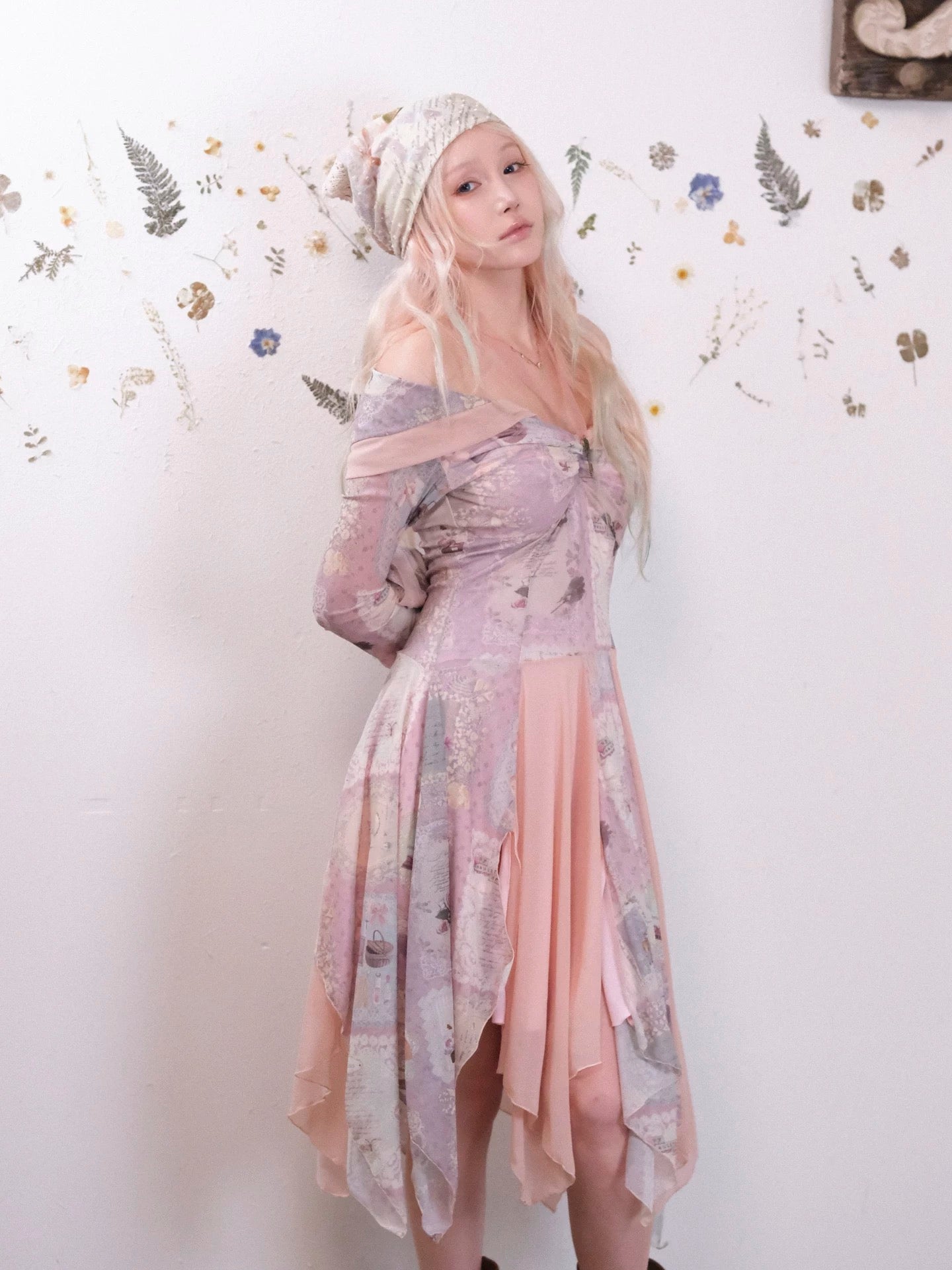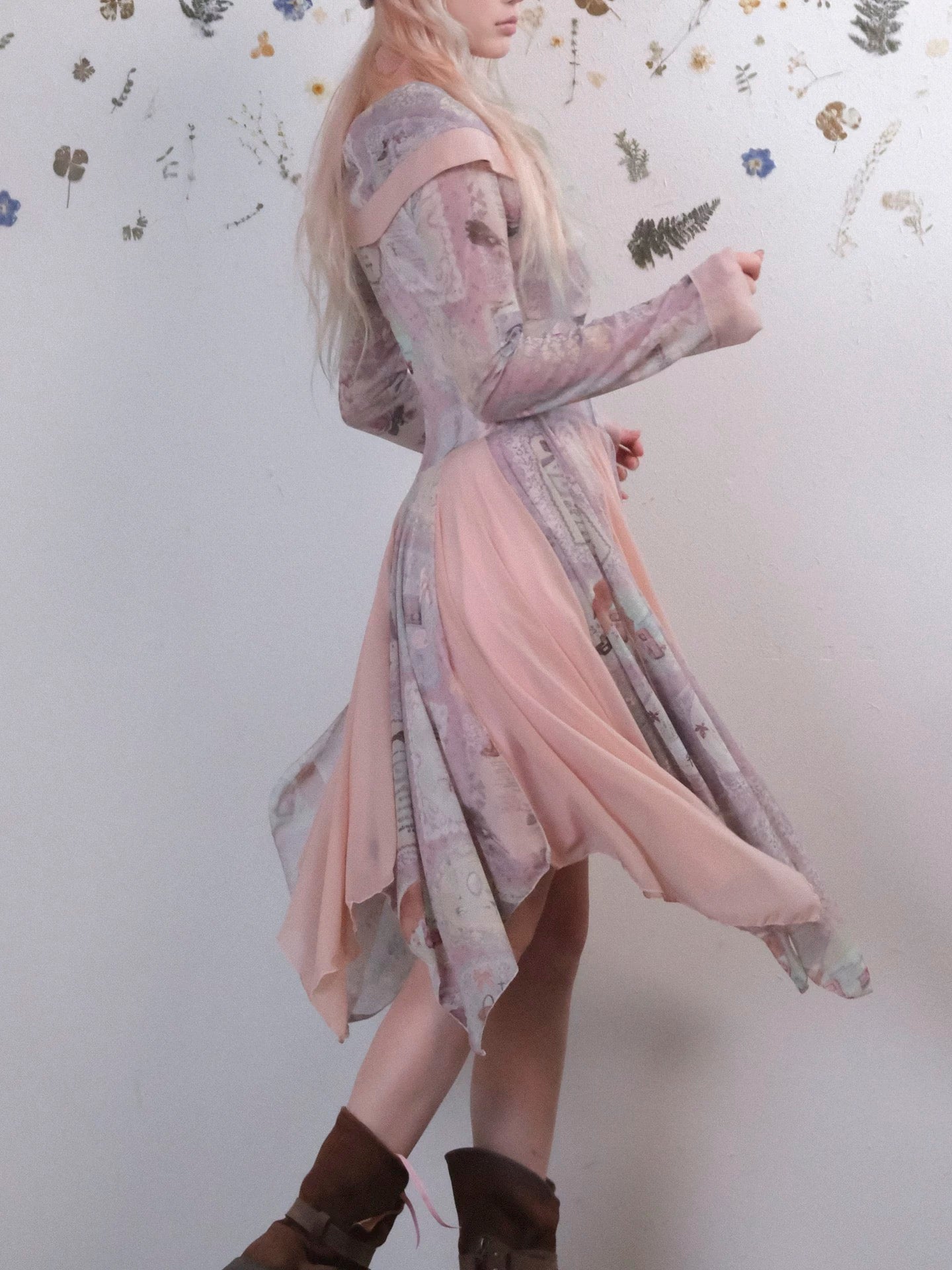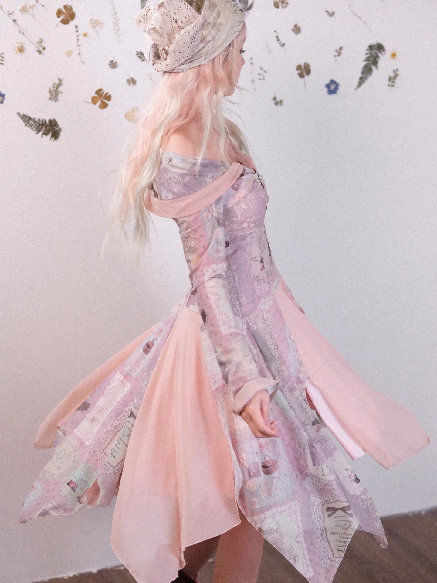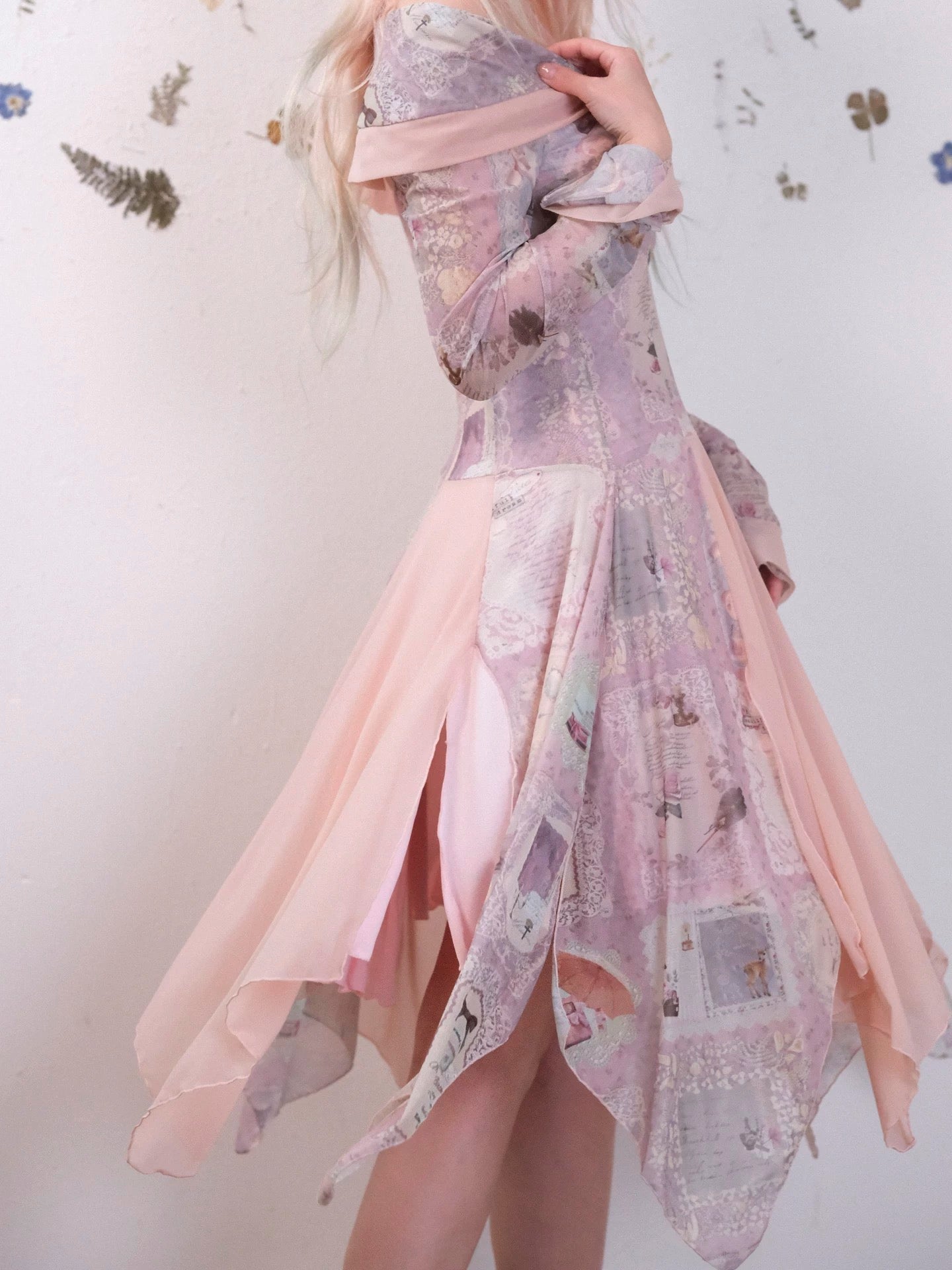 The asymmetrical hem and layered construction create a light, floating silhouette — like petals drifting through a quiet forest.
