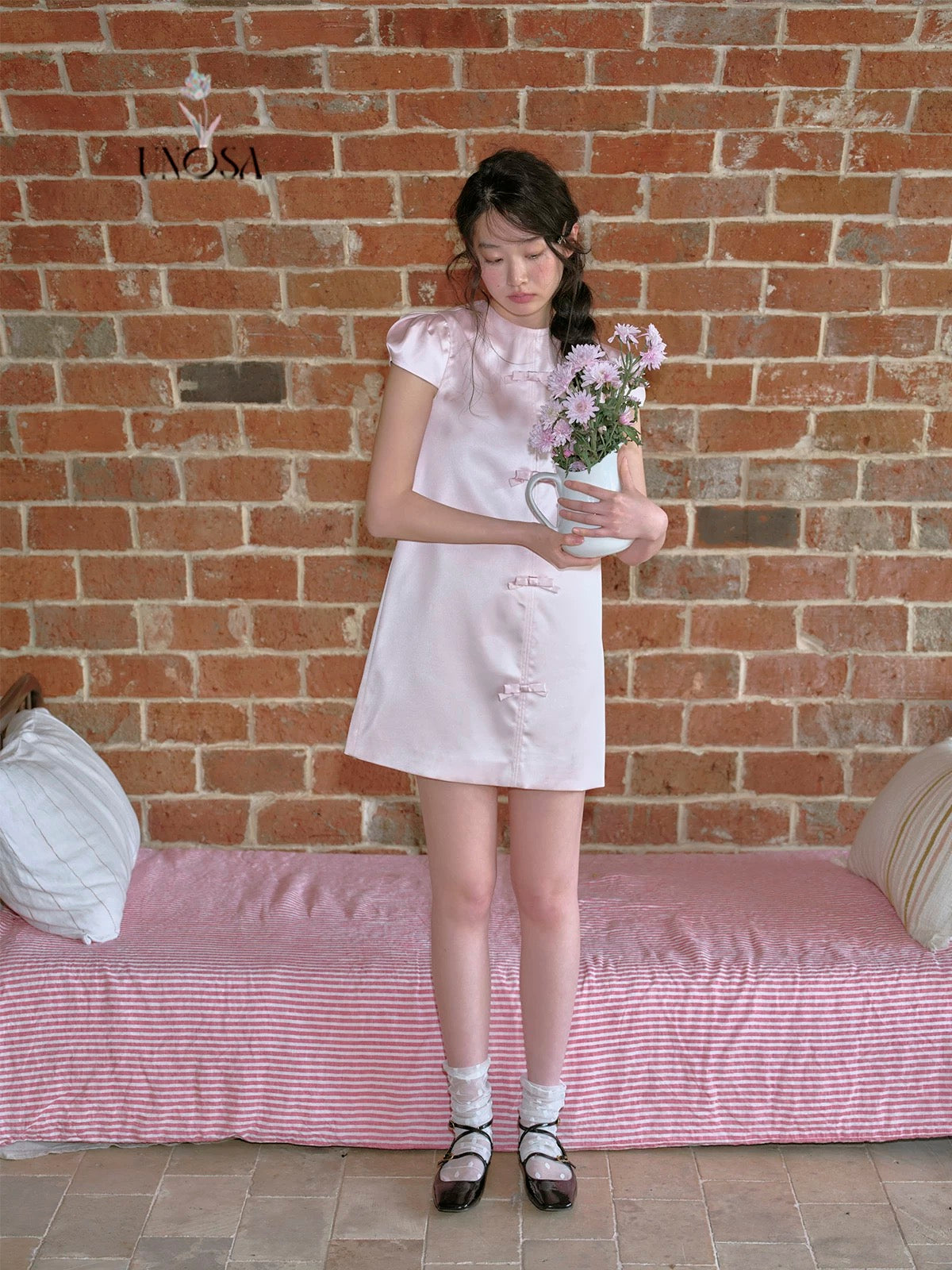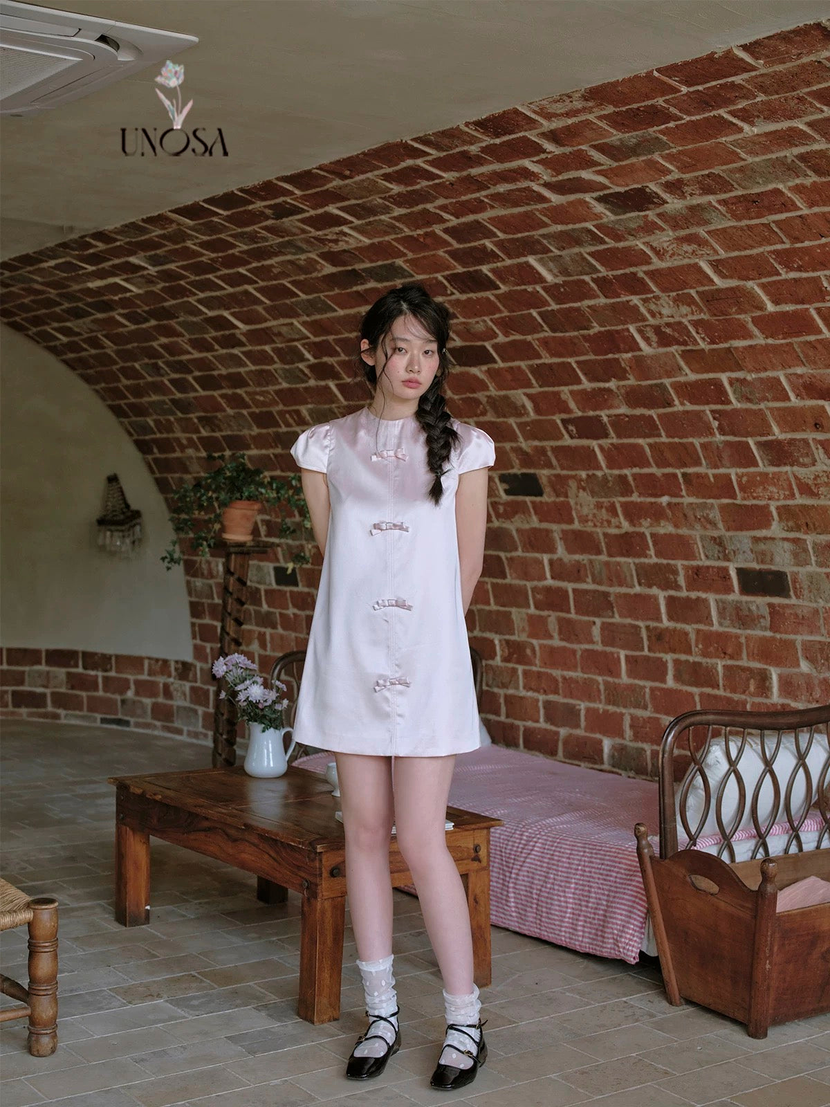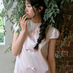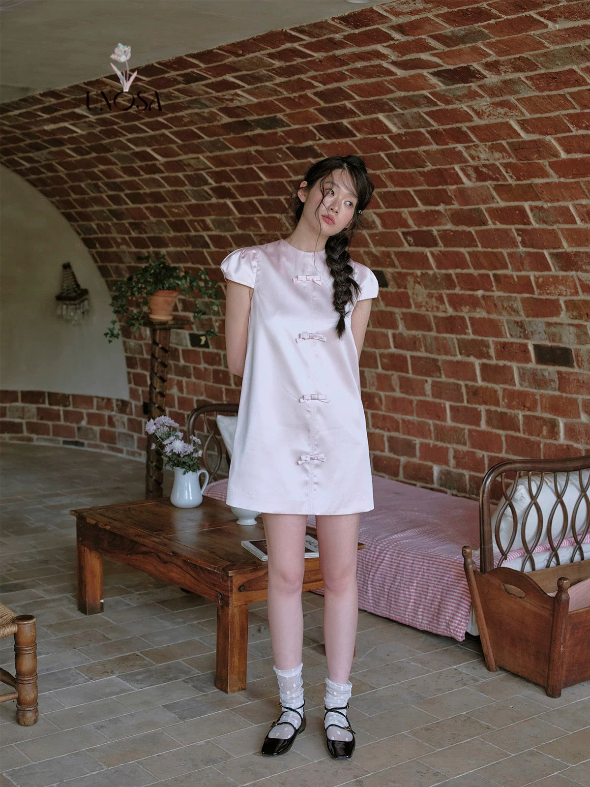 柔らかなパフスリーブと、チャイナドレス風のさりげないボタンディテールが特徴的なこのドレスは、ピクニックやガーデン散策、あるいはお家での素敵な気分転換にもぴったりです。レースソックスとメリージェーンシューズを合わせたり、ふんわりとしたイブニングルックにドレスアップしたり。シルクのしなやかな襞一つ一つに、若々しい優雅さがささやきます。